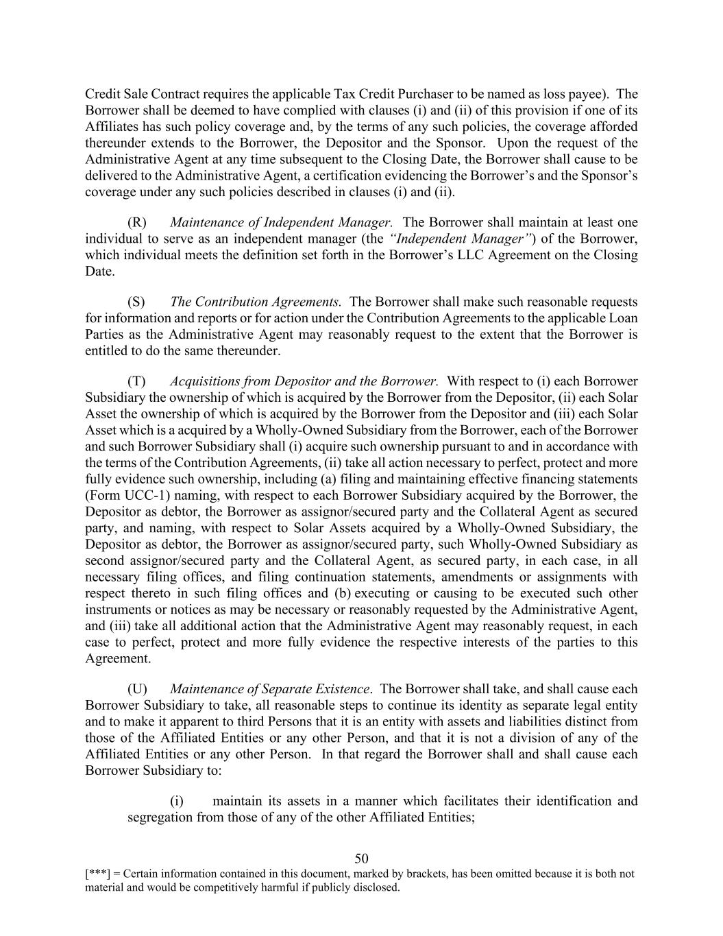 50 [***] = Certain information contained in this document, marked by brackets, has been omitted because it is both not material and would be competitively harmful if publicly disclosed. Credit Sale Contract requires the applicable Tax Credit Purchaser to be named as loss payee). The Borrower shall be deemed to have complied with clauses (i) and (ii) of this provision if one of its Affiliates has such policy coverage and, by the terms of any such policies, the coverage afforded thereunder extends to the Borrower, the Depositor and the Sponsor. Upon the request of the Administrative Agent at any time subsequent to the Closing Date, the Borrower shall cause to be delivered to the Administrative Agent, a certification evidencing the Borrower’s and the Sponsor’s coverage under any such policies described in clauses (i) and (ii). (R) Maintenance of Independent Manager. The Borrower shall maintain at least one individual to serve as an independent manager (the “Independent Manager”) of the Borrower, which individual meets the definition set forth in the Borrower’s LLC Agreement on the Closing Date. (S) The Contribution Agreements. The Borrower shall make such reasonable requests for information and reports or for action under the Contribution Agreements to the applicable Loan Parties as the Administrative Agent may reasonably request to the extent that the Borrower is entitled to do the same thereunder. (T) Acquisitions from Depositor and the Borrower. With respect to (i) each Borrower Subsidiary the ownership of which is acquired by the Borrower from the Depositor, (ii) each Solar Asset the ownership of which is acquired by the Borrower from the Depositor and (iii) each Solar Asset which is a acquired by a Wholly-Owned Subsidiary from the Borrower, each of the Borrower and such Borrower Subsidiary shall (i) acquire such ownership pursuant to and in accordance with the terms of the Contribution Agreements, (ii) take all action necessary to perfect, protect and more fully evidence such ownership, including (a) filing and maintaining effective financing statements (Form UCC-1) naming, with respect to each Borrower Subsidiary acquired by the Borrower, the Depositor as debtor, the Borrower as assignor/secured party and the Collateral Agent as secured party, and naming, with respect to Solar Assets acquired by a Wholly-Owned Subsidiary, the Depositor as debtor, the Borrower as assignor/secured party, such Wholly-Owned Subsidiary as second assignor/secured party and the Collateral Agent, as secured party, in each case, in all necessary filing offices, and filing continuation statements, amendments or assignments with respect thereto in such filing offices and (b) executing or causing to be executed such other instruments or notices as may be necessary or reasonably requested by the Administrative Agent, and (iii) take all additional action that the Administrative Agent may reasonably request, in each case to perfect, protect and more fully evidence the respective interests of the parties to this Agreement. (U) Maintenance of Separate Existence. The Borrower shall take, and shall cause each Borrower Subsidiary to take, all reasonable steps to continue its identity as separate legal entity and to make it apparent to third Persons that it is an entity with assets and liabilities distinct from those of the Affiliated Entities or any other Person, and that it is not a division of any of the Affiliated Entities or any other Person. In that regard the Borrower shall and shall cause each Borrower Subsidiary to: (i) maintain its assets in a manner which facilitates their identification and segregation from those of any of the other Affiliated Entities;