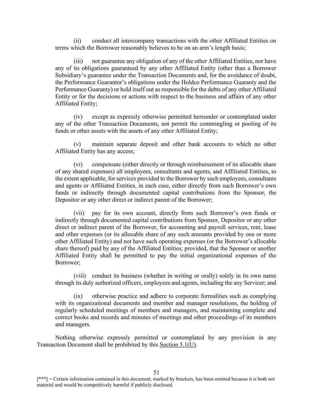 51 [***] = Certain information contained in this document, marked by brackets, has been omitted because it is both not material and would be competitively harmful if publicly disclosed. (ii) conduct all intercompany transactions with the other Affiliated Entities on terms which the Borrower reasonably believes to be on an arm’s length basis; (iii) not guarantee any obligation of any of the other Affiliated Entities, nor have any of its obligations guaranteed by any other Affiliated Entity (other than a Borrower Subsidiary’s guarantee under the Transaction Documents and, for the avoidance of doubt, the Performance Guarantor’s obligations under the Holdco Performance Guaranty and the Performance Guaranty) or hold itself out as responsible for the debts of any other Affiliated Entity or for the decisions or actions with respect to the business and affairs of any other Affiliated Entity; (iv) except as expressly otherwise permitted hereunder or contemplated under any of the other Transaction Documents, not permit the commingling or pooling of its funds or other assets with the assets of any other Affiliated Entity; (v) maintain separate deposit and other bank accounts to which no other Affiliated Entity has any access; (vi) compensate (either directly or through reimbursement of its allocable share of any shared expenses) all employees, consultants and agents, and Affiliated Entities, to the extent applicable, for services provided to the Borrower by such employees, consultants and agents or Affiliated Entities, in each case, either directly from such Borrower’s own funds or indirectly through documented capital contributions from the Sponsor, the Depositor or any other direct or indirect parent of the Borrower; (vii) pay for its own account, directly from such Borrower’s own funds or indirectly through documented capital contributions from Sponsor, Depositor or any other direct or indirect parent of the Borrower, for accounting and payroll services, rent, lease and other expenses (or its allocable share of any such amounts provided by one or more other Affiliated Entity) and not have such operating expenses (or the Borrower’s allocable share thereof) paid by any of the Affiliated Entities; provided, that the Sponsor or another Affiliated Entity shall be permitted to pay the initial organizational expenses of the Borrower; (viii) conduct its business (whether in writing or orally) solely in its own name through its duly authorized officers, employees and agents, including the any Servicer; and (ix) otherwise practice and adhere to corporate formalities such as complying with its organizational documents and member and manager resolutions, the holding of regularly scheduled meetings of members and managers, and maintaining complete and correct books and records and minutes of meetings and other proceedings of its members and managers. Nothing otherwise expressly permitted or contemplated by any provision in any Transaction Document shall be prohibited by this Section 5.1(U).