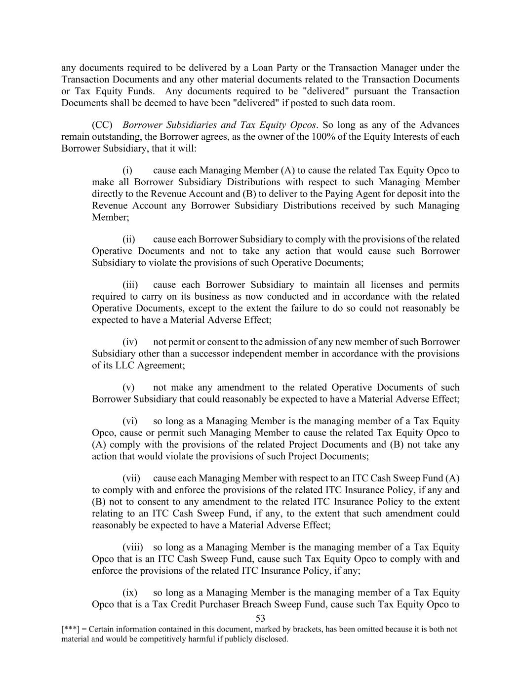 53 [***] = Certain information contained in this document, marked by brackets, has been omitted because it is both not material and would be competitively harmful if publicly disclosed. any documents required to be delivered by a Loan Party or the Transaction Manager under the Transaction Documents and any other material documents related to the Transaction Documents or Tax Equity Funds. Any documents required to be "delivered" pursuant the Transaction Documents shall be deemed to have been "delivered" if posted to such data room. (CC) Borrower Subsidiaries and Tax Equity Opcos. So long as any of the Advances remain outstanding, the Borrower agrees, as the owner of the 100% of the Equity Interests of each Borrower Subsidiary, that it will: (i) cause each Managing Member (A) to cause the related Tax Equity Opco to make all Borrower Subsidiary Distributions with respect to such Managing Member directly to the Revenue Account and (B) to deliver to the Paying Agent for deposit into the Revenue Account any Borrower Subsidiary Distributions received by such Managing Member; (ii) cause each Borrower Subsidiary to comply with the provisions of the related Operative Documents and not to take any action that would cause such Borrower Subsidiary to violate the provisions of such Operative Documents; (iii) cause each Borrower Subsidiary to maintain all licenses and permits required to carry on its business as now conducted and in accordance with the related Operative Documents, except to the extent the failure to do so could not reasonably be expected to have a Material Adverse Effect; (iv) not permit or consent to the admission of any new member of such Borrower Subsidiary other than a successor independent member in accordance with the provisions of its LLC Agreement; (v) not make any amendment to the related Operative Documents of such Borrower Subsidiary that could reasonably be expected to have a Material Adverse Effect; (vi) so long as a Managing Member is the managing member of a Tax Equity Opco, cause or permit such Managing Member to cause the related Tax Equity Opco to (A) comply with the provisions of the related Project Documents and (B) not take any action that would violate the provisions of such Project Documents; (vii) cause each Managing Member with respect to an ITC Cash Sweep Fund (A) to comply with and enforce the provisions of the related ITC Insurance Policy, if any and (B) not to consent to any amendment to the related ITC Insurance Policy to the extent relating to an ITC Cash Sweep Fund, if any, to the extent that such amendment could reasonably be expected to have a Material Adverse Effect; (viii) so long as a Managing Member is the managing member of a Tax Equity Opco that is an ITC Cash Sweep Fund, cause such Tax Equity Opco to comply with and enforce the provisions of the related ITC Insurance Policy, if any; (ix) so long as a Managing Member is the managing member of a Tax Equity Opco that is a Tax Credit Purchaser Breach Sweep Fund, cause such Tax Equity Opco to