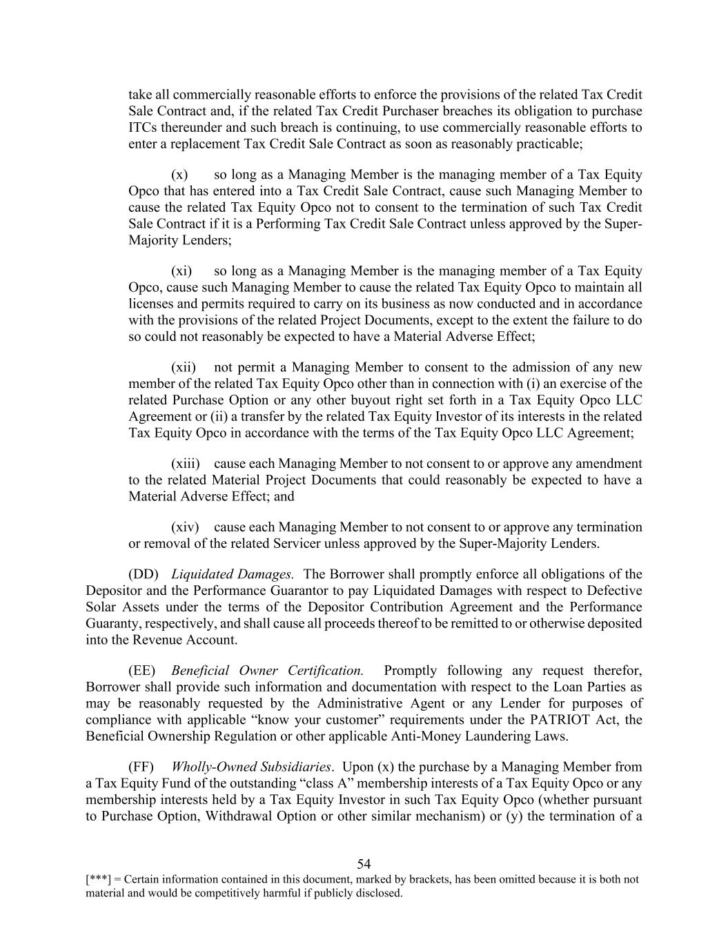 54 [***] = Certain information contained in this document, marked by brackets, has been omitted because it is both not material and would be competitively harmful if publicly disclosed. take all commercially reasonable efforts to enforce the provisions of the related Tax Credit Sale Contract and, if the related Tax Credit Purchaser breaches its obligation to purchase ITCs thereunder and such breach is continuing, to use commercially reasonable efforts to enter a replacement Tax Credit Sale Contract as soon as reasonably practicable; (x) so long as a Managing Member is the managing member of a Tax Equity Opco that has entered into a Tax Credit Sale Contract, cause such Managing Member to cause the related Tax Equity Opco not to consent to the termination of such Tax Credit Sale Contract if it is a Performing Tax Credit Sale Contract unless approved by the Super- Majority Lenders; (xi) so long as a Managing Member is the managing member of a Tax Equity Opco, cause such Managing Member to cause the related Tax Equity Opco to maintain all licenses and permits required to carry on its business as now conducted and in accordance with the provisions of the related Project Documents, except to the extent the failure to do so could not reasonably be expected to have a Material Adverse Effect; (xii) not permit a Managing Member to consent to the admission of any new member of the related Tax Equity Opco other than in connection with (i) an exercise of the related Purchase Option or any other buyout right set forth in a Tax Equity Opco LLC Agreement or (ii) a transfer by the related Tax Equity Investor of its interests in the related Tax Equity Opco in accordance with the terms of the Tax Equity Opco LLC Agreement; (xiii) cause each Managing Member to not consent to or approve any amendment to the related Material Project Documents that could reasonably be expected to have a Material Adverse Effect; and (xiv) cause each Managing Member to not consent to or approve any termination or removal of the related Servicer unless approved by the Super-Majority Lenders. (DD) Liquidated Damages. The Borrower shall promptly enforce all obligations of the Depositor and the Performance Guarantor to pay Liquidated Damages with respect to Defective Solar Assets under the terms of the Depositor Contribution Agreement and the Performance Guaranty, respectively, and shall cause all proceeds thereof to be remitted to or otherwise deposited into the Revenue Account. (EE) Beneficial Owner Certification. Promptly following any request therefor, Borrower shall provide such information and documentation with respect to the Loan Parties as may be reasonably requested by the Administrative Agent or any Lender for purposes of compliance with applicable “know your customer” requirements under the PATRIOT Act, the Beneficial Ownership Regulation or other applicable Anti-Money Laundering Laws. (FF) Wholly-Owned Subsidiaries. Upon (x) the purchase by a Managing Member from a Tax Equity Fund of the outstanding “class A” membership interests of a Tax Equity Opco or any membership interests held by a Tax Equity Investor in such Tax Equity Opco (whether pursuant to Purchase Option, Withdrawal Option or other similar mechanism) or (y) the termination of a