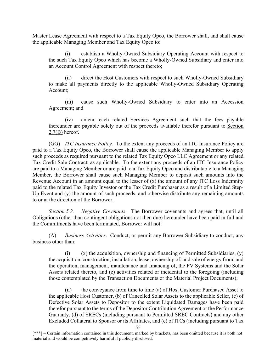 55 [***] = Certain information contained in this document, marked by brackets, has been omitted because it is both not material and would be competitively harmful if publicly disclosed. Master Lease Agreement with respect to a Tax Equity Opco, the Borrower shall, and shall cause the applicable Managing Member and Tax Equity Opco to: (i) establish a Wholly-Owned Subsidiary Operating Account with respect to the such Tax Equity Opco which has become a Wholly-Owned Subsidiary and enter into an Account Control Agreement with respect thereto; (ii) direct the Host Customers with respect to such Wholly-Owned Subsidiary to make all payments directly to the applicable Wholly-Owned Subsidiary Operating Account; (iii) cause such Wholly-Owned Subsidiary to enter into an Accession Agreement; and (iv) amend each related Services Agreement such that the fees payable thereunder are payable solely out of the proceeds available therefor pursuant to Section 2.7(B) hereof. (GG) ITC Insurance Policy. To the extent any proceeds of an ITC Insurance Policy are paid to a Tax Equity Opco, the Borrower shall cause the applicable Managing Member to apply such proceeds as required pursuant to the related Tax Equity Opco LLC Agreement or any related Tax Credit Sale Contract, as applicable. To the extent any proceeds of an ITC Insurance Policy are paid to a Managing Member or are paid to a Tax Equity Opco and distributable to a Managing Member, the Borrower shall cause such Managing Member to deposit such amounts into the Revenue Account in an amount equal to the lesser of (x) the amount of any ITC Loss Indemnity paid to the related Tax Equity Investor or the Tax Credit Purchaser as a result of a Limited Step- Up Event and (y) the amount of such proceeds, and otherwise distribute any remaining amounts to or at the direction of the Borrower. Section 5.2. Negative Covenants. The Borrower covenants and agrees that, until all Obligations (other than contingent obligations not then due) hereunder have been paid in full and the Commitments have been terminated, Borrower will not: (A) Business Activities. Conduct, or permit any Borrower Subsidiary to conduct, any business other than: (i) (x) the acquisition, ownership and financing of Permitted Subsidiaries, (y) the acquisition, construction, installation, lease, ownership of, and sale of energy from, and the operation, management, maintenance and financing of, the PV Systems and the Solar Assets related thereto, and (z) activities related or incidental to the foregoing (including those contemplated by the Transaction Documents or the Material Project Documents); (ii) the conveyance from time to time (a) of Host Customer Purchased Asset to the applicable Host Customer, (b) of Cancelled Solar Assets to the applicable Seller, (c) of Defective Solar Assets to Depositor to the extent Liquidated Damages have been paid therefor pursuant to the terms of the Depositor Contribution Agreement or the Performance Guaranty, (d) of SRECs (including pursuant to Permitted SREC Contracts) and any other Excluded Collateral to Sponsor or its Affiliates, and (e) of ITCs (including pursuant to Tax