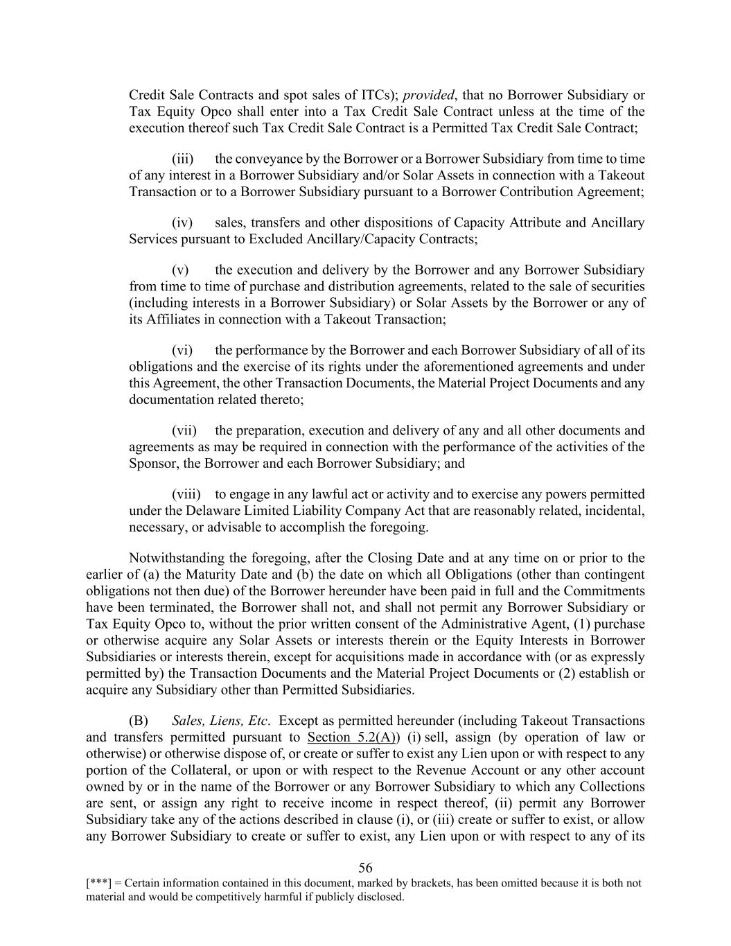 56 [***] = Certain information contained in this document, marked by brackets, has been omitted because it is both not material and would be competitively harmful if publicly disclosed. Credit Sale Contracts and spot sales of ITCs); provided, that no Borrower Subsidiary or Tax Equity Opco shall enter into a Tax Credit Sale Contract unless at the time of the execution thereof such Tax Credit Sale Contract is a Permitted Tax Credit Sale Contract; (iii) the conveyance by the Borrower or a Borrower Subsidiary from time to time of any interest in a Borrower Subsidiary and/or Solar Assets in connection with a Takeout Transaction or to a Borrower Subsidiary pursuant to a Borrower Contribution Agreement; (iv) sales, transfers and other dispositions of Capacity Attribute and Ancillary Services pursuant to Excluded Ancillary/Capacity Contracts; (v) the execution and delivery by the Borrower and any Borrower Subsidiary from time to time of purchase and distribution agreements, related to the sale of securities (including interests in a Borrower Subsidiary) or Solar Assets by the Borrower or any of its Affiliates in connection with a Takeout Transaction; (vi) the performance by the Borrower and each Borrower Subsidiary of all of its obligations and the exercise of its rights under the aforementioned agreements and under this Agreement, the other Transaction Documents, the Material Project Documents and any documentation related thereto; (vii) the preparation, execution and delivery of any and all other documents and agreements as may be required in connection with the performance of the activities of the Sponsor, the Borrower and each Borrower Subsidiary; and (viii) to engage in any lawful act or activity and to exercise any powers permitted under the Delaware Limited Liability Company Act that are reasonably related, incidental, necessary, or advisable to accomplish the foregoing. Notwithstanding the foregoing, after the Closing Date and at any time on or prior to the earlier of (a) the Maturity Date and (b) the date on which all Obligations (other than contingent obligations not then due) of the Borrower hereunder have been paid in full and the Commitments have been terminated, the Borrower shall not, and shall not permit any Borrower Subsidiary or Tax Equity Opco to, without the prior written consent of the Administrative Agent, (1) purchase or otherwise acquire any Solar Assets or interests therein or the Equity Interests in Borrower Subsidiaries or interests therein, except for acquisitions made in accordance with (or as expressly permitted by) the Transaction Documents and the Material Project Documents or (2) establish or acquire any Subsidiary other than Permitted Subsidiaries. (B) Sales, Liens, Etc. Except as permitted hereunder (including Takeout Transactions and transfers permitted pursuant to Section 5.2(A)) (i) sell, assign (by operation of law or otherwise) or otherwise dispose of, or create or suffer to exist any Lien upon or with respect to any portion of the Collateral, or upon or with respect to the Revenue Account or any other account owned by or in the name of the Borrower or any Borrower Subsidiary to which any Collections are sent, or assign any right to receive income in respect thereof, (ii) permit any Borrower Subsidiary take any of the actions described in clause (i), or (iii) create or suffer to exist, or allow any Borrower Subsidiary to create or suffer to exist, any Lien upon or with respect to any of its