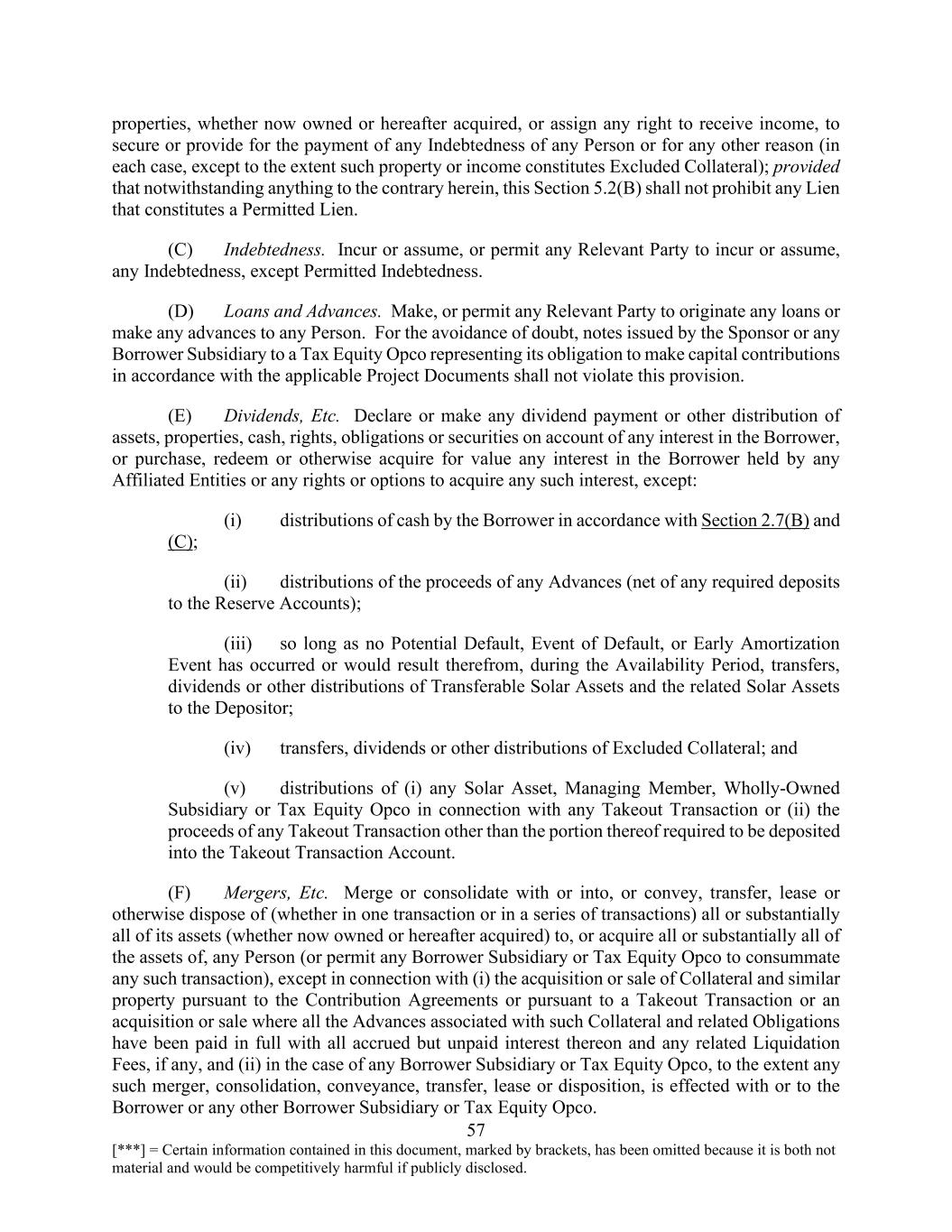 57 [***] = Certain information contained in this document, marked by brackets, has been omitted because it is both not material and would be competitively harmful if publicly disclosed. properties, whether now owned or hereafter acquired, or assign any right to receive income, to secure or provide for the payment of any Indebtedness of any Person or for any other reason (in each case, except to the extent such property or income constitutes Excluded Collateral); provided that notwithstanding anything to the contrary herein, this Section 5.2(B) shall not prohibit any Lien that constitutes a Permitted Lien. (C) Indebtedness. Incur or assume, or permit any Relevant Party to incur or assume, any Indebtedness, except Permitted Indebtedness. (D) Loans and Advances. Make, or permit any Relevant Party to originate any loans or make any advances to any Person. For the avoidance of doubt, notes issued by the Sponsor or any Borrower Subsidiary to a Tax Equity Opco representing its obligation to make capital contributions in accordance with the applicable Project Documents shall not violate this provision. (E) Dividends, Etc. Declare or make any dividend payment or other distribution of assets, properties, cash, rights, obligations or securities on account of any interest in the Borrower, or purchase, redeem or otherwise acquire for value any interest in the Borrower held by any Affiliated Entities or any rights or options to acquire any such interest, except: (i) distributions of cash by the Borrower in accordance with Section 2.7(B) and (C); (ii) distributions of the proceeds of any Advances (net of any required deposits to the Reserve Accounts); (iii) so long as no Potential Default, Event of Default, or Early Amortization Event has occurred or would result therefrom, during the Availability Period, transfers, dividends or other distributions of Transferable Solar Assets and the related Solar Assets to the Depositor; (iv) transfers, dividends or other distributions of Excluded Collateral; and (v) distributions of (i) any Solar Asset, Managing Member, Wholly-Owned Subsidiary or Tax Equity Opco in connection with any Takeout Transaction or (ii) the proceeds of any Takeout Transaction other than the portion thereof required to be deposited into the Takeout Transaction Account. (F) Mergers, Etc. Merge or consolidate with or into, or convey, transfer, lease or otherwise dispose of (whether in one transaction or in a series of transactions) all or substantially all of its assets (whether now owned or hereafter acquired) to, or acquire all or substantially all of the assets of, any Person (or permit any Borrower Subsidiary or Tax Equity Opco to consummate any such transaction), except in connection with (i) the acquisition or sale of Collateral and similar property pursuant to the Contribution Agreements or pursuant to a Takeout Transaction or an acquisition or sale where all the Advances associated with such Collateral and related Obligations have been paid in full with all accrued but unpaid interest thereon and any related Liquidation Fees, if any, and (ii) in the case of any Borrower Subsidiary or Tax Equity Opco, to the extent any such merger, consolidation, conveyance, transfer, lease or disposition, is effected with or to the Borrower or any other Borrower Subsidiary or Tax Equity Opco.