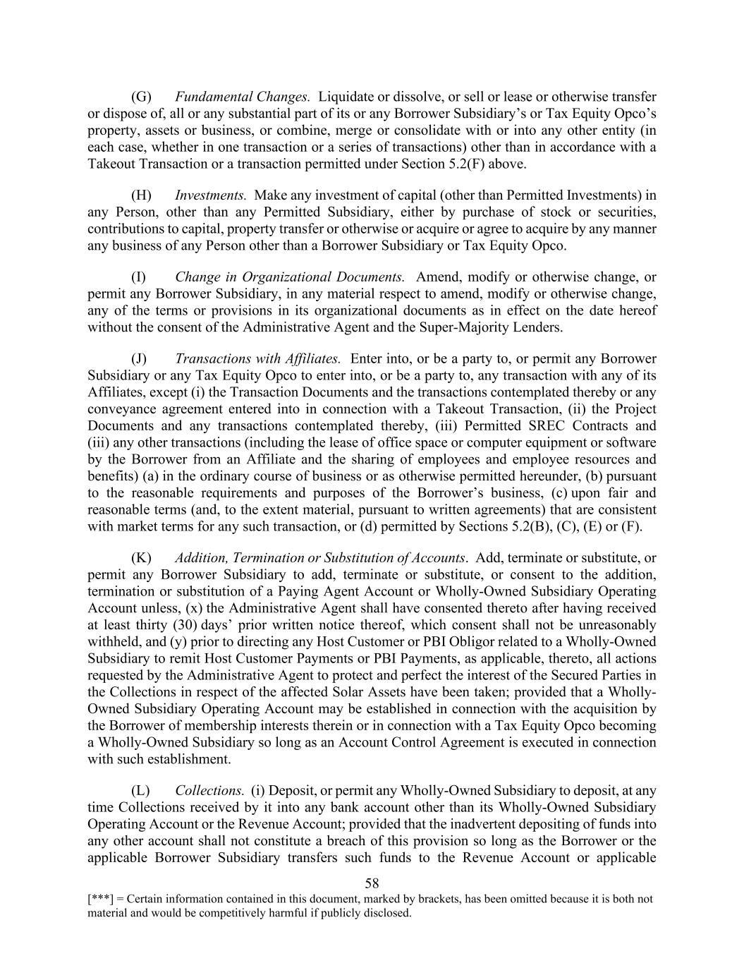 58 [***] = Certain information contained in this document, marked by brackets, has been omitted because it is both not material and would be competitively harmful if publicly disclosed. (G) Fundamental Changes. Liquidate or dissolve, or sell or lease or otherwise transfer or dispose of, all or any substantial part of its or any Borrower Subsidiary’s or Tax Equity Opco’s property, assets or business, or combine, merge or consolidate with or into any other entity (in each case, whether in one transaction or a series of transactions) other than in accordance with a Takeout Transaction or a transaction permitted under Section 5.2(F) above. (H) Investments. Make any investment of capital (other than Permitted Investments) in any Person, other than any Permitted Subsidiary, either by purchase of stock or securities, contributions to capital, property transfer or otherwise or acquire or agree to acquire by any manner any business of any Person other than a Borrower Subsidiary or Tax Equity Opco. (I) Change in Organizational Documents. Amend, modify or otherwise change, or permit any Borrower Subsidiary, in any material respect to amend, modify or otherwise change, any of the terms or provisions in its organizational documents as in effect on the date hereof without the consent of the Administrative Agent and the Super-Majority Lenders. (J) Transactions with Affiliates. Enter into, or be a party to, or permit any Borrower Subsidiary or any Tax Equity Opco to enter into, or be a party to, any transaction with any of its Affiliates, except (i) the Transaction Documents and the transactions contemplated thereby or any conveyance agreement entered into in connection with a Takeout Transaction, (ii) the Project Documents and any transactions contemplated thereby, (iii) Permitted SREC Contracts and (iii) any other transactions (including the lease of office space or computer equipment or software by the Borrower from an Affiliate and the sharing of employees and employee resources and benefits) (a) in the ordinary course of business or as otherwise permitted hereunder, (b) pursuant to the reasonable requirements and purposes of the Borrower’s business, (c) upon fair and reasonable terms (and, to the extent material, pursuant to written agreements) that are consistent with market terms for any such transaction, or (d) permitted by Sections 5.2(B), (C), (E) or (F). (K) Addition, Termination or Substitution of Accounts. Add, terminate or substitute, or permit any Borrower Subsidiary to add, terminate or substitute, or consent to the addition, termination or substitution of a Paying Agent Account or Wholly-Owned Subsidiary Operating Account unless, (x) the Administrative Agent shall have consented thereto after having received at least thirty (30) days’ prior written notice thereof, which consent shall not be unreasonably withheld, and (y) prior to directing any Host Customer or PBI Obligor related to a Wholly-Owned Subsidiary to remit Host Customer Payments or PBI Payments, as applicable, thereto, all actions requested by the Administrative Agent to protect and perfect the interest of the Secured Parties in the Collections in respect of the affected Solar Assets have been taken; provided that a Wholly- Owned Subsidiary Operating Account may be established in connection with the acquisition by the Borrower of membership interests therein or in connection with a Tax Equity Opco becoming a Wholly-Owned Subsidiary so long as an Account Control Agreement is executed in connection with such establishment. (L) Collections. (i) Deposit, or permit any Wholly-Owned Subsidiary to deposit, at any time Collections received by it into any bank account other than its Wholly-Owned Subsidiary Operating Account or the Revenue Account; provided that the inadvertent depositing of funds into any other account shall not constitute a breach of this provision so long as the Borrower or the applicable Borrower Subsidiary transfers such funds to the Revenue Account or applicable