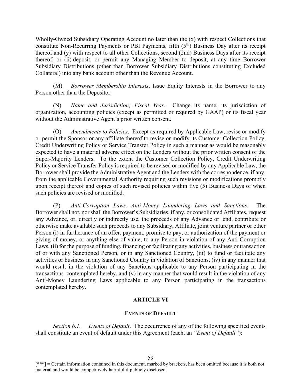 59 [***] = Certain information contained in this document, marked by brackets, has been omitted because it is both not material and would be competitively harmful if publicly disclosed. Wholly-Owned Subsidiary Operating Account no later than the (x) with respect Collections that constitute Non-Recurring Payments or PBI Payments, fifth (5th) Business Day after its receipt thereof and (y) with respect to all other Collections, second (2nd) Business Days after its receipt thereof, or (ii) deposit, or permit any Managing Member to deposit, at any time Borrower Subsidiary Distributions (other than Borrower Subsidiary Distributions constituting Excluded Collateral) into any bank account other than the Revenue Account. (M) Borrower Membership Interests. Issue Equity Interests in the Borrower to any Person other than the Depositor. (N) Name and Jurisdiction; Fiscal Year. Change its name, its jurisdiction of organization, accounting policies (except as permitted or required by GAAP) or its fiscal year without the Administrative Agent’s prior written consent. (O) Amendments to Policies. Except as required by Applicable Law, revise or modify or permit the Sponsor or any affiliate thereof to revise or modify its Customer Collection Policy, Credit Underwriting Policy or Service Transfer Policy in such a manner as would be reasonably expected to have a material adverse effect on the Lenders without the prior written consent of the Super-Majority Lenders. To the extent the Customer Collection Policy, Credit Underwriting Policy or Service Transfer Policy is required to be revised or modified by any Applicable Law, the Borrower shall provide the Administrative Agent and the Lenders with the correspondence, if any, from the applicable Governmental Authority requiring such revisions or modifications promptly upon receipt thereof and copies of such revised policies within five (5) Business Days of when such policies are revised or modified. (P) Anti-Corruption Laws, Anti-Money Laundering Laws and Sanctions. The Borrower shall not, nor shall the Borrower’s Subsidiaries, if any, or consolidated Affiliates, request any Advance, or, directly or indirectly use, the proceeds of any Advance or lend, contribute or otherwise make available such proceeds to any Subsidiary, Affiliate, joint venture partner or other Person (i) in furtherance of an offer, payment, promise to pay, or authorization of the payment or giving of money, or anything else of value, to any Person in violation of any Anti-Corruption Laws, (ii) for the purpose of funding, financing or facilitating any activities, business or transaction of or with any Sanctioned Person, or in any Sanctioned Country, (iii) to fund or facilitate any activities or business in any Sanctioned Country in violation of Sanctions, (iv) in any manner that would result in the violation of any Sanctions applicable to any Person participating in the transactions contemplated hereby, and (v) in any manner that would result in the violation of any Anti-Money Laundering Laws applicable to any Person participating in the transactions contemplated hereby. ARTICLE VI EVENTS OF DEFAULT Section 6.1. Events of Default. The occurrence of any of the following specified events shall constitute an event of default under this Agreement (each, an “Event of Default”):