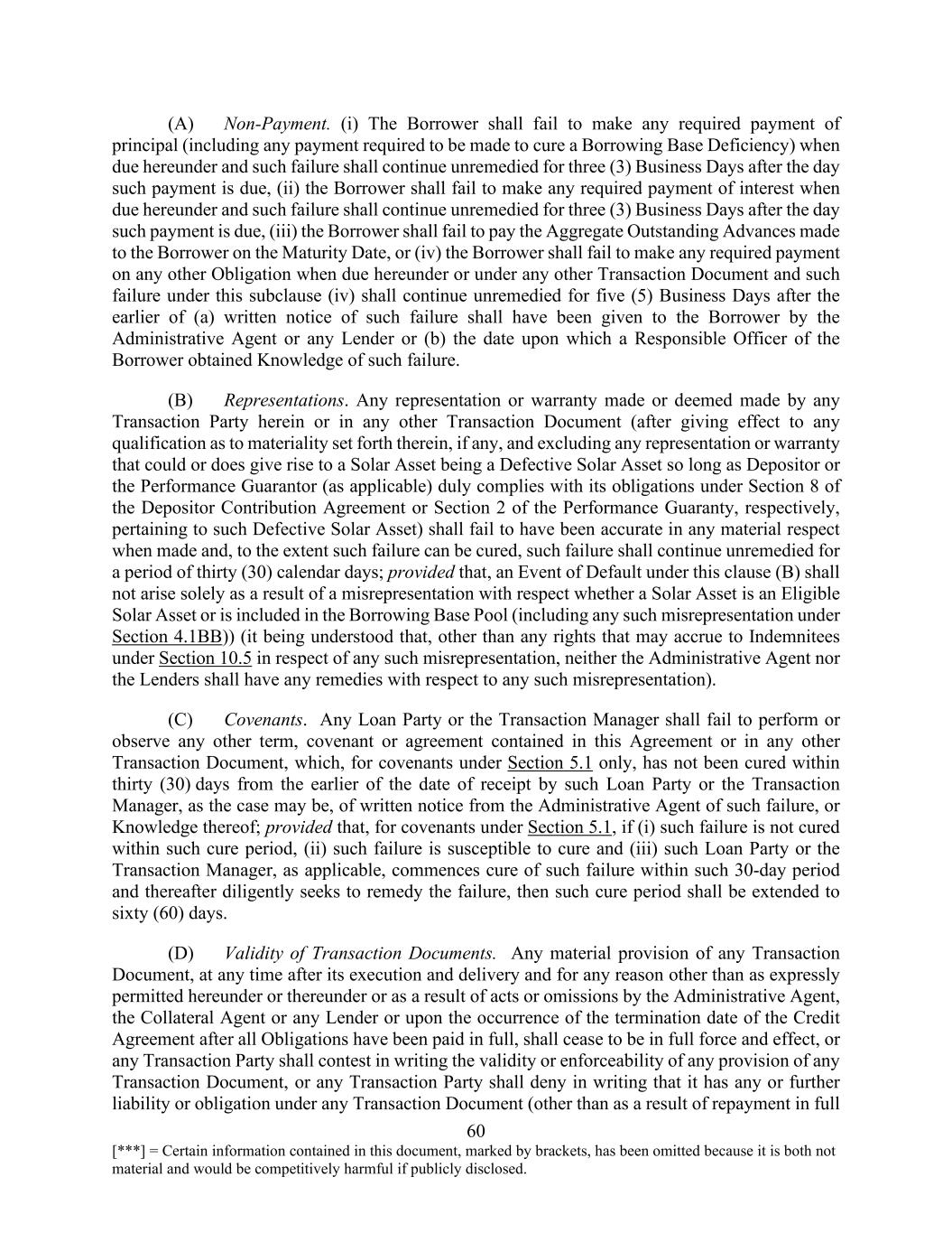 60 [***] = Certain information contained in this document, marked by brackets, has been omitted because it is both not material and would be competitively harmful if publicly disclosed. (A) Non-Payment. (i) The Borrower shall fail to make any required payment of principal (including any payment required to be made to cure a Borrowing Base Deficiency) when due hereunder and such failure shall continue unremedied for three (3) Business Days after the day such payment is due, (ii) the Borrower shall fail to make any required payment of interest when due hereunder and such failure shall continue unremedied for three (3) Business Days after the day such payment is due, (iii) the Borrower shall fail to pay the Aggregate Outstanding Advances made to the Borrower on the Maturity Date, or (iv) the Borrower shall fail to make any required payment on any other Obligation when due hereunder or under any other Transaction Document and such failure under this subclause (iv) shall continue unremedied for five (5) Business Days after the earlier of (a) written notice of such failure shall have been given to the Borrower by the Administrative Agent or any Lender or (b) the date upon which a Responsible Officer of the Borrower obtained Knowledge of such failure. (B) Representations. Any representation or warranty made or deemed made by any Transaction Party herein or in any other Transaction Document (after giving effect to any qualification as to materiality set forth therein, if any, and excluding any representation or warranty that could or does give rise to a Solar Asset being a Defective Solar Asset so long as Depositor or the Performance Guarantor (as applicable) duly complies with its obligations under Section 8 of the Depositor Contribution Agreement or Section 2 of the Performance Guaranty, respectively, pertaining to such Defective Solar Asset) shall fail to have been accurate in any material respect when made and, to the extent such failure can be cured, such failure shall continue unremedied for a period of thirty (30) calendar days; provided that, an Event of Default under this clause (B) shall not arise solely as a result of a misrepresentation with respect whether a Solar Asset is an Eligible Solar Asset or is included in the Borrowing Base Pool (including any such misrepresentation under Section 4.1BB)) (it being understood that, other than any rights that may accrue to Indemnitees under Section 10.5 in respect of any such misrepresentation, neither the Administrative Agent nor the Lenders shall have any remedies with respect to any such misrepresentation). (C) Covenants. Any Loan Party or the Transaction Manager shall fail to perform or observe any other term, covenant or agreement contained in this Agreement or in any other Transaction Document, which, for covenants under Section 5.1 only, has not been cured within thirty (30) days from the earlier of the date of receipt by such Loan Party or the Transaction Manager, as the case may be, of written notice from the Administrative Agent of such failure, or Knowledge thereof; provided that, for covenants under Section 5.1, if (i) such failure is not cured within such cure period, (ii) such failure is susceptible to cure and (iii) such Loan Party or the Transaction Manager, as applicable, commences cure of such failure within such 30-day period and thereafter diligently seeks to remedy the failure, then such cure period shall be extended to sixty (60) days. (D) Validity of Transaction Documents. Any material provision of any Transaction Document, at any time after its execution and delivery and for any reason other than as expressly permitted hereunder or thereunder or as a result of acts or omissions by the Administrative Agent, the Collateral Agent or any Lender or upon the occurrence of the termination date of the Credit Agreement after all Obligations have been paid in full, shall cease to be in full force and effect, or any Transaction Party shall contest in writing the validity or enforceability of any provision of any Transaction Document, or any Transaction Party shall deny in writing that it has any or further liability or obligation under any Transaction Document (other than as a result of repayment in full