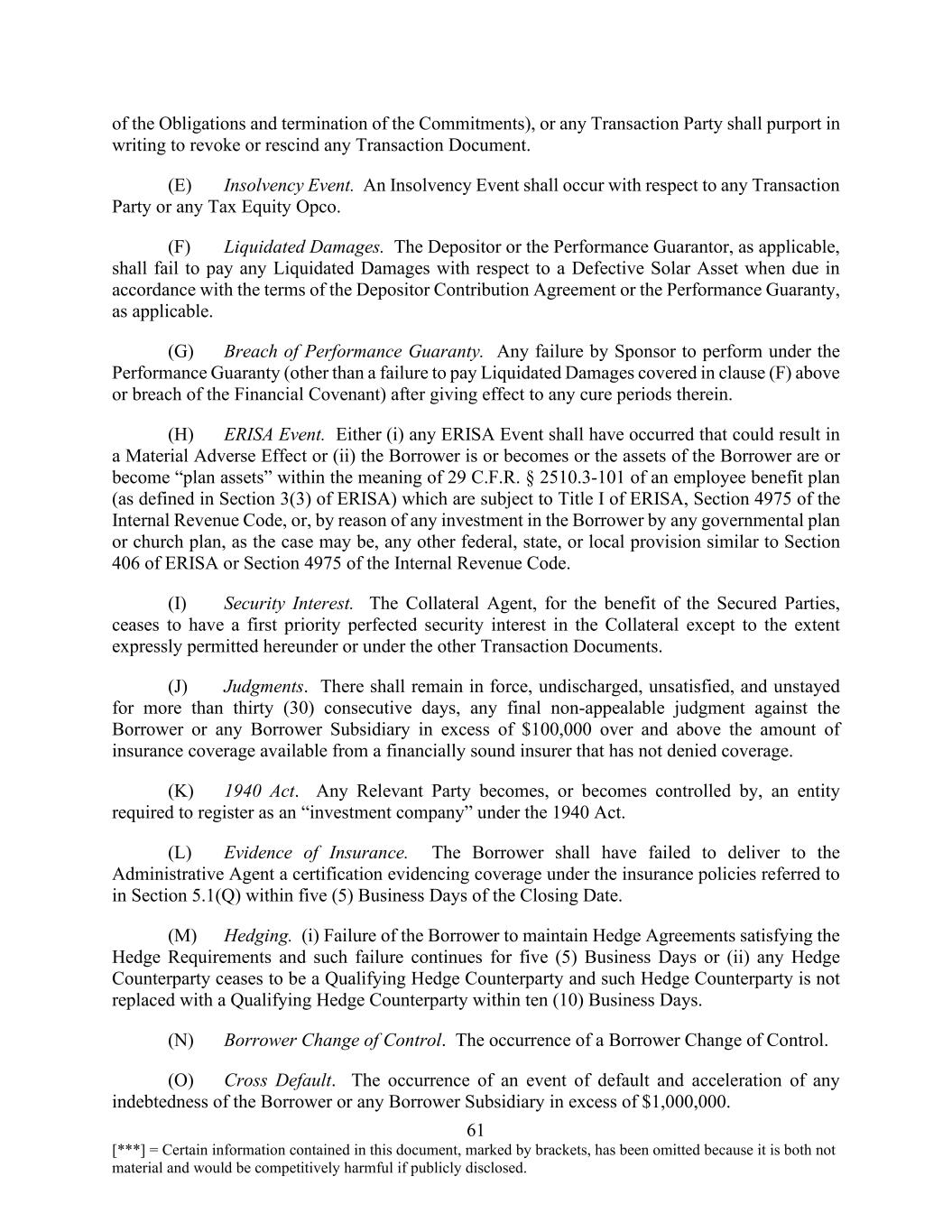 61 [***] = Certain information contained in this document, marked by brackets, has been omitted because it is both not material and would be competitively harmful if publicly disclosed. of the Obligations and termination of the Commitments), or any Transaction Party shall purport in writing to revoke or rescind any Transaction Document. (E) Insolvency Event. An Insolvency Event shall occur with respect to any Transaction Party or any Tax Equity Opco. (F) Liquidated Damages. The Depositor or the Performance Guarantor, as applicable, shall fail to pay any Liquidated Damages with respect to a Defective Solar Asset when due in accordance with the terms of the Depositor Contribution Agreement or the Performance Guaranty, as applicable. (G) Breach of Performance Guaranty. Any failure by Sponsor to perform under the Performance Guaranty (other than a failure to pay Liquidated Damages covered in clause (F) above or breach of the Financial Covenant) after giving effect to any cure periods therein. (H) ERISA Event. Either (i) any ERISA Event shall have occurred that could result in a Material Adverse Effect or (ii) the Borrower is or becomes or the assets of the Borrower are or become “plan assets” within the meaning of 29 C.F.R. § 2510.3-101 of an employee benefit plan (as defined in Section 3(3) of ERISA) which are subject to Title I of ERISA, Section 4975 of the Internal Revenue Code, or, by reason of any investment in the Borrower by any governmental plan or church plan, as the case may be, any other federal, state, or local provision similar to Section 406 of ERISA or Section 4975 of the Internal Revenue Code. (I) Security Interest. The Collateral Agent, for the benefit of the Secured Parties, ceases to have a first priority perfected security interest in the Collateral except to the extent expressly permitted hereunder or under the other Transaction Documents. (J) Judgments. There shall remain in force, undischarged, unsatisfied, and unstayed for more than thirty (30) consecutive days, any final non-appealable judgment against the Borrower or any Borrower Subsidiary in excess of $100,000 over and above the amount of insurance coverage available from a financially sound insurer that has not denied coverage. (K) 1940 Act. Any Relevant Party becomes, or becomes controlled by, an entity required to register as an “investment company” under the 1940 Act. (L) Evidence of Insurance. The Borrower shall have failed to deliver to the Administrative Agent a certification evidencing coverage under the insurance policies referred to in Section 5.1(Q) within five (5) Business Days of the Closing Date. (M) Hedging. (i) Failure of the Borrower to maintain Hedge Agreements satisfying the Hedge Requirements and such failure continues for five (5) Business Days or (ii) any Hedge Counterparty ceases to be a Qualifying Hedge Counterparty and such Hedge Counterparty is not replaced with a Qualifying Hedge Counterparty within ten (10) Business Days. (N) Borrower Change of Control. The occurrence of a Borrower Change of Control. (O) Cross Default. The occurrence of an event of default and acceleration of any indebtedness of the Borrower or any Borrower Subsidiary in excess of $1,000,000.