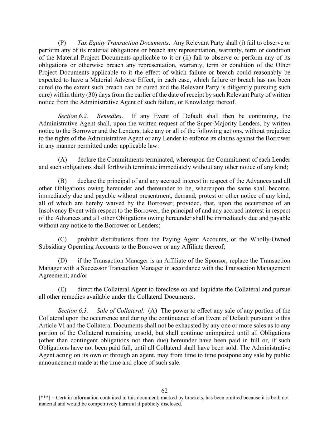 62 [***] = Certain information contained in this document, marked by brackets, has been omitted because it is both not material and would be competitively harmful if publicly disclosed. (P) Tax Equity Transaction Documents. Any Relevant Party shall (i) fail to observe or perform any of its material obligations or breach any representation, warranty, term or condition of the Material Project Documents applicable to it or (ii) fail to observe or perform any of its obligations or otherwise breach any representation, warranty, term or condition of the Other Project Documents applicable to it the effect of which failure or breach could reasonably be expected to have a Material Adverse Effect, in each case, which failure or breach has not been cured (to the extent such breach can be cured and the Relevant Party is diligently pursuing such cure) within thirty (30) days from the earlier of the date of receipt by such Relevant Party of written notice from the Administrative Agent of such failure, or Knowledge thereof. Section 6.2. Remedies. If any Event of Default shall then be continuing, the Administrative Agent shall, upon the written request of the Super-Majority Lenders, by written notice to the Borrower and the Lenders, take any or all of the following actions, without prejudice to the rights of the Administrative Agent or any Lender to enforce its claims against the Borrower in any manner permitted under applicable law: (A) declare the Commitments terminated, whereupon the Commitment of each Lender and such obligations shall forthwith terminate immediately without any other notice of any kind; (B) declare the principal of and any accrued interest in respect of the Advances and all other Obligations owing hereunder and thereunder to be, whereupon the same shall become, immediately due and payable without presentment, demand, protest or other notice of any kind, all of which are hereby waived by the Borrower; provided, that, upon the occurrence of an Insolvency Event with respect to the Borrower, the principal of and any accrued interest in respect of the Advances and all other Obligations owing hereunder shall be immediately due and payable without any notice to the Borrower or Lenders; (C) prohibit distributions from the Paying Agent Accounts, or the Wholly-Owned Subsidiary Operating Accounts to the Borrower or any Affiliate thereof; (D) if the Transaction Manager is an Affiliate of the Sponsor, replace the Transaction Manager with a Successor Transaction Manager in accordance with the Transaction Management Agreement; and/or (E) direct the Collateral Agent to foreclose on and liquidate the Collateral and pursue all other remedies available under the Collateral Documents. Section 6.3. Sale of Collateral. (A) The power to effect any sale of any portion of the Collateral upon the occurrence and during the continuance of an Event of Default pursuant to this Article VI and the Collateral Documents shall not be exhausted by any one or more sales as to any portion of the Collateral remaining unsold, but shall continue unimpaired until all Obligations (other than contingent obligations not then due) hereunder have been paid in full or, if such Obligations have not been paid full, until all Collateral shall have been sold. The Administrative Agent acting on its own or through an agent, may from time to time postpone any sale by public announcement made at the time and place of such sale.
