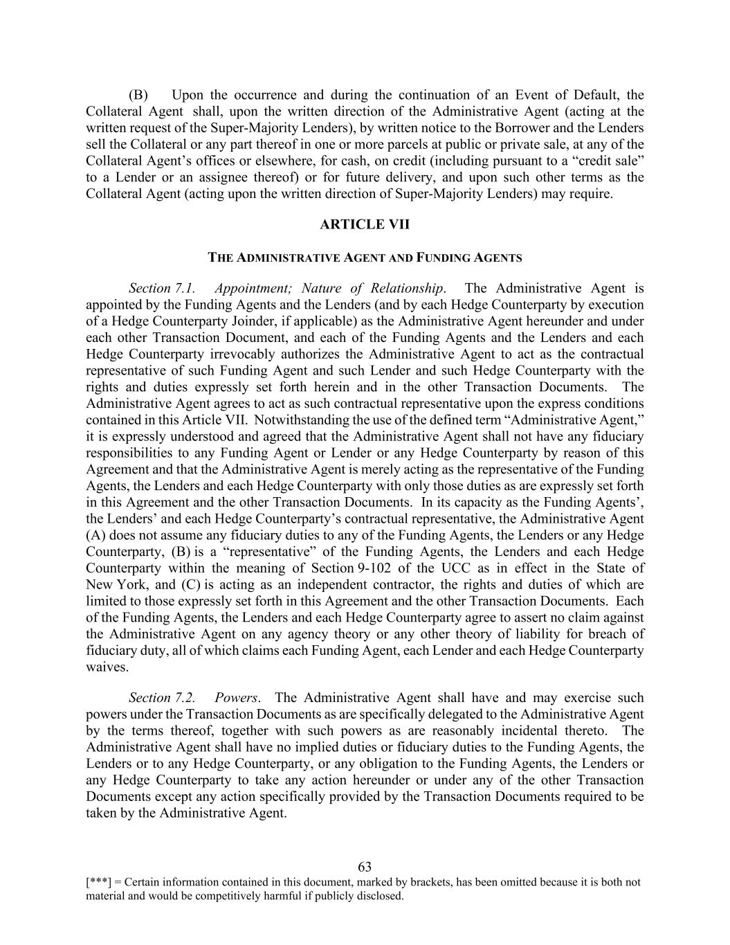 63 [***] = Certain information contained in this document, marked by brackets, has been omitted because it is both not material and would be competitively harmful if publicly disclosed. (B) Upon the occurrence and during the continuation of an Event of Default, the Collateral Agent shall, upon the written direction of the Administrative Agent (acting at the written request of the Super-Majority Lenders), by written notice to the Borrower and the Lenders sell the Collateral or any part thereof in one or more parcels at public or private sale, at any of the Collateral Agent’s offices or elsewhere, for cash, on credit (including pursuant to a “credit sale” to a Lender or an assignee thereof) or for future delivery, and upon such other terms as the Collateral Agent (acting upon the written direction of Super-Majority Lenders) may require. ARTICLE VII THE ADMINISTRATIVE AGENT AND FUNDING AGENTS Section 7.1. Appointment; Nature of Relationship. The Administrative Agent is appointed by the Funding Agents and the Lenders (and by each Hedge Counterparty by execution of a Hedge Counterparty Joinder, if applicable) as the Administrative Agent hereunder and under each other Transaction Document, and each of the Funding Agents and the Lenders and each Hedge Counterparty irrevocably authorizes the Administrative Agent to act as the contractual representative of such Funding Agent and such Lender and such Hedge Counterparty with the rights and duties expressly set forth herein and in the other Transaction Documents. The Administrative Agent agrees to act as such contractual representative upon the express conditions contained in this Article VII. Notwithstanding the use of the defined term “Administrative Agent,” it is expressly understood and agreed that the Administrative Agent shall not have any fiduciary responsibilities to any Funding Agent or Lender or any Hedge Counterparty by reason of this Agreement and that the Administrative Agent is merely acting as the representative of the Funding Agents, the Lenders and each Hedge Counterparty with only those duties as are expressly set forth in this Agreement and the other Transaction Documents. In its capacity as the Funding Agents’, the Lenders’ and each Hedge Counterparty’s contractual representative, the Administrative Agent (A) does not assume any fiduciary duties to any of the Funding Agents, the Lenders or any Hedge Counterparty, (B) is a “representative” of the Funding Agents, the Lenders and each Hedge Counterparty within the meaning of Section 9-102 of the UCC as in effect in the State of New York, and (C) is acting as an independent contractor, the rights and duties of which are limited to those expressly set forth in this Agreement and the other Transaction Documents. Each of the Funding Agents, the Lenders and each Hedge Counterparty agree to assert no claim against the Administrative Agent on any agency theory or any other theory of liability for breach of fiduciary duty, all of which claims each Funding Agent, each Lender and each Hedge Counterparty waives. Section 7.2. Powers. The Administrative Agent shall have and may exercise such powers under the Transaction Documents as are specifically delegated to the Administrative Agent by the terms thereof, together with such powers as are reasonably incidental thereto. The Administrative Agent shall have no implied duties or fiduciary duties to the Funding Agents, the Lenders or to any Hedge Counterparty, or any obligation to the Funding Agents, the Lenders or any Hedge Counterparty to take any action hereunder or under any of the other Transaction Documents except any action specifically provided by the Transaction Documents required to be taken by the Administrative Agent.