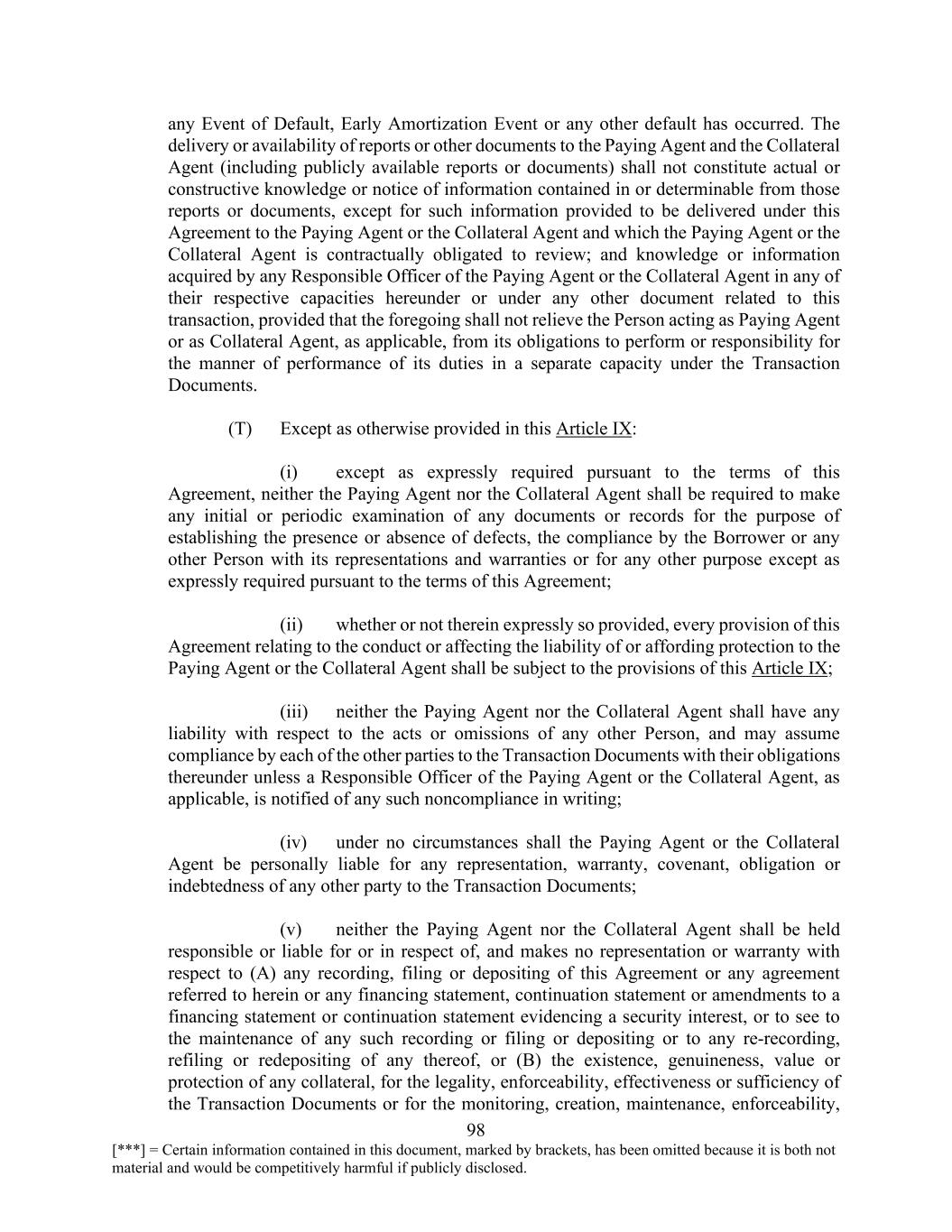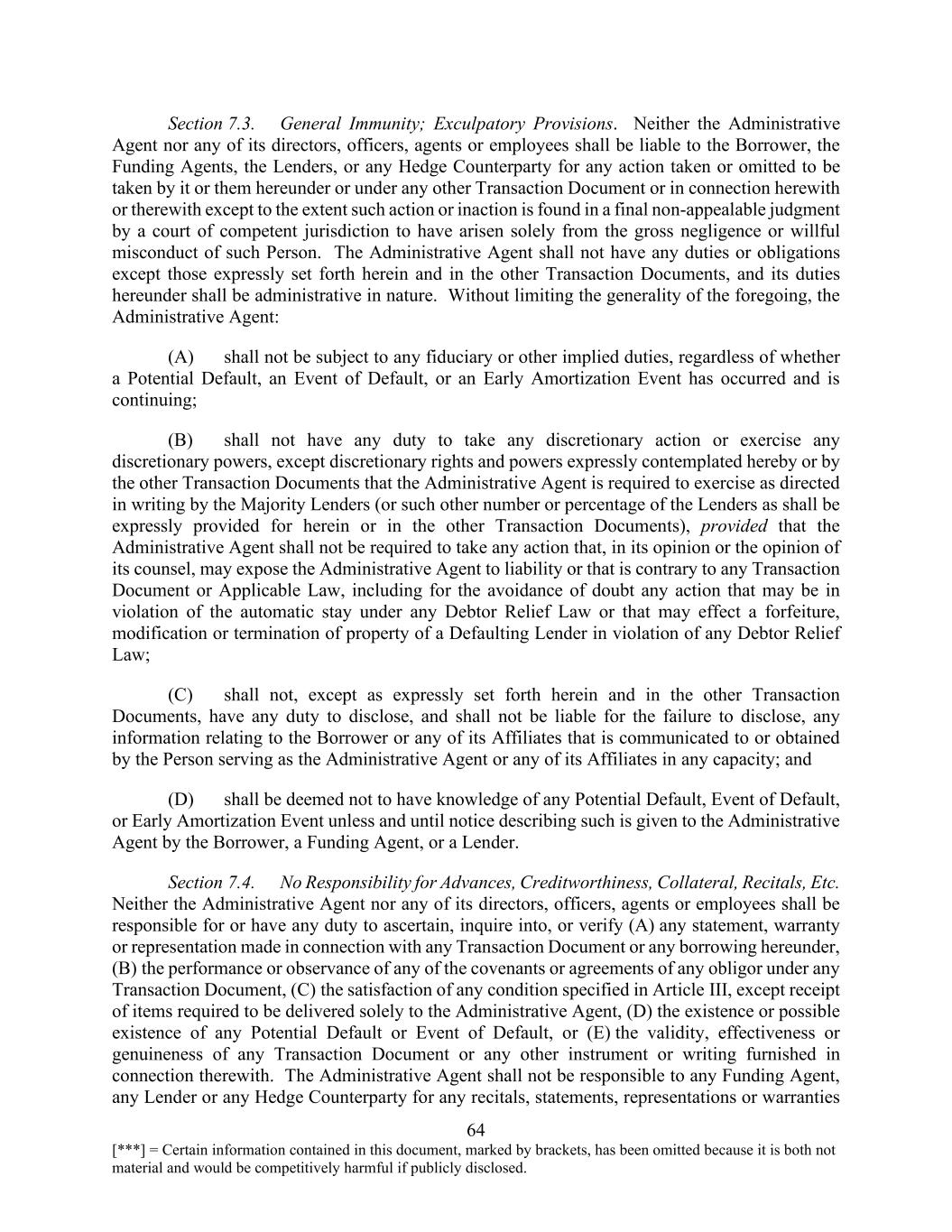 64 [***] = Certain information contained in this document, marked by brackets, has been omitted because it is both not material and would be competitively harmful if publicly disclosed. Section 7.3. General Immunity; Exculpatory Provisions. Neither the Administrative Agent nor any of its directors, officers, agents or employees shall be liable to the Borrower, the Funding Agents, the Lenders, or any Hedge Counterparty for any action taken or omitted to be taken by it or them hereunder or under any other Transaction Document or in connection herewith or therewith except to the extent such action or inaction is found in a final non-appealable judgment by a court of competent jurisdiction to have arisen solely from the gross negligence or willful misconduct of such Person. The Administrative Agent shall not have any duties or obligations except those expressly set forth herein and in the other Transaction Documents, and its duties hereunder shall be administrative in nature. Without limiting the generality of the foregoing, the Administrative Agent: (A) shall not be subject to any fiduciary or other implied duties, regardless of whether a Potential Default, an Event of Default, or an Early Amortization Event has occurred and is continuing; (B) shall not have any duty to take any discretionary action or exercise any discretionary powers, except discretionary rights and powers expressly contemplated hereby or by the other Transaction Documents that the Administrative Agent is required to exercise as directed in writing by the Majority Lenders (or such other number or percentage of the Lenders as shall be expressly provided for herein or in the other Transaction Documents), provided that the Administrative Agent shall not be required to take any action that, in its opinion or the opinion of its counsel, may expose the Administrative Agent to liability or that is contrary to any Transaction Document or Applicable Law, including for the avoidance of doubt any action that may be in violation of the automatic stay under any Debtor Relief Law or that may effect a forfeiture, modification or termination of property of a Defaulting Lender in violation of any Debtor Relief Law; (C) shall not, except as expressly set forth herein and in the other Transaction Documents, have any duty to disclose, and shall not be liable for the failure to disclose, any information relating to the Borrower or any of its Affiliates that is communicated to or obtained by the Person serving as the Administrative Agent or any of its Affiliates in any capacity; and (D) shall be deemed not to have knowledge of any Potential Default, Event of Default, or Early Amortization Event unless and until notice describing such is given to the Administrative Agent by the Borrower, a Funding Agent, or a Lender. Section 7.4. No Responsibility for Advances, Creditworthiness, Collateral, Recitals, Etc. Neither the Administrative Agent nor any of its directors, officers, agents or employees shall be responsible for or have any duty to ascertain, inquire into, or verify (A) any statement, warranty or representation made in connection with any Transaction Document or any borrowing hereunder, (B) the performance or observance of any of the covenants or agreements of any obligor under any Transaction Document, (C) the satisfaction of any condition specified in Article III, except receipt of items required to be delivered solely to the Administrative Agent, (D) the existence or possible existence of any Potential Default or Event of Default, or (E) the validity, effectiveness or genuineness of any Transaction Document or any other instrument or writing furnished in connection therewith. The Administrative Agent shall not be responsible to any Funding Agent, any Lender or any Hedge Counterparty for any recitals, statements, representations or warranties