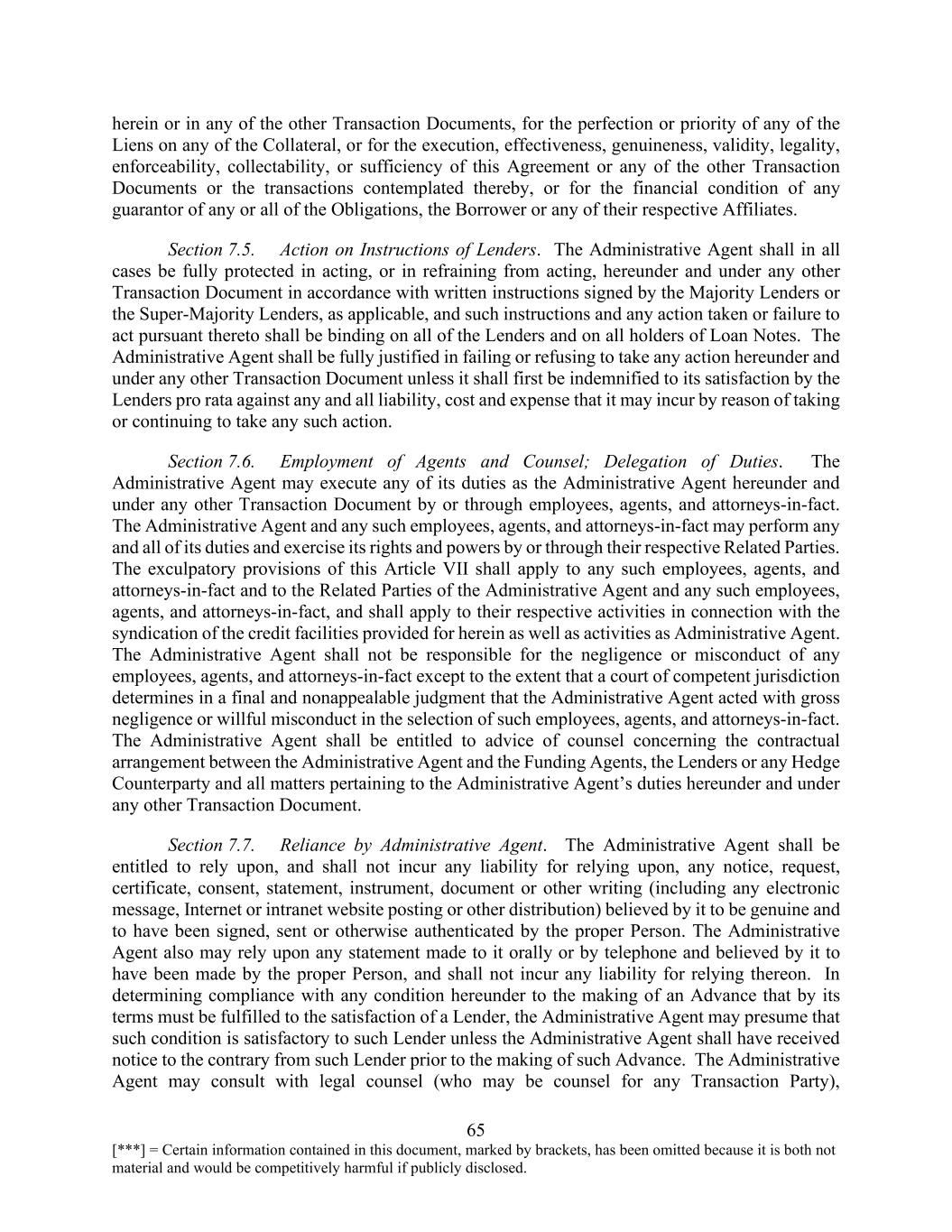 65 [***] = Certain information contained in this document, marked by brackets, has been omitted because it is both not material and would be competitively harmful if publicly disclosed. herein or in any of the other Transaction Documents, for the perfection or priority of any of the Liens on any of the Collateral, or for the execution, effectiveness, genuineness, validity, legality, enforceability, collectability, or sufficiency of this Agreement or any of the other Transaction Documents or the transactions contemplated thereby, or for the financial condition of any guarantor of any or all of the Obligations, the Borrower or any of their respective Affiliates. Section 7.5. Action on Instructions of Lenders. The Administrative Agent shall in all cases be fully protected in acting, or in refraining from acting, hereunder and under any other Transaction Document in accordance with written instructions signed by the Majority Lenders or the Super-Majority Lenders, as applicable, and such instructions and any action taken or failure to act pursuant thereto shall be binding on all of the Lenders and on all holders of Loan Notes. The Administrative Agent shall be fully justified in failing or refusing to take any action hereunder and under any other Transaction Document unless it shall first be indemnified to its satisfaction by the Lenders pro rata against any and all liability, cost and expense that it may incur by reason of taking or continuing to take any such action. Section 7.6. Employment of Agents and Counsel; Delegation of Duties. The Administrative Agent may execute any of its duties as the Administrative Agent hereunder and under any other Transaction Document by or through employees, agents, and attorneys-in-fact. The Administrative Agent and any such employees, agents, and attorneys-in-fact may perform any and all of its duties and exercise its rights and powers by or through their respective Related Parties. The exculpatory provisions of this Article VII shall apply to any such employees, agents, and attorneys-in-fact and to the Related Parties of the Administrative Agent and any such employees, agents, and attorneys-in-fact, and shall apply to their respective activities in connection with the syndication of the credit facilities provided for herein as well as activities as Administrative Agent. The Administrative Agent shall not be responsible for the negligence or misconduct of any employees, agents, and attorneys-in-fact except to the extent that a court of competent jurisdiction determines in a final and nonappealable judgment that the Administrative Agent acted with gross negligence or willful misconduct in the selection of such employees, agents, and attorneys-in-fact. The Administrative Agent shall be entitled to advice of counsel concerning the contractual arrangement between the Administrative Agent and the Funding Agents, the Lenders or any Hedge Counterparty and all matters pertaining to the Administrative Agent’s duties hereunder and under any other Transaction Document. Section 7.7. Reliance by Administrative Agent. The Administrative Agent shall be entitled to rely upon, and shall not incur any liability for relying upon, any notice, request, certificate, consent, statement, instrument, document or other writing (including any electronic message, Internet or intranet website posting or other distribution) believed by it to be genuine and to have been signed, sent or otherwise authenticated by the proper Person. The Administrative Agent also may rely upon any statement made to it orally or by telephone and believed by it to have been made by the proper Person, and shall not incur any liability for relying thereon. In determining compliance with any condition hereunder to the making of an Advance that by its terms must be fulfilled to the satisfaction of a Lender, the Administrative Agent may presume that such condition is satisfactory to such Lender unless the Administrative Agent shall have received notice to the contrary from such Lender prior to the making of such Advance. The Administrative Agent may consult with legal counsel (who may be counsel for any Transaction Party),