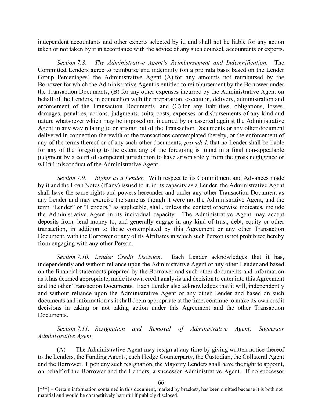 66 [***] = Certain information contained in this document, marked by brackets, has been omitted because it is both not material and would be competitively harmful if publicly disclosed. independent accountants and other experts selected by it, and shall not be liable for any action taken or not taken by it in accordance with the advice of any such counsel, accountants or experts. Section 7.8. The Administrative Agent’s Reimbursement and Indemnification. The Committed Lenders agree to reimburse and indemnify (on a pro rata basis based on the Lender Group Percentages) the Administrative Agent (A) for any amounts not reimbursed by the Borrower for which the Administrative Agent is entitled to reimbursement by the Borrower under the Transaction Documents, (B) for any other expenses incurred by the Administrative Agent on behalf of the Lenders, in connection with the preparation, execution, delivery, administration and enforcement of the Transaction Documents, and (C) for any liabilities, obligations, losses, damages, penalties, actions, judgments, suits, costs, expenses or disbursements of any kind and nature whatsoever which may be imposed on, incurred by or asserted against the Administrative Agent in any way relating to or arising out of the Transaction Documents or any other document delivered in connection therewith or the transactions contemplated thereby, or the enforcement of any of the terms thereof or of any such other documents, provided, that no Lender shall be liable for any of the foregoing to the extent any of the foregoing is found in a final non-appealable judgment by a court of competent jurisdiction to have arisen solely from the gross negligence or willful misconduct of the Administrative Agent. Section 7.9. Rights as a Lender. With respect to its Commitment and Advances made by it and the Loan Notes (if any) issued to it, in its capacity as a Lender, the Administrative Agent shall have the same rights and powers hereunder and under any other Transaction Document as any Lender and may exercise the same as though it were not the Administrative Agent, and the term “Lender” or “Lenders,” as applicable, shall, unless the context otherwise indicates, include the Administrative Agent in its individual capacity. The Administrative Agent may accept deposits from, lend money to, and generally engage in any kind of trust, debt, equity or other transaction, in addition to those contemplated by this Agreement or any other Transaction Document, with the Borrower or any of its Affiliates in which such Person is not prohibited hereby from engaging with any other Person. Section 7.10. Lender Credit Decision. Each Lender acknowledges that it has, independently and without reliance upon the Administrative Agent or any other Lender and based on the financial statements prepared by the Borrower and such other documents and information as it has deemed appropriate, made its own credit analysis and decision to enter into this Agreement and the other Transaction Documents. Each Lender also acknowledges that it will, independently and without reliance upon the Administrative Agent or any other Lender and based on such documents and information as it shall deem appropriate at the time, continue to make its own credit decisions in taking or not taking action under this Agreement and the other Transaction Documents. Section 7.11. Resignation and Removal of Administrative Agent; Successor Administrative Agent. (A) The Administrative Agent may resign at any time by giving written notice thereof to the Lenders, the Funding Agents, each Hedge Counterparty, the Custodian, the Collateral Agent and the Borrower. Upon any such resignation, the Majority Lenders shall have the right to appoint, on behalf of the Borrower and the Lenders, a successor Administrative Agent. If no successor
