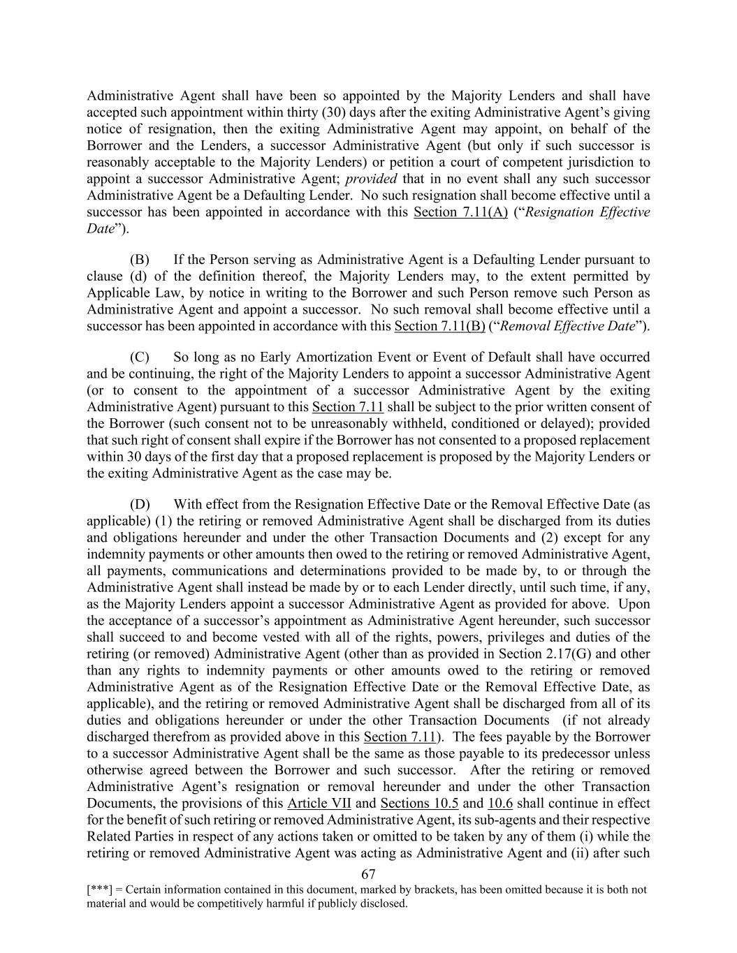 67 [***] = Certain information contained in this document, marked by brackets, has been omitted because it is both not material and would be competitively harmful if publicly disclosed. Administrative Agent shall have been so appointed by the Majority Lenders and shall have accepted such appointment within thirty (30) days after the exiting Administrative Agent’s giving notice of resignation, then the exiting Administrative Agent may appoint, on behalf of the Borrower and the Lenders, a successor Administrative Agent (but only if such successor is reasonably acceptable to the Majority Lenders) or petition a court of competent jurisdiction to appoint a successor Administrative Agent; provided that in no event shall any such successor Administrative Agent be a Defaulting Lender. No such resignation shall become effective until a successor has been appointed in accordance with this Section 7.11(A) (“Resignation Effective Date”). (B) If the Person serving as Administrative Agent is a Defaulting Lender pursuant to clause (d) of the definition thereof, the Majority Lenders may, to the extent permitted by Applicable Law, by notice in writing to the Borrower and such Person remove such Person as Administrative Agent and appoint a successor. No such removal shall become effective until a successor has been appointed in accordance with this Section 7.11(B) (“Removal Effective Date”). (C) So long as no Early Amortization Event or Event of Default shall have occurred and be continuing, the right of the Majority Lenders to appoint a successor Administrative Agent (or to consent to the appointment of a successor Administrative Agent by the exiting Administrative Agent) pursuant to this Section 7.11 shall be subject to the prior written consent of the Borrower (such consent not to be unreasonably withheld, conditioned or delayed); provided that such right of consent shall expire if the Borrower has not consented to a proposed replacement within 30 days of the first day that a proposed replacement is proposed by the Majority Lenders or the exiting Administrative Agent as the case may be. (D) With effect from the Resignation Effective Date or the Removal Effective Date (as applicable) (1) the retiring or removed Administrative Agent shall be discharged from its duties and obligations hereunder and under the other Transaction Documents and (2) except for any indemnity payments or other amounts then owed to the retiring or removed Administrative Agent, all payments, communications and determinations provided to be made by, to or through the Administrative Agent shall instead be made by or to each Lender directly, until such time, if any, as the Majority Lenders appoint a successor Administrative Agent as provided for above. Upon the acceptance of a successor’s appointment as Administrative Agent hereunder, such successor shall succeed to and become vested with all of the rights, powers, privileges and duties of the retiring (or removed) Administrative Agent (other than as provided in Section 2.17(G) and other than any rights to indemnity payments or other amounts owed to the retiring or removed Administrative Agent as of the Resignation Effective Date or the Removal Effective Date, as applicable), and the retiring or removed Administrative Agent shall be discharged from all of its duties and obligations hereunder or under the other Transaction Documents (if not already discharged therefrom as provided above in this Section 7.11). The fees payable by the Borrower to a successor Administrative Agent shall be the same as those payable to its predecessor unless otherwise agreed between the Borrower and such successor. After the retiring or removed Administrative Agent’s resignation or removal hereunder and under the other Transaction Documents, the provisions of this Article VII and Sections 10.5 and 10.6 shall continue in effect for the benefit of such retiring or removed Administrative Agent, its sub-agents and their respective Related Parties in respect of any actions taken or omitted to be taken by any of them (i) while the retiring or removed Administrative Agent was acting as Administrative Agent and (ii) after such