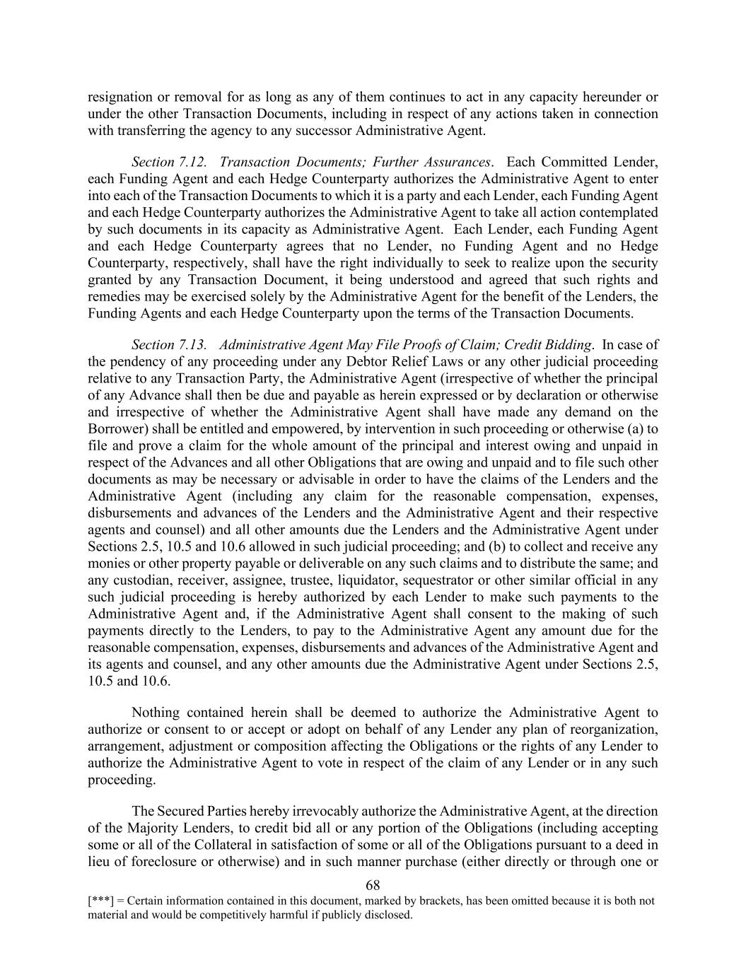 68 [***] = Certain information contained in this document, marked by brackets, has been omitted because it is both not material and would be competitively harmful if publicly disclosed. resignation or removal for as long as any of them continues to act in any capacity hereunder or under the other Transaction Documents, including in respect of any actions taken in connection with transferring the agency to any successor Administrative Agent. Section 7.12. Transaction Documents; Further Assurances. Each Committed Lender, each Funding Agent and each Hedge Counterparty authorizes the Administrative Agent to enter into each of the Transaction Documents to which it is a party and each Lender, each Funding Agent and each Hedge Counterparty authorizes the Administrative Agent to take all action contemplated by such documents in its capacity as Administrative Agent. Each Lender, each Funding Agent and each Hedge Counterparty agrees that no Lender, no Funding Agent and no Hedge Counterparty, respectively, shall have the right individually to seek to realize upon the security granted by any Transaction Document, it being understood and agreed that such rights and remedies may be exercised solely by the Administrative Agent for the benefit of the Lenders, the Funding Agents and each Hedge Counterparty upon the terms of the Transaction Documents. Section 7.13. Administrative Agent May File Proofs of Claim; Credit Bidding. In case of the pendency of any proceeding under any Debtor Relief Laws or any other judicial proceeding relative to any Transaction Party, the Administrative Agent (irrespective of whether the principal of any Advance shall then be due and payable as herein expressed or by declaration or otherwise and irrespective of whether the Administrative Agent shall have made any demand on the Borrower) shall be entitled and empowered, by intervention in such proceeding or otherwise (a) to file and prove a claim for the whole amount of the principal and interest owing and unpaid in respect of the Advances and all other Obligations that are owing and unpaid and to file such other documents as may be necessary or advisable in order to have the claims of the Lenders and the Administrative Agent (including any claim for the reasonable compensation, expenses, disbursements and advances of the Lenders and the Administrative Agent and their respective agents and counsel) and all other amounts due the Lenders and the Administrative Agent under Sections 2.5, 10.5 and 10.6 allowed in such judicial proceeding; and (b) to collect and receive any monies or other property payable or deliverable on any such claims and to distribute the same; and any custodian, receiver, assignee, trustee, liquidator, sequestrator or other similar official in any such judicial proceeding is hereby authorized by each Lender to make such payments to the Administrative Agent and, if the Administrative Agent shall consent to the making of such payments directly to the Lenders, to pay to the Administrative Agent any amount due for the reasonable compensation, expenses, disbursements and advances of the Administrative Agent and its agents and counsel, and any other amounts due the Administrative Agent under Sections 2.5, 10.5 and 10.6. Nothing contained herein shall be deemed to authorize the Administrative Agent to authorize or consent to or accept or adopt on behalf of any Lender any plan of reorganization, arrangement, adjustment or composition affecting the Obligations or the rights of any Lender to authorize the Administrative Agent to vote in respect of the claim of any Lender or in any such proceeding. The Secured Parties hereby irrevocably authorize the Administrative Agent, at the direction of the Majority Lenders, to credit bid all or any portion of the Obligations (including accepting some or all of the Collateral in satisfaction of some or all of the Obligations pursuant to a deed in lieu of foreclosure or otherwise) and in such manner purchase (either directly or through one or