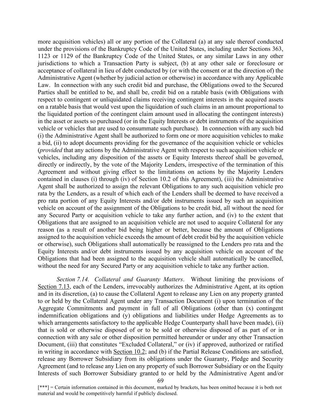 69 [***] = Certain information contained in this document, marked by brackets, has been omitted because it is both not material and would be competitively harmful if publicly disclosed. more acquisition vehicles) all or any portion of the Collateral (a) at any sale thereof conducted under the provisions of the Bankruptcy Code of the United States, including under Sections 363, 1123 or 1129 of the Bankruptcy Code of the United States, or any similar Laws in any other jurisdictions to which a Transaction Party is subject, (b) at any other sale or foreclosure or acceptance of collateral in lieu of debt conducted by (or with the consent or at the direction of) the Administrative Agent (whether by judicial action or otherwise) in accordance with any Applicable Law. In connection with any such credit bid and purchase, the Obligations owed to the Secured Parties shall be entitled to be, and shall be, credit bid on a ratable basis (with Obligations with respect to contingent or unliquidated claims receiving contingent interests in the acquired assets on a ratable basis that would vest upon the liquidation of such claims in an amount proportional to the liquidated portion of the contingent claim amount used in allocating the contingent interests) in the asset or assets so purchased (or in the Equity Interests or debt instruments of the acquisition vehicle or vehicles that are used to consummate such purchase). In connection with any such bid (i) the Administrative Agent shall be authorized to form one or more acquisition vehicles to make a bid, (ii) to adopt documents providing for the governance of the acquisition vehicle or vehicles (provided that any actions by the Administrative Agent with respect to such acquisition vehicle or vehicles, including any disposition of the assets or Equity Interests thereof shall be governed, directly or indirectly, by the vote of the Majority Lenders, irrespective of the termination of this Agreement and without giving effect to the limitations on actions by the Majority Lenders contained in clauses (i) through (iv) of Section 10.2 of this Agreement), (iii) the Administrative Agent shall be authorized to assign the relevant Obligations to any such acquisition vehicle pro rata by the Lenders, as a result of which each of the Lenders shall be deemed to have received a pro rata portion of any Equity Interests and/or debt instruments issued by such an acquisition vehicle on account of the assignment of the Obligations to be credit bid, all without the need for any Secured Party or acquisition vehicle to take any further action, and (iv) to the extent that Obligations that are assigned to an acquisition vehicle are not used to acquire Collateral for any reason (as a result of another bid being higher or better, because the amount of Obligations assigned to the acquisition vehicle exceeds the amount of debt credit bid by the acquisition vehicle or otherwise), such Obligations shall automatically be reassigned to the Lenders pro rata and the Equity Interests and/or debt instruments issued by any acquisition vehicle on account of the Obligations that had been assigned to the acquisition vehicle shall automatically be cancelled, without the need for any Secured Party or any acquisition vehicle to take any further action. Section 7.14. Collateral and Guaranty Matters. Without limiting the provisions of Section 7.13, each of the Lenders, irrevocably authorizes the Administrative Agent, at its option and in its discretion, (a) to cause the Collateral Agent to release any Lien on any property granted to or held by the Collateral Agent under any Transaction Document (i) upon termination of the Aggregate Commitments and payment in full of all Obligations (other than (x) contingent indemnification obligations and (y) obligations and liabilities under Hedge Agreements as to which arrangements satisfactory to the applicable Hedge Counterparty shall have been made), (ii) that is sold or otherwise disposed of or to be sold or otherwise disposed of as part of or in connection with any sale or other disposition permitted hereunder or under any other Transaction Document, (iii) that constitutes “Excluded Collateral,” or (iv) if approved, authorized or ratified in writing in accordance with Section 10.2; and (b) if the Partial Release Conditions are satisfied, release any Borrower Subsidiary from its obligations under the Guaranty, Pledge and Security Agreement (and to release any Lien on any property of such Borrower Subsidiary or on the Equity Interests of such Borrower Subsidiary granted to or held by the Administrative Agent and/or