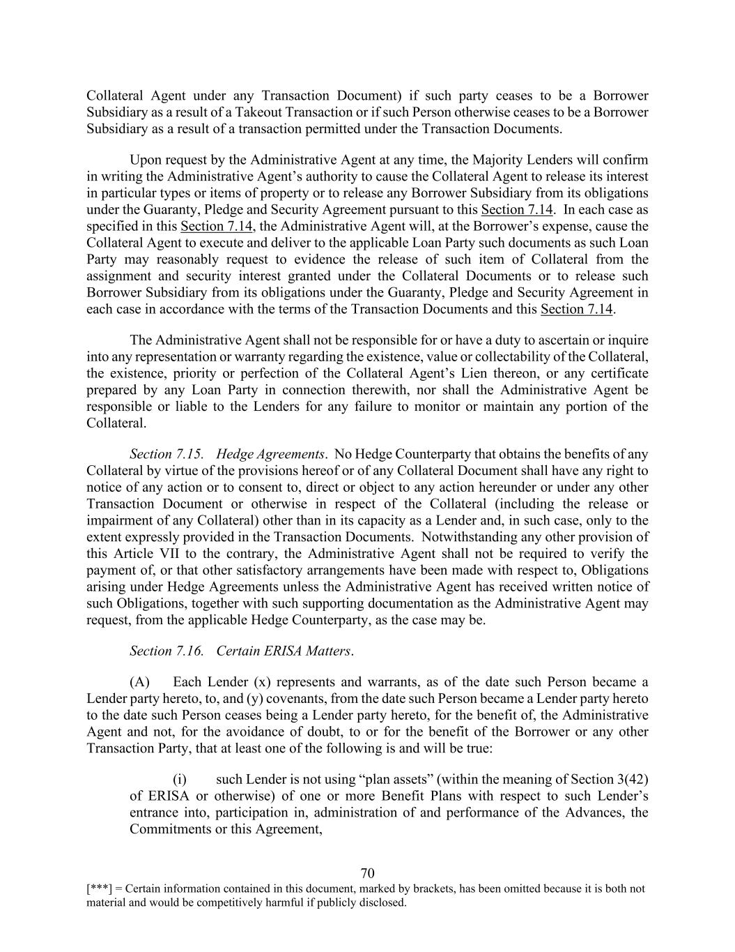 70 [***] = Certain information contained in this document, marked by brackets, has been omitted because it is both not material and would be competitively harmful if publicly disclosed. Collateral Agent under any Transaction Document) if such party ceases to be a Borrower Subsidiary as a result of a Takeout Transaction or if such Person otherwise ceases to be a Borrower Subsidiary as a result of a transaction permitted under the Transaction Documents. Upon request by the Administrative Agent at any time, the Majority Lenders will confirm in writing the Administrative Agent’s authority to cause the Collateral Agent to release its interest in particular types or items of property or to release any Borrower Subsidiary from its obligations under the Guaranty, Pledge and Security Agreement pursuant to this Section 7.14. In each case as specified in this Section 7.14, the Administrative Agent will, at the Borrower’s expense, cause the Collateral Agent to execute and deliver to the applicable Loan Party such documents as such Loan Party may reasonably request to evidence the release of such item of Collateral from the assignment and security interest granted under the Collateral Documents or to release such Borrower Subsidiary from its obligations under the Guaranty, Pledge and Security Agreement in each case in accordance with the terms of the Transaction Documents and this Section 7.14. The Administrative Agent shall not be responsible for or have a duty to ascertain or inquire into any representation or warranty regarding the existence, value or collectability of the Collateral, the existence, priority or perfection of the Collateral Agent’s Lien thereon, or any certificate prepared by any Loan Party in connection therewith, nor shall the Administrative Agent be responsible or liable to the Lenders for any failure to monitor or maintain any portion of the Collateral. Section 7.15. Hedge Agreements. No Hedge Counterparty that obtains the benefits of any Collateral by virtue of the provisions hereof or of any Collateral Document shall have any right to notice of any action or to consent to, direct or object to any action hereunder or under any other Transaction Document or otherwise in respect of the Collateral (including the release or impairment of any Collateral) other than in its capacity as a Lender and, in such case, only to the extent expressly provided in the Transaction Documents. Notwithstanding any other provision of this Article VII to the contrary, the Administrative Agent shall not be required to verify the payment of, or that other satisfactory arrangements have been made with respect to, Obligations arising under Hedge Agreements unless the Administrative Agent has received written notice of such Obligations, together with such supporting documentation as the Administrative Agent may request, from the applicable Hedge Counterparty, as the case may be. Section 7.16. Certain ERISA Matters. (A) Each Lender (x) represents and warrants, as of the date such Person became a Lender party hereto, to, and (y) covenants, from the date such Person became a Lender party hereto to the date such Person ceases being a Lender party hereto, for the benefit of, the Administrative Agent and not, for the avoidance of doubt, to or for the benefit of the Borrower or any other Transaction Party, that at least one of the following is and will be true: (i) such Lender is not using “plan assets” (within the meaning of Section 3(42) of ERISA or otherwise) of one or more Benefit Plans with respect to such Lender’s entrance into, participation in, administration of and performance of the Advances, the Commitments or this Agreement,