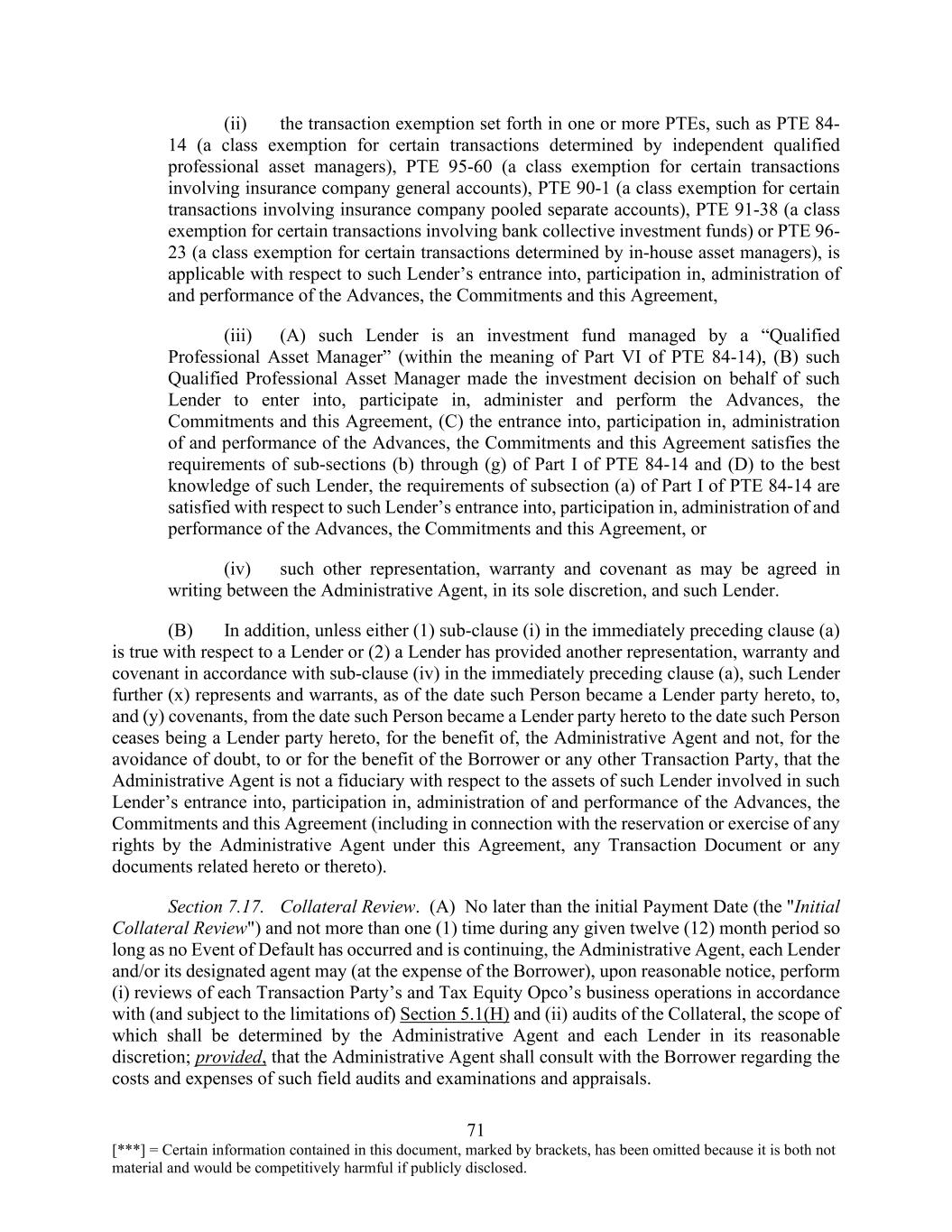 71 [***] = Certain information contained in this document, marked by brackets, has been omitted because it is both not material and would be competitively harmful if publicly disclosed. (ii) the transaction exemption set forth in one or more PTEs, such as PTE 84- 14 (a class exemption for certain transactions determined by independent qualified professional asset managers), PTE 95-60 (a class exemption for certain transactions involving insurance company general accounts), PTE 90-1 (a class exemption for certain transactions involving insurance company pooled separate accounts), PTE 91-38 (a class exemption for certain transactions involving bank collective investment funds) or PTE 96- 23 (a class exemption for certain transactions determined by in-house asset managers), is applicable with respect to such Lender’s entrance into, participation in, administration of and performance of the Advances, the Commitments and this Agreement, (iii) (A) such Lender is an investment fund managed by a “Qualified Professional Asset Manager” (within the meaning of Part VI of PTE 84-14), (B) such Qualified Professional Asset Manager made the investment decision on behalf of such Lender to enter into, participate in, administer and perform the Advances, the Commitments and this Agreement, (C) the entrance into, participation in, administration of and performance of the Advances, the Commitments and this Agreement satisfies the requirements of sub-sections (b) through (g) of Part I of PTE 84-14 and (D) to the best knowledge of such Lender, the requirements of subsection (a) of Part I of PTE 84-14 are satisfied with respect to such Lender’s entrance into, participation in, administration of and performance of the Advances, the Commitments and this Agreement, or (iv) such other representation, warranty and covenant as may be agreed in writing between the Administrative Agent, in its sole discretion, and such Lender. (B) In addition, unless either (1) sub-clause (i) in the immediately preceding clause (a) is true with respect to a Lender or (2) a Lender has provided another representation, warranty and covenant in accordance with sub-clause (iv) in the immediately preceding clause (a), such Lender further (x) represents and warrants, as of the date such Person became a Lender party hereto, to, and (y) covenants, from the date such Person became a Lender party hereto to the date such Person ceases being a Lender party hereto, for the benefit of, the Administrative Agent and not, for the avoidance of doubt, to or for the benefit of the Borrower or any other Transaction Party, that the Administrative Agent is not a fiduciary with respect to the assets of such Lender involved in such Lender’s entrance into, participation in, administration of and performance of the Advances, the Commitments and this Agreement (including in connection with the reservation or exercise of any rights by the Administrative Agent under this Agreement, any Transaction Document or any documents related hereto or thereto). Section 7.17. Collateral Review. (A) No later than the initial Payment Date (the "Initial Collateral Review") and not more than one (1) time during any given twelve (12) month period so long as no Event of Default has occurred and is continuing, the Administrative Agent, each Lender and/or its designated agent may (at the expense of the Borrower), upon reasonable notice, perform (i) reviews of each Transaction Party’s and Tax Equity Opco’s business operations in accordance with (and subject to the limitations of) Section 5.1(H) and (ii) audits of the Collateral, the scope of which shall be determined by the Administrative Agent and each Lender in its reasonable discretion; provided, that the Administrative Agent shall consult with the Borrower regarding the costs and expenses of such field audits and examinations and appraisals.