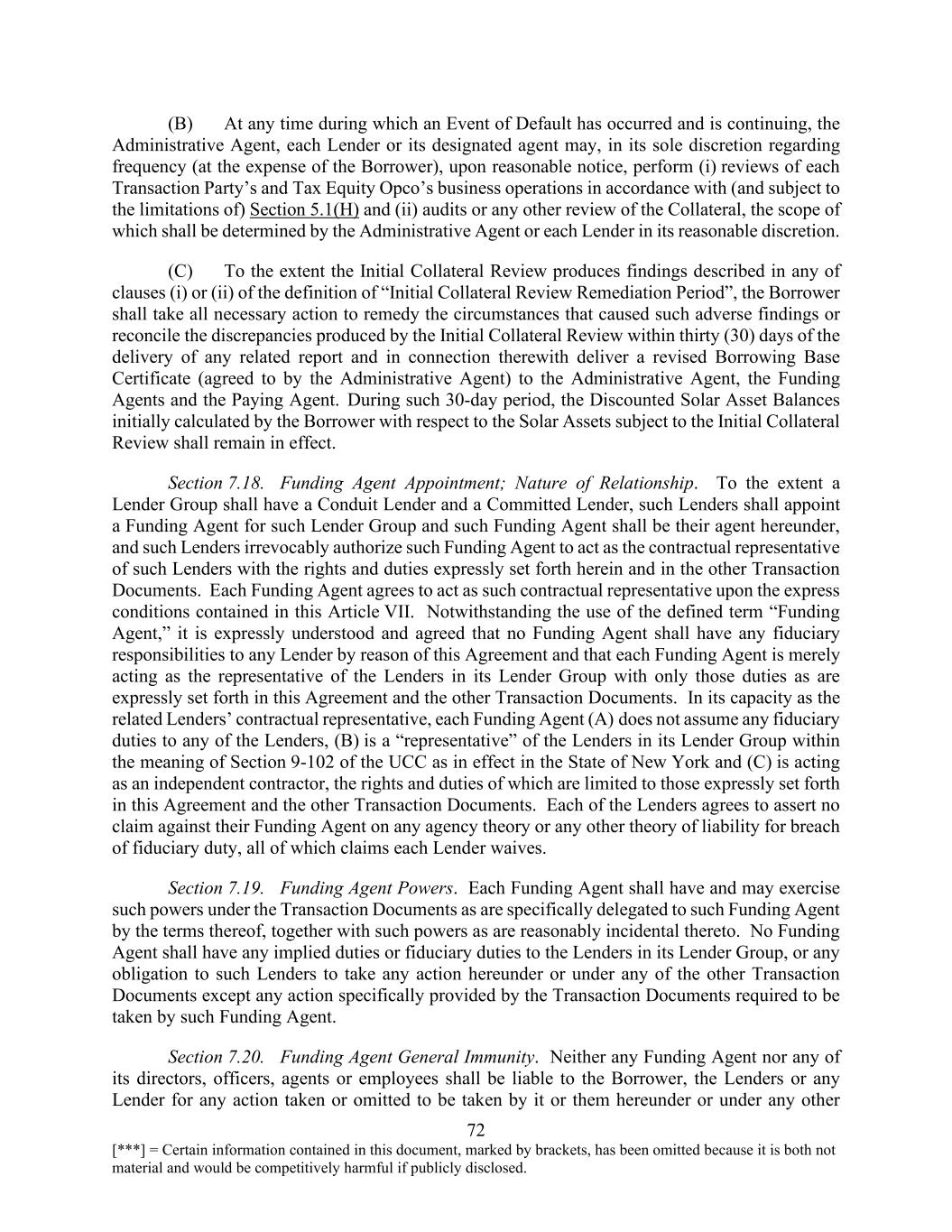 72 [***] = Certain information contained in this document, marked by brackets, has been omitted because it is both not material and would be competitively harmful if publicly disclosed. (B) At any time during which an Event of Default has occurred and is continuing, the Administrative Agent, each Lender or its designated agent may, in its sole discretion regarding frequency (at the expense of the Borrower), upon reasonable notice, perform (i) reviews of each Transaction Party’s and Tax Equity Opco’s business operations in accordance with (and subject to the limitations of) Section 5.1(H) and (ii) audits or any other review of the Collateral, the scope of which shall be determined by the Administrative Agent or each Lender in its reasonable discretion. (C) To the extent the Initial Collateral Review produces findings described in any of clauses (i) or (ii) of the definition of “Initial Collateral Review Remediation Period”, the Borrower shall take all necessary action to remedy the circumstances that caused such adverse findings or reconcile the discrepancies produced by the Initial Collateral Review within thirty (30) days of the delivery of any related report and in connection therewith deliver a revised Borrowing Base Certificate (agreed to by the Administrative Agent) to the Administrative Agent, the Funding Agents and the Paying Agent. During such 30-day period, the Discounted Solar Asset Balances initially calculated by the Borrower with respect to the Solar Assets subject to the Initial Collateral Review shall remain in effect. Section 7.18. Funding Agent Appointment; Nature of Relationship. To the extent a Lender Group shall have a Conduit Lender and a Committed Lender, such Lenders shall appoint a Funding Agent for such Lender Group and such Funding Agent shall be their agent hereunder, and such Lenders irrevocably authorize such Funding Agent to act as the contractual representative of such Lenders with the rights and duties expressly set forth herein and in the other Transaction Documents. Each Funding Agent agrees to act as such contractual representative upon the express conditions contained in this Article VII. Notwithstanding the use of the defined term “Funding Agent,” it is expressly understood and agreed that no Funding Agent shall have any fiduciary responsibilities to any Lender by reason of this Agreement and that each Funding Agent is merely acting as the representative of the Lenders in its Lender Group with only those duties as are expressly set forth in this Agreement and the other Transaction Documents. In its capacity as the related Lenders’ contractual representative, each Funding Agent (A) does not assume any fiduciary duties to any of the Lenders, (B) is a “representative” of the Lenders in its Lender Group within the meaning of Section 9-102 of the UCC as in effect in the State of New York and (C) is acting as an independent contractor, the rights and duties of which are limited to those expressly set forth in this Agreement and the other Transaction Documents. Each of the Lenders agrees to assert no claim against their Funding Agent on any agency theory or any other theory of liability for breach of fiduciary duty, all of which claims each Lender waives. Section 7.19. Funding Agent Powers. Each Funding Agent shall have and may exercise such powers under the Transaction Documents as are specifically delegated to such Funding Agent by the terms thereof, together with such powers as are reasonably incidental thereto. No Funding Agent shall have any implied duties or fiduciary duties to the Lenders in its Lender Group, or any obligation to such Lenders to take any action hereunder or under any of the other Transaction Documents except any action specifically provided by the Transaction Documents required to be taken by such Funding Agent. Section 7.20. Funding Agent General Immunity. Neither any Funding Agent nor any of its directors, officers, agents or employees shall be liable to the Borrower, the Lenders or any Lender for any action taken or omitted to be taken by it or them hereunder or under any other
