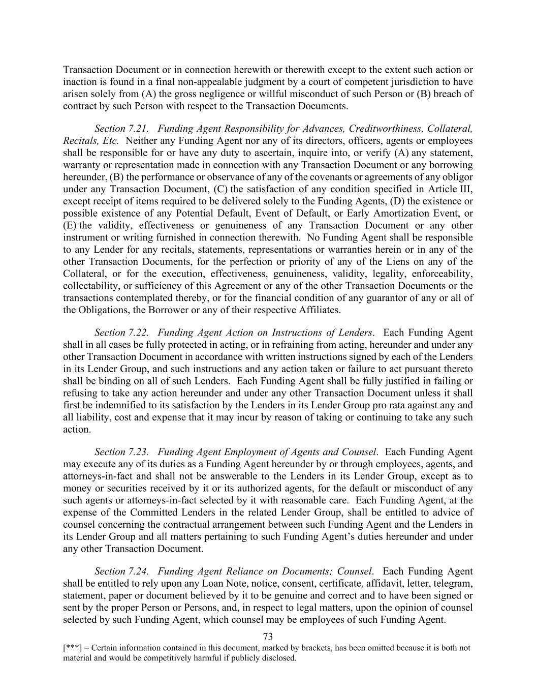 73 [***] = Certain information contained in this document, marked by brackets, has been omitted because it is both not material and would be competitively harmful if publicly disclosed. Transaction Document or in connection herewith or therewith except to the extent such action or inaction is found in a final non-appealable judgment by a court of competent jurisdiction to have arisen solely from (A) the gross negligence or willful misconduct of such Person or (B) breach of contract by such Person with respect to the Transaction Documents. Section 7.21. Funding Agent Responsibility for Advances, Creditworthiness, Collateral, Recitals, Etc. Neither any Funding Agent nor any of its directors, officers, agents or employees shall be responsible for or have any duty to ascertain, inquire into, or verify (A) any statement, warranty or representation made in connection with any Transaction Document or any borrowing hereunder, (B) the performance or observance of any of the covenants or agreements of any obligor under any Transaction Document, (C) the satisfaction of any condition specified in Article III, except receipt of items required to be delivered solely to the Funding Agents, (D) the existence or possible existence of any Potential Default, Event of Default, or Early Amortization Event, or (E) the validity, effectiveness or genuineness of any Transaction Document or any other instrument or writing furnished in connection therewith. No Funding Agent shall be responsible to any Lender for any recitals, statements, representations or warranties herein or in any of the other Transaction Documents, for the perfection or priority of any of the Liens on any of the Collateral, or for the execution, effectiveness, genuineness, validity, legality, enforceability, collectability, or sufficiency of this Agreement or any of the other Transaction Documents or the transactions contemplated thereby, or for the financial condition of any guarantor of any or all of the Obligations, the Borrower or any of their respective Affiliates. Section 7.22. Funding Agent Action on Instructions of Lenders. Each Funding Agent shall in all cases be fully protected in acting, or in refraining from acting, hereunder and under any other Transaction Document in accordance with written instructions signed by each of the Lenders in its Lender Group, and such instructions and any action taken or failure to act pursuant thereto shall be binding on all of such Lenders. Each Funding Agent shall be fully justified in failing or refusing to take any action hereunder and under any other Transaction Document unless it shall first be indemnified to its satisfaction by the Lenders in its Lender Group pro rata against any and all liability, cost and expense that it may incur by reason of taking or continuing to take any such action. Section 7.23. Funding Agent Employment of Agents and Counsel. Each Funding Agent may execute any of its duties as a Funding Agent hereunder by or through employees, agents, and attorneys-in-fact and shall not be answerable to the Lenders in its Lender Group, except as to money or securities received by it or its authorized agents, for the default or misconduct of any such agents or attorneys-in-fact selected by it with reasonable care. Each Funding Agent, at the expense of the Committed Lenders in the related Lender Group, shall be entitled to advice of counsel concerning the contractual arrangement between such Funding Agent and the Lenders in its Lender Group and all matters pertaining to such Funding Agent’s duties hereunder and under any other Transaction Document. Section 7.24. Funding Agent Reliance on Documents; Counsel. Each Funding Agent shall be entitled to rely upon any Loan Note, notice, consent, certificate, affidavit, letter, telegram, statement, paper or document believed by it to be genuine and correct and to have been signed or sent by the proper Person or Persons, and, in respect to legal matters, upon the opinion of counsel selected by such Funding Agent, which counsel may be employees of such Funding Agent.