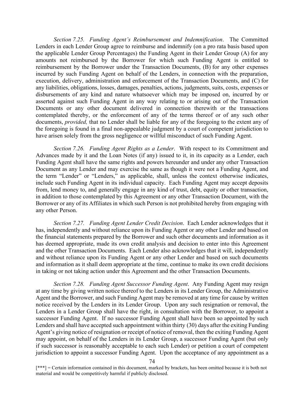 74 [***] = Certain information contained in this document, marked by brackets, has been omitted because it is both not material and would be competitively harmful if publicly disclosed. Section 7.25. Funding Agent’s Reimbursement and Indemnification. The Committed Lenders in each Lender Group agree to reimburse and indemnify (on a pro rata basis based upon the applicable Lender Group Percentages) the Funding Agent in their Lender Group (A) for any amounts not reimbursed by the Borrower for which such Funding Agent is entitled to reimbursement by the Borrower under the Transaction Documents, (B) for any other expenses incurred by such Funding Agent on behalf of the Lenders, in connection with the preparation, execution, delivery, administration and enforcement of the Transaction Documents, and (C) for any liabilities, obligations, losses, damages, penalties, actions, judgments, suits, costs, expenses or disbursements of any kind and nature whatsoever which may be imposed on, incurred by or asserted against such Funding Agent in any way relating to or arising out of the Transaction Documents or any other document delivered in connection therewith or the transactions contemplated thereby, or the enforcement of any of the terms thereof or of any such other documents, provided, that no Lender shall be liable for any of the foregoing to the extent any of the foregoing is found in a final non-appealable judgment by a court of competent jurisdiction to have arisen solely from the gross negligence or willful misconduct of such Funding Agent. Section 7.26. Funding Agent Rights as a Lender. With respect to its Commitment and Advances made by it and the Loan Notes (if any) issued to it, in its capacity as a Lender, each Funding Agent shall have the same rights and powers hereunder and under any other Transaction Document as any Lender and may exercise the same as though it were not a Funding Agent, and the term “Lender” or “Lenders,” as applicable, shall, unless the context otherwise indicates, include such Funding Agent in its individual capacity. Each Funding Agent may accept deposits from, lend money to, and generally engage in any kind of trust, debt, equity or other transaction, in addition to those contemplated by this Agreement or any other Transaction Document, with the Borrower or any of its Affiliates in which such Person is not prohibited hereby from engaging with any other Person. Section 7.27. Funding Agent Lender Credit Decision. Each Lender acknowledges that it has, independently and without reliance upon its Funding Agent or any other Lender and based on the financial statements prepared by the Borrower and such other documents and information as it has deemed appropriate, made its own credit analysis and decision to enter into this Agreement and the other Transaction Documents. Each Lender also acknowledges that it will, independently and without reliance upon its Funding Agent or any other Lender and based on such documents and information as it shall deem appropriate at the time, continue to make its own credit decisions in taking or not taking action under this Agreement and the other Transaction Documents. Section 7.28. Funding Agent Successor Funding Agent. Any Funding Agent may resign at any time by giving written notice thereof to the Lenders in its Lender Group, the Administrative Agent and the Borrower, and such Funding Agent may be removed at any time for cause by written notice received by the Lenders in its Lender Group. Upon any such resignation or removal, the Lenders in a Lender Group shall have the right, in consultation with the Borrower, to appoint a successor Funding Agent. If no successor Funding Agent shall have been so appointed by such Lenders and shall have accepted such appointment within thirty (30) days after the exiting Funding Agent’s giving notice of resignation or receipt of notice of removal, then the exiting Funding Agent may appoint, on behalf of the Lenders in its Lender Group, a successor Funding Agent (but only if such successor is reasonably acceptable to each such Lender) or petition a court of competent jurisdiction to appoint a successor Funding Agent. Upon the acceptance of any appointment as a