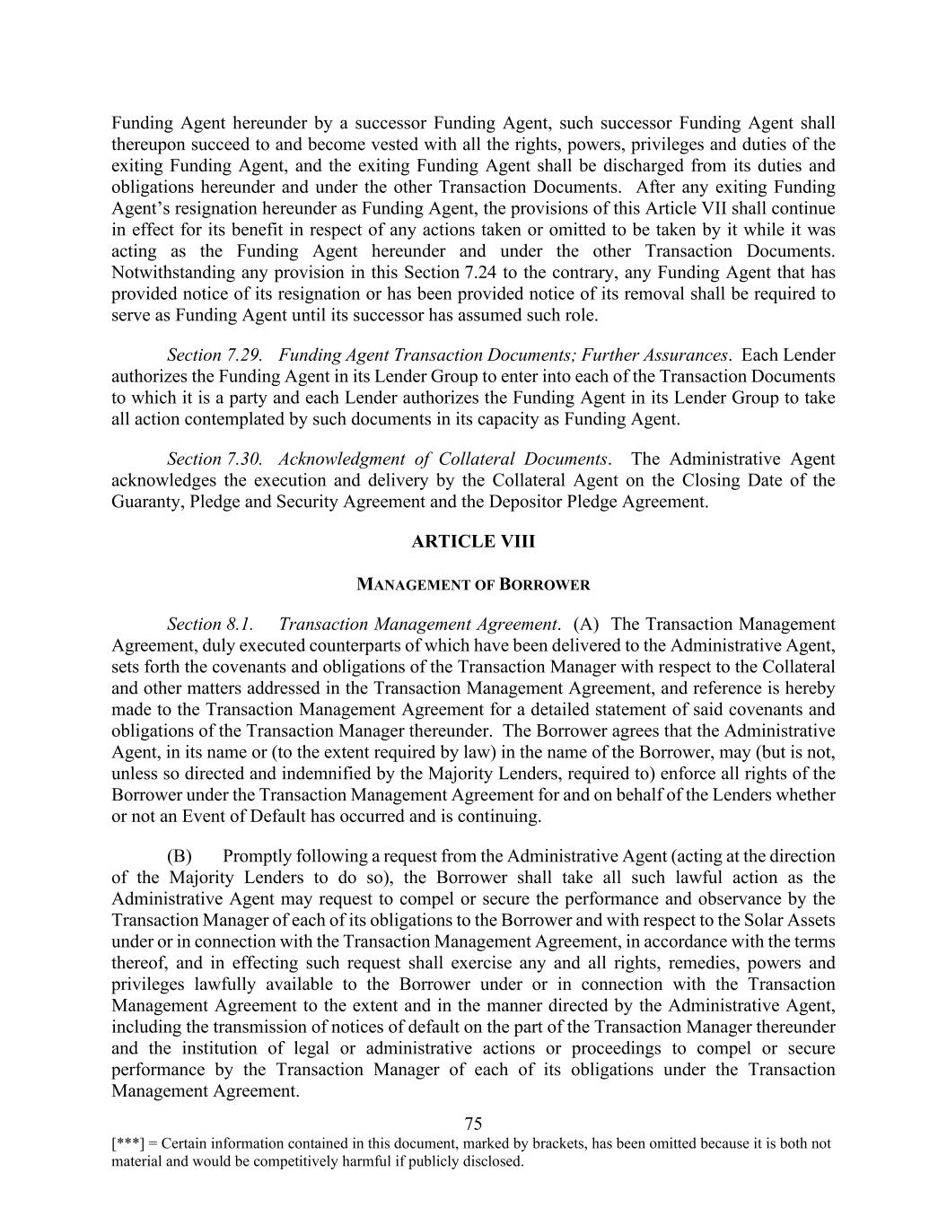 75 [***] = Certain information contained in this document, marked by brackets, has been omitted because it is both not material and would be competitively harmful if publicly disclosed. Funding Agent hereunder by a successor Funding Agent, such successor Funding Agent shall thereupon succeed to and become vested with all the rights, powers, privileges and duties of the exiting Funding Agent, and the exiting Funding Agent shall be discharged from its duties and obligations hereunder and under the other Transaction Documents. After any exiting Funding Agent’s resignation hereunder as Funding Agent, the provisions of this Article VII shall continue in effect for its benefit in respect of any actions taken or omitted to be taken by it while it was acting as the Funding Agent hereunder and under the other Transaction Documents. Notwithstanding any provision in this Section 7.24 to the contrary, any Funding Agent that has provided notice of its resignation or has been provided notice of its removal shall be required to serve as Funding Agent until its successor has assumed such role. Section 7.29. Funding Agent Transaction Documents; Further Assurances. Each Lender authorizes the Funding Agent in its Lender Group to enter into each of the Transaction Documents to which it is a party and each Lender authorizes the Funding Agent in its Lender Group to take all action contemplated by such documents in its capacity as Funding Agent. Section 7.30. Acknowledgment of Collateral Documents. The Administrative Agent acknowledges the execution and delivery by the Collateral Agent on the Closing Date of the Guaranty, Pledge and Security Agreement and the Depositor Pledge Agreement. ARTICLE VIII MANAGEMENT OF BORROWER Section 8.1. Transaction Management Agreement. (A) The Transaction Management Agreement, duly executed counterparts of which have been delivered to the Administrative Agent, sets forth the covenants and obligations of the Transaction Manager with respect to the Collateral and other matters addressed in the Transaction Management Agreement, and reference is hereby made to the Transaction Management Agreement for a detailed statement of said covenants and obligations of the Transaction Manager thereunder. The Borrower agrees that the Administrative Agent, in its name or (to the extent required by law) in the name of the Borrower, may (but is not, unless so directed and indemnified by the Majority Lenders, required to) enforce all rights of the Borrower under the Transaction Management Agreement for and on behalf of the Lenders whether or not an Event of Default has occurred and is continuing. (B) Promptly following a request from the Administrative Agent (acting at the direction of the Majority Lenders to do so), the Borrower shall take all such lawful action as the Administrative Agent may request to compel or secure the performance and observance by the Transaction Manager of each of its obligations to the Borrower and with respect to the Solar Assets under or in connection with the Transaction Management Agreement, in accordance with the terms thereof, and in effecting such request shall exercise any and all rights, remedies, powers and privileges lawfully available to the Borrower under or in connection with the Transaction Management Agreement to the extent and in the manner directed by the Administrative Agent, including the transmission of notices of default on the part of the Transaction Manager thereunder and the institution of legal or administrative actions or proceedings to compel or secure performance by the Transaction Manager of each of its obligations under the Transaction Management Agreement.