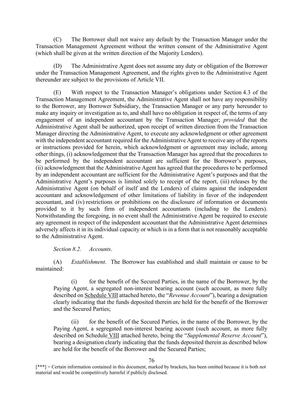 76 [***] = Certain information contained in this document, marked by brackets, has been omitted because it is both not material and would be competitively harmful if publicly disclosed. (C) The Borrower shall not waive any default by the Transaction Manager under the Transaction Management Agreement without the written consent of the Administrative Agent (which shall be given at the written direction of the Majority Lenders). (D) The Administrative Agent does not assume any duty or obligation of the Borrower under the Transaction Management Agreement, and the rights given to the Administrative Agent thereunder are subject to the provisions of Article VII. (E) With respect to the Transaction Manager’s obligations under Section 4.3 of the Transaction Management Agreement, the Administrative Agent shall not have any responsibility to the Borrower, any Borrower Subsidiary, the Transaction Manager or any party hereunder to make any inquiry or investigation as to, and shall have no obligation in respect of, the terms of any engagement of an independent accountant by the Transaction Manager; provided that the Administrative Agent shall be authorized, upon receipt of written direction from the Transaction Manager directing the Administrative Agent, to execute any acknowledgment or other agreement with the independent accountant required for the Administrative Agent to receive any of the reports or instructions provided for herein, which acknowledgment or agreement may include, among other things, (i) acknowledgement that the Transaction Manager has agreed that the procedures to be performed by the independent accountant are sufficient for the Borrower’s purposes, (ii) acknowledgment that the Administrative Agent has agreed that the procedures to be performed by an independent accountant are sufficient for the Administrative Agent’s purposes and that the Administrative Agent’s purposes is limited solely to receipt of the report, (iii) releases by the Administrative Agent (on behalf of itself and the Lenders) of claims against the independent accountant and acknowledgement of other limitations of liability in favor of the independent accountant, and (iv) restrictions or prohibitions on the disclosure of information or documents provided to it by such firm of independent accountants (including to the Lenders). Notwithstanding the foregoing, in no event shall the Administrative Agent be required to execute any agreement in respect of the independent accountant that the Administrative Agent determines adversely affects it in its individual capacity or which is in a form that is not reasonably acceptable to the Administrative Agent. Section 8.2. Accounts. (A) Establishment. The Borrower has established and shall maintain or cause to be maintained: (i) for the benefit of the Secured Parties, in the name of the Borrower, by the Paying Agent, a segregated non-interest bearing account (such account, as more fully described on Schedule VIII attached hereto, the “Revenue Account”), bearing a designation clearly indicating that the funds deposited therein are held for the benefit of the Borrower and the Secured Parties; (ii) for the benefit of the Secured Parties, in the name of the Borrower, by the Paying Agent, a segregated non-interest bearing account (such account, as more fully described on Schedule VIII attached hereto, being the “Supplemental Reserve Account”), bearing a designation clearly indicating that the funds deposited therein as described below are held for the benefit of the Borrower and the Secured Parties;