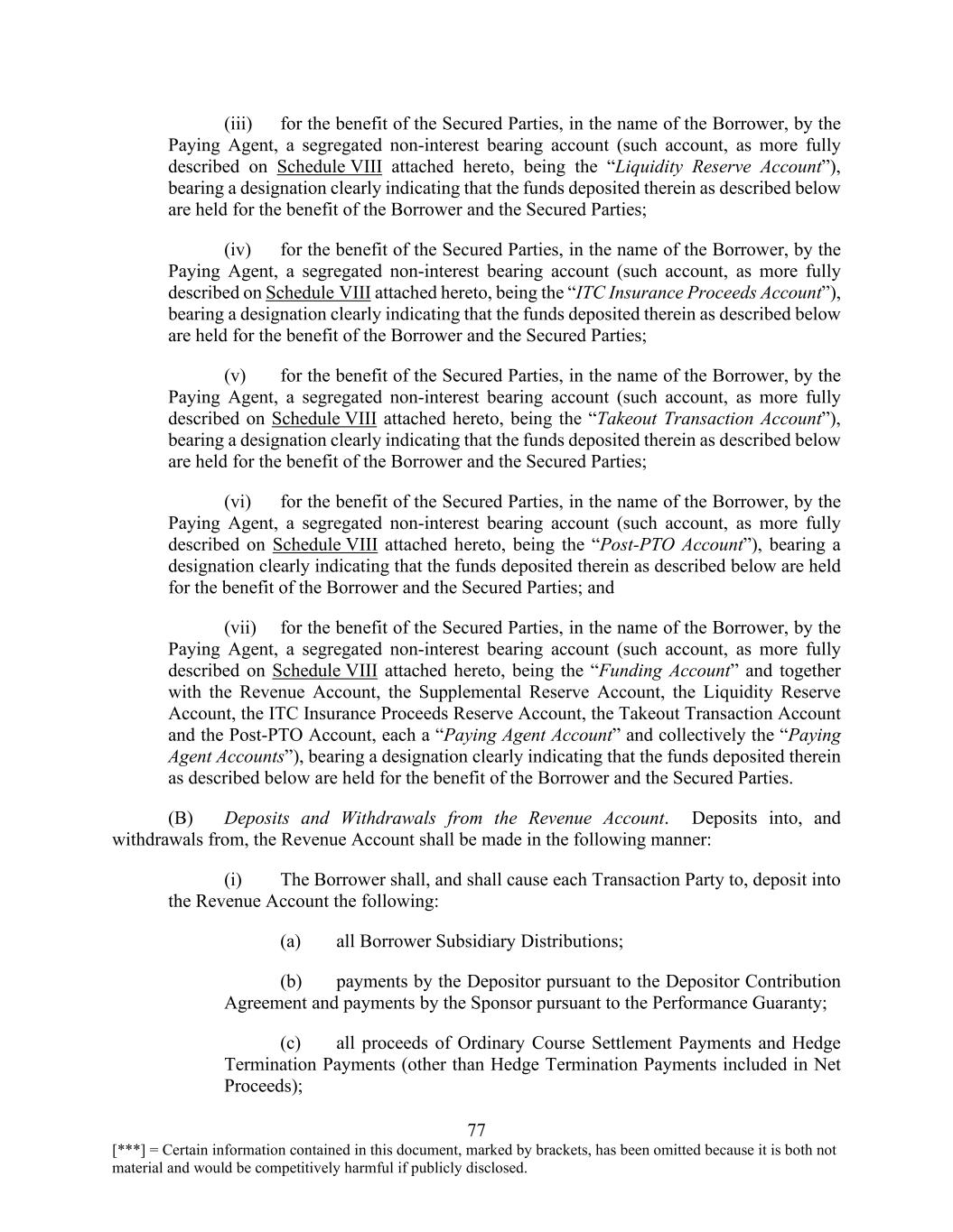 77 [***] = Certain information contained in this document, marked by brackets, has been omitted because it is both not material and would be competitively harmful if publicly disclosed. (iii) for the benefit of the Secured Parties, in the name of the Borrower, by the Paying Agent, a segregated non-interest bearing account (such account, as more fully described on Schedule VIII attached hereto, being the “Liquidity Reserve Account”), bearing a designation clearly indicating that the funds deposited therein as described below are held for the benefit of the Borrower and the Secured Parties; (iv) for the benefit of the Secured Parties, in the name of the Borrower, by the Paying Agent, a segregated non-interest bearing account (such account, as more fully described on Schedule VIII attached hereto, being the “ITC Insurance Proceeds Account”), bearing a designation clearly indicating that the funds deposited therein as described below are held for the benefit of the Borrower and the Secured Parties; (v) for the benefit of the Secured Parties, in the name of the Borrower, by the Paying Agent, a segregated non-interest bearing account (such account, as more fully described on Schedule VIII attached hereto, being the “Takeout Transaction Account”), bearing a designation clearly indicating that the funds deposited therein as described below are held for the benefit of the Borrower and the Secured Parties; (vi) for the benefit of the Secured Parties, in the name of the Borrower, by the Paying Agent, a segregated non-interest bearing account (such account, as more fully described on Schedule VIII attached hereto, being the “Post-PTO Account”), bearing a designation clearly indicating that the funds deposited therein as described below are held for the benefit of the Borrower and the Secured Parties; and (vii) for the benefit of the Secured Parties, in the name of the Borrower, by the Paying Agent, a segregated non-interest bearing account (such account, as more fully described on Schedule VIII attached hereto, being the “Funding Account” and together with the Revenue Account, the Supplemental Reserve Account, the Liquidity Reserve Account, the ITC Insurance Proceeds Reserve Account, the Takeout Transaction Account and the Post-PTO Account, each a “Paying Agent Account” and collectively the “Paying Agent Accounts”), bearing a designation clearly indicating that the funds deposited therein as described below are held for the benefit of the Borrower and the Secured Parties. (B) Deposits and Withdrawals from the Revenue Account. Deposits into, and withdrawals from, the Revenue Account shall be made in the following manner: (i) The Borrower shall, and shall cause each Transaction Party to, deposit into the Revenue Account the following: (a) all Borrower Subsidiary Distributions; (b) payments by the Depositor pursuant to the Depositor Contribution Agreement and payments by the Sponsor pursuant to the Performance Guaranty; (c) all proceeds of Ordinary Course Settlement Payments and Hedge Termination Payments (other than Hedge Termination Payments included in Net Proceeds);