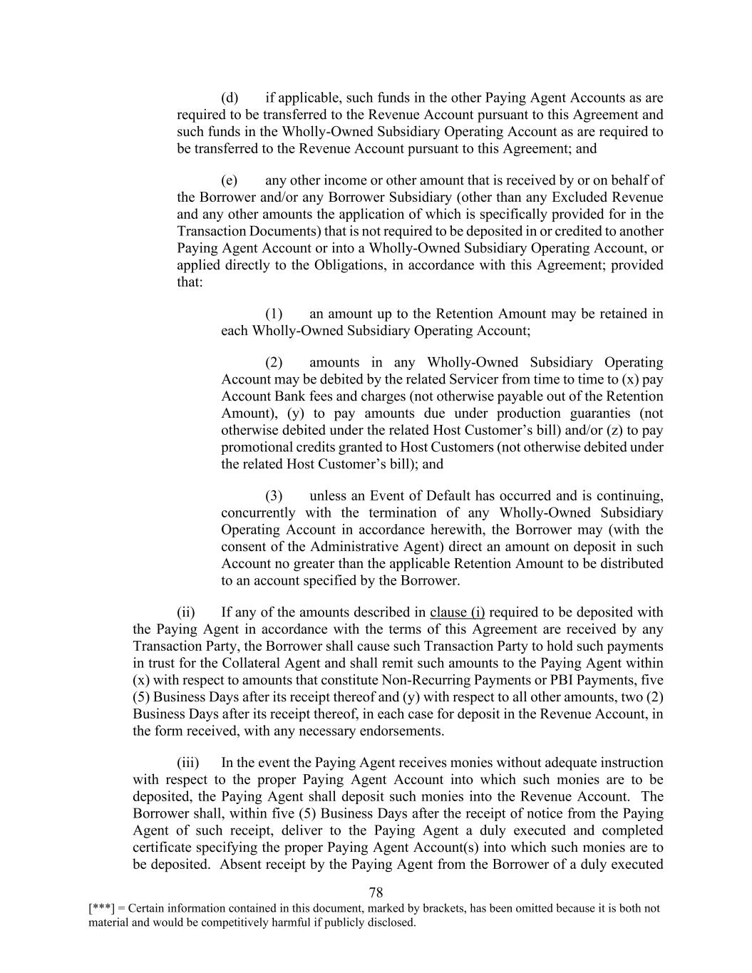 78 [***] = Certain information contained in this document, marked by brackets, has been omitted because it is both not material and would be competitively harmful if publicly disclosed. (d) if applicable, such funds in the other Paying Agent Accounts as are required to be transferred to the Revenue Account pursuant to this Agreement and such funds in the Wholly-Owned Subsidiary Operating Account as are required to be transferred to the Revenue Account pursuant to this Agreement; and (e) any other income or other amount that is received by or on behalf of the Borrower and/or any Borrower Subsidiary (other than any Excluded Revenue and any other amounts the application of which is specifically provided for in the Transaction Documents) that is not required to be deposited in or credited to another Paying Agent Account or into a Wholly-Owned Subsidiary Operating Account, or applied directly to the Obligations, in accordance with this Agreement; provided that: (1) an amount up to the Retention Amount may be retained in each Wholly-Owned Subsidiary Operating Account; (2) amounts in any Wholly-Owned Subsidiary Operating Account may be debited by the related Servicer from time to time to (x) pay Account Bank fees and charges (not otherwise payable out of the Retention Amount), (y) to pay amounts due under production guaranties (not otherwise debited under the related Host Customer’s bill) and/or (z) to pay promotional credits granted to Host Customers (not otherwise debited under the related Host Customer’s bill); and (3) unless an Event of Default has occurred and is continuing, concurrently with the termination of any Wholly-Owned Subsidiary Operating Account in accordance herewith, the Borrower may (with the consent of the Administrative Agent) direct an amount on deposit in such Account no greater than the applicable Retention Amount to be distributed to an account specified by the Borrower. (ii) If any of the amounts described in clause (i) required to be deposited with the Paying Agent in accordance with the terms of this Agreement are received by any Transaction Party, the Borrower shall cause such Transaction Party to hold such payments in trust for the Collateral Agent and shall remit such amounts to the Paying Agent within (x) with respect to amounts that constitute Non-Recurring Payments or PBI Payments, five (5) Business Days after its receipt thereof and (y) with respect to all other amounts, two (2) Business Days after its receipt thereof, in each case for deposit in the Revenue Account, in the form received, with any necessary endorsements. (iii) In the event the Paying Agent receives monies without adequate instruction with respect to the proper Paying Agent Account into which such monies are to be deposited, the Paying Agent shall deposit such monies into the Revenue Account. The Borrower shall, within five (5) Business Days after the receipt of notice from the Paying Agent of such receipt, deliver to the Paying Agent a duly executed and completed certificate specifying the proper Paying Agent Account(s) into which such monies are to be deposited. Absent receipt by the Paying Agent from the Borrower of a duly executed