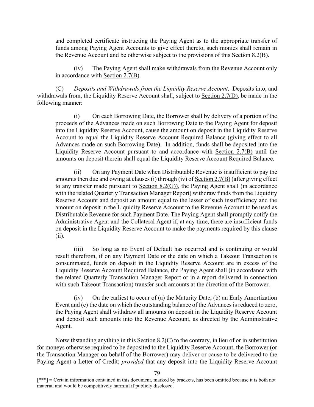 79 [***] = Certain information contained in this document, marked by brackets, has been omitted because it is both not material and would be competitively harmful if publicly disclosed. and completed certificate instructing the Paying Agent as to the appropriate transfer of funds among Paying Agent Accounts to give effect thereto, such monies shall remain in the Revenue Account and be otherwise subject to the provisions of this Section 8.2(B). (iv) The Paying Agent shall make withdrawals from the Revenue Account only in accordance with Section 2.7(B). (C) Deposits and Withdrawals from the Liquidity Reserve Account. Deposits into, and withdrawals from, the Liquidity Reserve Account shall, subject to Section 2.7(D), be made in the following manner: (i) On each Borrowing Date, the Borrower shall by delivery of a portion of the proceeds of the Advances made on such Borrowing Date to the Paying Agent for deposit into the Liquidity Reserve Account, cause the amount on deposit in the Liquidity Reserve Account to equal the Liquidity Reserve Account Required Balance (giving effect to all Advances made on such Borrowing Date). In addition, funds shall be deposited into the Liquidity Reserve Account pursuant to and accordance with Section 2.7(B) until the amounts on deposit therein shall equal the Liquidity Reserve Account Required Balance. (ii) On any Payment Date when Distributable Revenue is insufficient to pay the amounts then due and owing at clauses (i) through (iv) of Section 2.7(B) (after giving effect to any transfer made pursuant to Section 8.2(G)), the Paying Agent shall (in accordance with the related Quarterly Transaction Manager Report) withdraw funds from the Liquidity Reserve Account and deposit an amount equal to the lesser of such insufficiency and the amount on deposit in the Liquidity Reserve Account to the Revenue Account to be used as Distributable Revenue for such Payment Date. The Paying Agent shall promptly notify the Administrative Agent and the Collateral Agent if, at any time, there are insufficient funds on deposit in the Liquidity Reserve Account to make the payments required by this clause (ii). (iii) So long as no Event of Default has occurred and is continuing or would result therefrom, if on any Payment Date or the date on which a Takeout Transaction is consummated, funds on deposit in the Liquidity Reserve Account are in excess of the Liquidity Reserve Account Required Balance, the Paying Agent shall (in accordance with the related Quarterly Transaction Manager Report or in a report delivered in connection with such Takeout Transaction) transfer such amounts at the direction of the Borrower. (iv) On the earliest to occur of (a) the Maturity Date, (b) an Early Amortization Event and (c) the date on which the outstanding balance of the Advances is reduced to zero, the Paying Agent shall withdraw all amounts on deposit in the Liquidity Reserve Account and deposit such amounts into the Revenue Account, as directed by the Administrative Agent. Notwithstanding anything in this Section 8.2(C) to the contrary, in lieu of or in substitution for moneys otherwise required to be deposited to the Liquidity Reserve Account, the Borrower (or the Transaction Manager on behalf of the Borrower) may deliver or cause to be delivered to the Paying Agent a Letter of Credit; provided that any deposit into the Liquidity Reserve Account