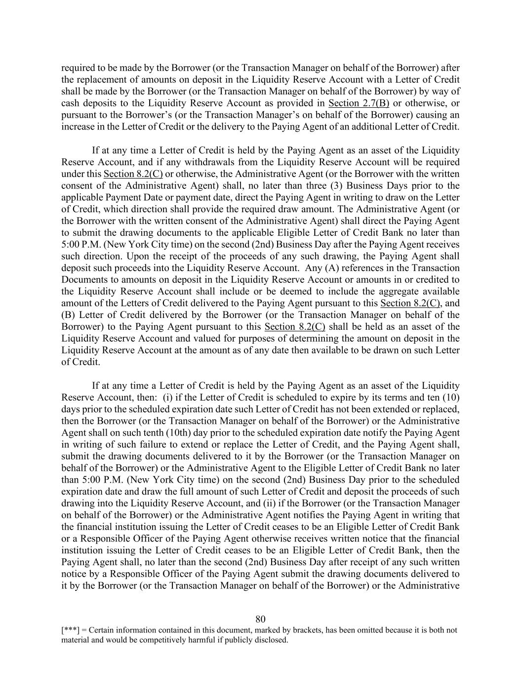 80 [***] = Certain information contained in this document, marked by brackets, has been omitted because it is both not material and would be competitively harmful if publicly disclosed. required to be made by the Borrower (or the Transaction Manager on behalf of the Borrower) after the replacement of amounts on deposit in the Liquidity Reserve Account with a Letter of Credit shall be made by the Borrower (or the Transaction Manager on behalf of the Borrower) by way of cash deposits to the Liquidity Reserve Account as provided in Section 2.7(B) or otherwise, or pursuant to the Borrower’s (or the Transaction Manager’s on behalf of the Borrower) causing an increase in the Letter of Credit or the delivery to the Paying Agent of an additional Letter of Credit. If at any time a Letter of Credit is held by the Paying Agent as an asset of the Liquidity Reserve Account, and if any withdrawals from the Liquidity Reserve Account will be required under this Section 8.2(C) or otherwise, the Administrative Agent (or the Borrower with the written consent of the Administrative Agent) shall, no later than three (3) Business Days prior to the applicable Payment Date or payment date, direct the Paying Agent in writing to draw on the Letter of Credit, which direction shall provide the required draw amount. The Administrative Agent (or the Borrower with the written consent of the Administrative Agent) shall direct the Paying Agent to submit the drawing documents to the applicable Eligible Letter of Credit Bank no later than 5:00 P.M. (New York City time) on the second (2nd) Business Day after the Paying Agent receives such direction. Upon the receipt of the proceeds of any such drawing, the Paying Agent shall deposit such proceeds into the Liquidity Reserve Account. Any (A) references in the Transaction Documents to amounts on deposit in the Liquidity Reserve Account or amounts in or credited to the Liquidity Reserve Account shall include or be deemed to include the aggregate available amount of the Letters of Credit delivered to the Paying Agent pursuant to this Section 8.2(C), and (B) Letter of Credit delivered by the Borrower (or the Transaction Manager on behalf of the Borrower) to the Paying Agent pursuant to this Section 8.2(C) shall be held as an asset of the Liquidity Reserve Account and valued for purposes of determining the amount on deposit in the Liquidity Reserve Account at the amount as of any date then available to be drawn on such Letter of Credit. If at any time a Letter of Credit is held by the Paying Agent as an asset of the Liquidity Reserve Account, then: (i) if the Letter of Credit is scheduled to expire by its terms and ten (10) days prior to the scheduled expiration date such Letter of Credit has not been extended or replaced, then the Borrower (or the Transaction Manager on behalf of the Borrower) or the Administrative Agent shall on such tenth (10th) day prior to the scheduled expiration date notify the Paying Agent in writing of such failure to extend or replace the Letter of Credit, and the Paying Agent shall, submit the drawing documents delivered to it by the Borrower (or the Transaction Manager on behalf of the Borrower) or the Administrative Agent to the Eligible Letter of Credit Bank no later than 5:00 P.M. (New York City time) on the second (2nd) Business Day prior to the scheduled expiration date and draw the full amount of such Letter of Credit and deposit the proceeds of such drawing into the Liquidity Reserve Account, and (ii) if the Borrower (or the Transaction Manager on behalf of the Borrower) or the Administrative Agent notifies the Paying Agent in writing that the financial institution issuing the Letter of Credit ceases to be an Eligible Letter of Credit Bank or a Responsible Officer of the Paying Agent otherwise receives written notice that the financial institution issuing the Letter of Credit ceases to be an Eligible Letter of Credit Bank, then the Paying Agent shall, no later than the second (2nd) Business Day after receipt of any such written notice by a Responsible Officer of the Paying Agent submit the drawing documents delivered to it by the Borrower (or the Transaction Manager on behalf of the Borrower) or the Administrative