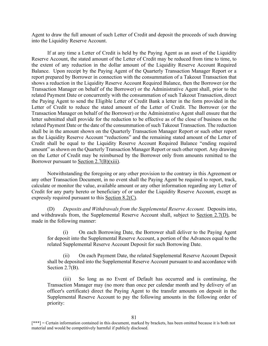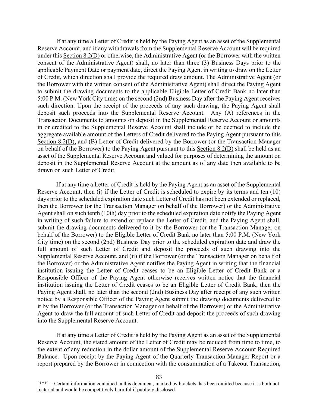 83 [***] = Certain information contained in this document, marked by brackets, has been omitted because it is both not material and would be competitively harmful if publicly disclosed. If at any time a Letter of Credit is held by the Paying Agent as an asset of the Supplemental Reserve Account, and if any withdrawals from the Supplemental Reserve Account will be required under this Section 8.2(D) or otherwise, the Administrative Agent (or the Borrower with the written consent of the Administrative Agent) shall, no later than three (3) Business Days prior to the applicable Payment Date or payment date, direct the Paying Agent in writing to draw on the Letter of Credit, which direction shall provide the required draw amount. The Administrative Agent (or the Borrower with the written consent of the Administrative Agent) shall direct the Paying Agent to submit the drawing documents to the applicable Eligible Letter of Credit Bank no later than 5:00 P.M. (New York City time) on the second (2nd) Business Day after the Paying Agent receives such direction. Upon the receipt of the proceeds of any such drawing, the Paying Agent shall deposit such proceeds into the Supplemental Reserve Account. Any (A) references in the Transaction Documents to amounts on deposit in the Supplemental Reserve Account or amounts in or credited to the Supplemental Reserve Account shall include or be deemed to include the aggregate available amount of the Letters of Credit delivered to the Paying Agent pursuant to this Section 8.2(D), and (B) Letter of Credit delivered by the Borrower (or the Transaction Manager on behalf of the Borrower) to the Paying Agent pursuant to this Section 8.2(D) shall be held as an asset of the Supplemental Reserve Account and valued for purposes of determining the amount on deposit in the Supplemental Reserve Account at the amount as of any date then available to be drawn on such Letter of Credit. If at any time a Letter of Credit is held by the Paying Agent as an asset of the Supplemental Reserve Account, then (i) if the Letter of Credit is scheduled to expire by its terms and ten (10) days prior to the scheduled expiration date such Letter of Credit has not been extended or replaced, then the Borrower (or the Transaction Manager on behalf of the Borrower) or the Administrative Agent shall on such tenth (10th) day prior to the scheduled expiration date notify the Paying Agent in writing of such failure to extend or replace the Letter of Credit, and the Paying Agent shall, submit the drawing documents delivered to it by the Borrower (or the Transaction Manager on behalf of the Borrower) to the Eligible Letter of Credit Bank no later than 5:00 P.M. (New York City time) on the second (2nd) Business Day prior to the scheduled expiration date and draw the full amount of such Letter of Credit and deposit the proceeds of such drawing into the Supplemental Reserve Account, and (ii) if the Borrower (or the Transaction Manager on behalf of the Borrower) or the Administrative Agent notifies the Paying Agent in writing that the financial institution issuing the Letter of Credit ceases to be an Eligible Letter of Credit Bank or a Responsible Officer of the Paying Agent otherwise receives written notice that the financial institution issuing the Letter of Credit ceases to be an Eligible Letter of Credit Bank, then the Paying Agent shall, no later than the second (2nd) Business Day after receipt of any such written notice by a Responsible Officer of the Paying Agent submit the drawing documents delivered to it by the Borrower (or the Transaction Manager on behalf of the Borrower) or the Administrative Agent to draw the full amount of such Letter of Credit and deposit the proceeds of such drawing into the Supplemental Reserve Account. If at any time a Letter of Credit is held by the Paying Agent as an asset of the Supplemental Reserve Account, the stated amount of the Letter of Credit may be reduced from time to time, to the extent of any reduction in the dollar amount of the Supplemental Reserve Account Required Balance. Upon receipt by the Paying Agent of the Quarterly Transaction Manager Report or a report prepared by the Borrower in connection with the consummation of a Takeout Transaction,