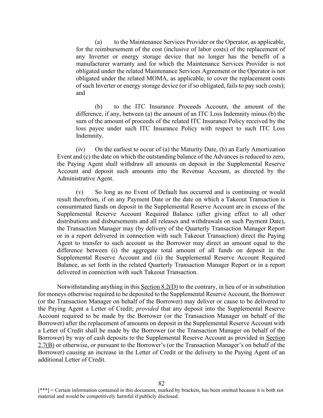 82 [***] = Certain information contained in this document, marked by brackets, has been omitted because it is both not material and would be competitively harmful if publicly disclosed. (a) to the Maintenance Services Provider or the Operator, as applicable, for the reimbursement of the cost (inclusive of labor costs) of the replacement of any Inverter or energy storage device that no longer has the benefit of a manufacturer warranty and for which the Maintenance Services Provider is not obligated under the related Maintenance Services Agreement or the Operator is not obligated under the related MOMA, as applicable, to cover the replacement costs of such Inverter or energy storage device (or if so obligated, fails to pay such costs); and (b) to the ITC Insurance Proceeds Account, the amount of the difference, if any, between (a) the amount of an ITC Loss Indemnity minus (b) the sum of the amount of proceeds of the related ITC Insurance Policy received by the loss payee under such ITC Insurance Policy with respect to such ITC Loss Indemnity. (iv) On the earliest to occur of (a) the Maturity Date, (b) an Early Amortization Event and (c) the date on which the outstanding balance of the Advances is reduced to zero, the Paying Agent shall withdraw all amounts on deposit in the Supplemental Reserve Account and deposit such amounts into the Revenue Account, as directed by the Administrative Agent. (v) So long as no Event of Default has occurred and is continuing or would result therefrom, if on any Payment Date or the date on which a Takeout Transaction is consummated funds on deposit in the Supplemental Reserve Account are in excess of the Supplemental Reserve Account Required Balance (after giving effect to all other distributions and disbursements and all releases and withdrawals on such Payment Date), the Transaction Manager may (by delivery of the Quarterly Transaction Manager Report or in a report delivered in connection with such Takeout Transaction) direct the Paying Agent to transfer to such account as the Borrower may direct an amount equal to the difference between (i) the aggregate total amount of all funds on deposit in the Supplemental Reserve Account and (ii) the Supplemental Reserve Account Required Balance, as set forth in the related Quarterly Transaction Manager Report or in a report delivered in connection with such Takeout Transaction. Notwithstanding anything in this Section 8.2(D) to the contrary, in lieu of or in substitution for moneys otherwise required to be deposited to the Supplemental Reserve Account, the Borrower (or the Transaction Manager on behalf of the Borrower) may deliver or cause to be delivered to the Paying Agent a Letter of Credit; provided that any deposit into the Supplemental Reserve Account required to be made by the Borrower (or the Transaction Manager on behalf of the Borrower) after the replacement of amounts on deposit in the Supplemental Reserve Account with a Letter of Credit shall be made by the Borrower (or the Transaction Manager on behalf of the Borrower) by way of cash deposits to the Supplemental Reserve Account as provided in Section 2.7(B) or otherwise, or pursuant to the Borrower’s (or the Transaction Manager’s on behalf of the Borrower) causing an increase in the Letter of Credit or the delivery to the Paying Agent of an additional Letter of Credit.
