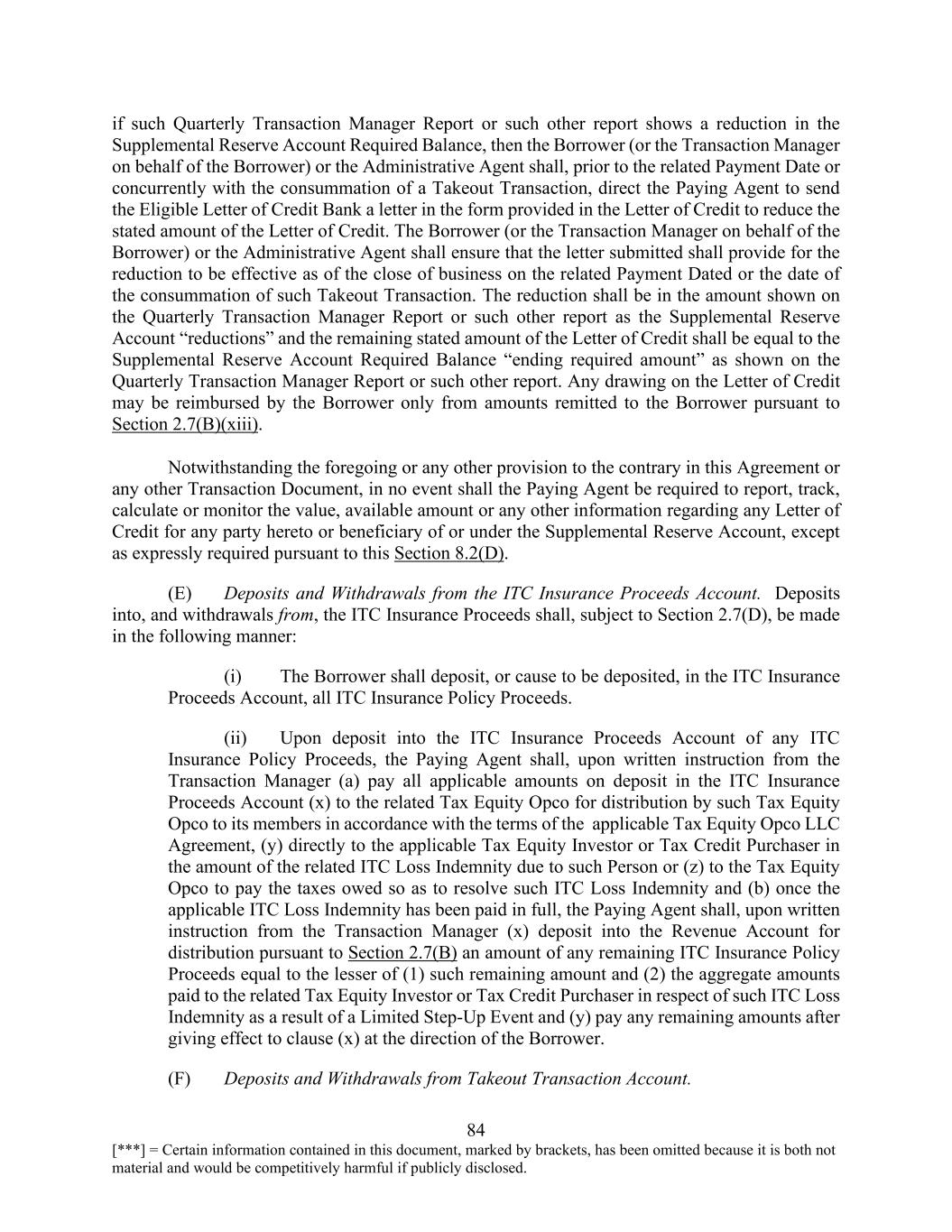 84 [***] = Certain information contained in this document, marked by brackets, has been omitted because it is both not material and would be competitively harmful if publicly disclosed. if such Quarterly Transaction Manager Report or such other report shows a reduction in the Supplemental Reserve Account Required Balance, then the Borrower (or the Transaction Manager on behalf of the Borrower) or the Administrative Agent shall, prior to the related Payment Date or concurrently with the consummation of a Takeout Transaction, direct the Paying Agent to send the Eligible Letter of Credit Bank a letter in the form provided in the Letter of Credit to reduce the stated amount of the Letter of Credit. The Borrower (or the Transaction Manager on behalf of the Borrower) or the Administrative Agent shall ensure that the letter submitted shall provide for the reduction to be effective as of the close of business on the related Payment Dated or the date of the consummation of such Takeout Transaction. The reduction shall be in the amount shown on the Quarterly Transaction Manager Report or such other report as the Supplemental Reserve Account “reductions” and the remaining stated amount of the Letter of Credit shall be equal to the Supplemental Reserve Account Required Balance “ending required amount” as shown on the Quarterly Transaction Manager Report or such other report. Any drawing on the Letter of Credit may be reimbursed by the Borrower only from amounts remitted to the Borrower pursuant to Section 2.7(B)(xiii). Notwithstanding the foregoing or any other provision to the contrary in this Agreement or any other Transaction Document, in no event shall the Paying Agent be required to report, track, calculate or monitor the value, available amount or any other information regarding any Letter of Credit for any party hereto or beneficiary of or under the Supplemental Reserve Account, except as expressly required pursuant to this Section 8.2(D). (E) Deposits and Withdrawals from the ITC Insurance Proceeds Account. Deposits into, and withdrawals from, the ITC Insurance Proceeds shall, subject to Section 2.7(D), be made in the following manner: (i) The Borrower shall deposit, or cause to be deposited, in the ITC Insurance Proceeds Account, all ITC Insurance Policy Proceeds. (ii) Upon deposit into the ITC Insurance Proceeds Account of any ITC Insurance Policy Proceeds, the Paying Agent shall, upon written instruction from the Transaction Manager (a) pay all applicable amounts on deposit in the ITC Insurance Proceeds Account (x) to the related Tax Equity Opco for distribution by such Tax Equity Opco to its members in accordance with the terms of the applicable Tax Equity Opco LLC Agreement, (y) directly to the applicable Tax Equity Investor or Tax Credit Purchaser in the amount of the related ITC Loss Indemnity due to such Person or (z) to the Tax Equity Opco to pay the taxes owed so as to resolve such ITC Loss Indemnity and (b) once the applicable ITC Loss Indemnity has been paid in full, the Paying Agent shall, upon written instruction from the Transaction Manager (x) deposit into the Revenue Account for distribution pursuant to Section 2.7(B) an amount of any remaining ITC Insurance Policy Proceeds equal to the lesser of (1) such remaining amount and (2) the aggregate amounts paid to the related Tax Equity Investor or Tax Credit Purchaser in respect of such ITC Loss Indemnity as a result of a Limited Step-Up Event and (y) pay any remaining amounts after giving effect to clause (x) at the direction of the Borrower. (F) Deposits and Withdrawals from Takeout Transaction Account.