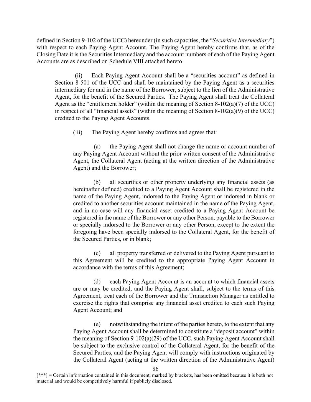 86 [***] = Certain information contained in this document, marked by brackets, has been omitted because it is both not material and would be competitively harmful if publicly disclosed. defined in Section 9-102 of the UCC) hereunder (in such capacities, the “Securities Intermediary”) with respect to each Paying Agent Account. The Paying Agent hereby confirms that, as of the Closing Date it is the Securities Intermediary and the account numbers of each of the Paying Agent Accounts are as described on Schedule VIII attached hereto. (ii) Each Paying Agent Account shall be a “securities account” as defined in Section 8-501 of the UCC and shall be maintained by the Paying Agent as a securities intermediary for and in the name of the Borrower, subject to the lien of the Administrative Agent, for the benefit of the Secured Parties. The Paying Agent shall treat the Collateral Agent as the “entitlement holder” (within the meaning of Section 8-102(a)(7) of the UCC) in respect of all “financial assets” (within the meaning of Section 8-102(a)(9) of the UCC) credited to the Paying Agent Accounts. (iii) The Paying Agent hereby confirms and agrees that: (a) the Paying Agent shall not change the name or account number of any Paying Agent Account without the prior written consent of the Administrative Agent, the Collateral Agent (acting at the written direction of the Administrative Agent) and the Borrower; (b) all securities or other property underlying any financial assets (as hereinafter defined) credited to a Paying Agent Account shall be registered in the name of the Paying Agent, indorsed to the Paying Agent or indorsed in blank or credited to another securities account maintained in the name of the Paying Agent, and in no case will any financial asset credited to a Paying Agent Account be registered in the name of the Borrower or any other Person, payable to the Borrower or specially indorsed to the Borrower or any other Person, except to the extent the foregoing have been specially indorsed to the Collateral Agent, for the benefit of the Secured Parties, or in blank; (c) all property transferred or delivered to the Paying Agent pursuant to this Agreement will be credited to the appropriate Paying Agent Account in accordance with the terms of this Agreement; (d) each Paying Agent Account is an account to which financial assets are or may be credited, and the Paying Agent shall, subject to the terms of this Agreement, treat each of the Borrower and the Transaction Manager as entitled to exercise the rights that comprise any financial asset credited to each such Paying Agent Account; and (e) notwithstanding the intent of the parties hereto, to the extent that any Paying Agent Account shall be determined to constitute a “deposit account” within the meaning of Section 9-102(a)(29) of the UCC, such Paying Agent Account shall be subject to the exclusive control of the Collateral Agent, for the benefit of the Secured Parties, and the Paying Agent will comply with instructions originated by the Collateral Agent (acting at the written direction of the Administrative Agent)