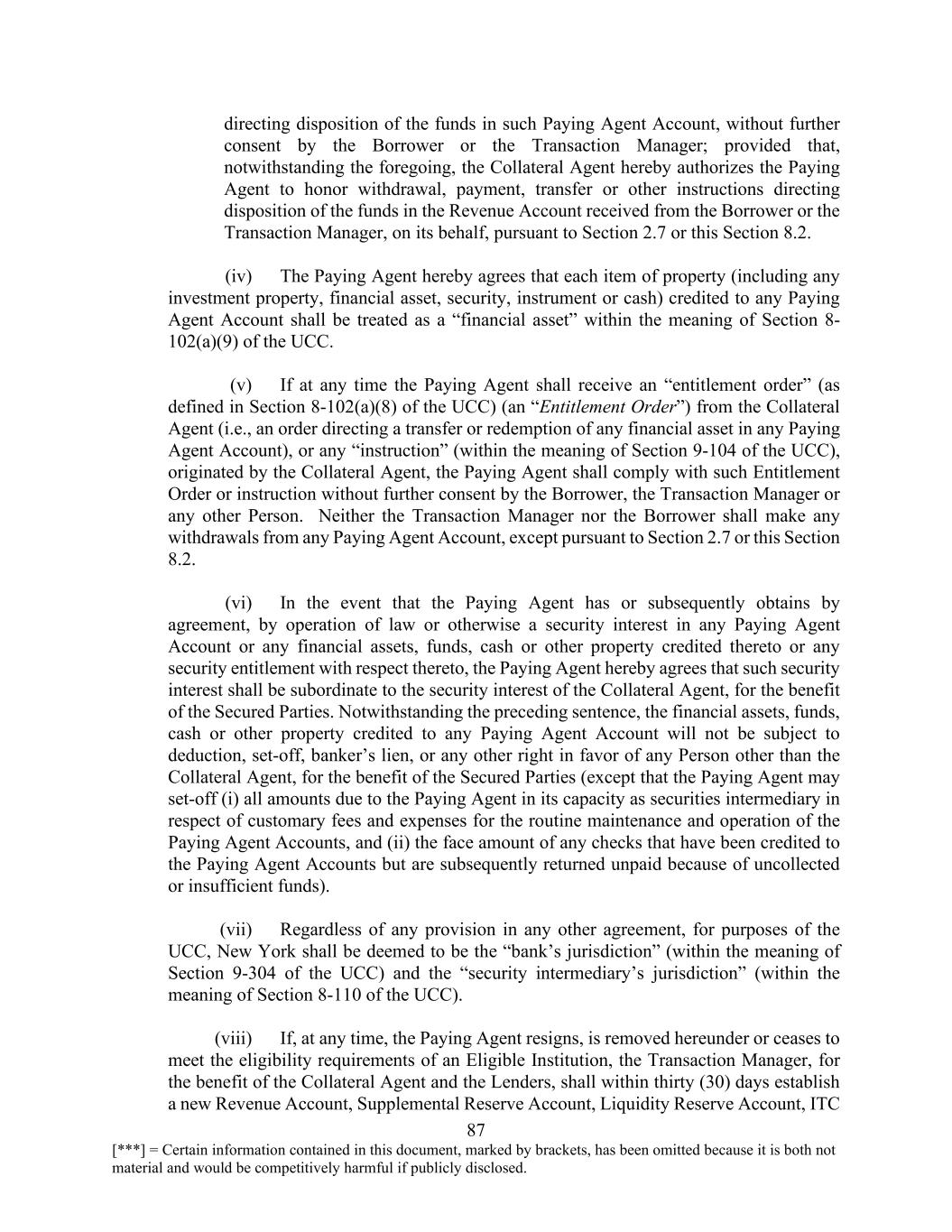 87 [***] = Certain information contained in this document, marked by brackets, has been omitted because it is both not material and would be competitively harmful if publicly disclosed. directing disposition of the funds in such Paying Agent Account, without further consent by the Borrower or the Transaction Manager; provided that, notwithstanding the foregoing, the Collateral Agent hereby authorizes the Paying Agent to honor withdrawal, payment, transfer or other instructions directing disposition of the funds in the Revenue Account received from the Borrower or the Transaction Manager, on its behalf, pursuant to Section 2.7 or this Section 8.2. (iv) The Paying Agent hereby agrees that each item of property (including any investment property, financial asset, security, instrument or cash) credited to any Paying Agent Account shall be treated as a “financial asset” within the meaning of Section 8- 102(a)(9) of the UCC. (v) If at any time the Paying Agent shall receive an “entitlement order” (as defined in Section 8-102(a)(8) of the UCC) (an “Entitlement Order”) from the Collateral Agent (i.e., an order directing a transfer or redemption of any financial asset in any Paying Agent Account), or any “instruction” (within the meaning of Section 9-104 of the UCC), originated by the Collateral Agent, the Paying Agent shall comply with such Entitlement Order or instruction without further consent by the Borrower, the Transaction Manager or any other Person. Neither the Transaction Manager nor the Borrower shall make any withdrawals from any Paying Agent Account, except pursuant to Section 2.7 or this Section 8.2. (vi) In the event that the Paying Agent has or subsequently obtains by agreement, by operation of law or otherwise a security interest in any Paying Agent Account or any financial assets, funds, cash or other property credited thereto or any security entitlement with respect thereto, the Paying Agent hereby agrees that such security interest shall be subordinate to the security interest of the Collateral Agent, for the benefit of the Secured Parties. Notwithstanding the preceding sentence, the financial assets, funds, cash or other property credited to any Paying Agent Account will not be subject to deduction, set-off, banker’s lien, or any other right in favor of any Person other than the Collateral Agent, for the benefit of the Secured Parties (except that the Paying Agent may set-off (i) all amounts due to the Paying Agent in its capacity as securities intermediary in respect of customary fees and expenses for the routine maintenance and operation of the Paying Agent Accounts, and (ii) the face amount of any checks that have been credited to the Paying Agent Accounts but are subsequently returned unpaid because of uncollected or insufficient funds). (vii) Regardless of any provision in any other agreement, for purposes of the UCC, New York shall be deemed to be the “bank’s jurisdiction” (within the meaning of Section 9-304 of the UCC) and the “security intermediary’s jurisdiction” (within the meaning of Section 8-110 of the UCC). (viii) If, at any time, the Paying Agent resigns, is removed hereunder or ceases to meet the eligibility requirements of an Eligible Institution, the Transaction Manager, for the benefit of the Collateral Agent and the Lenders, shall within thirty (30) days establish a new Revenue Account, Supplemental Reserve Account, Liquidity Reserve Account, ITC