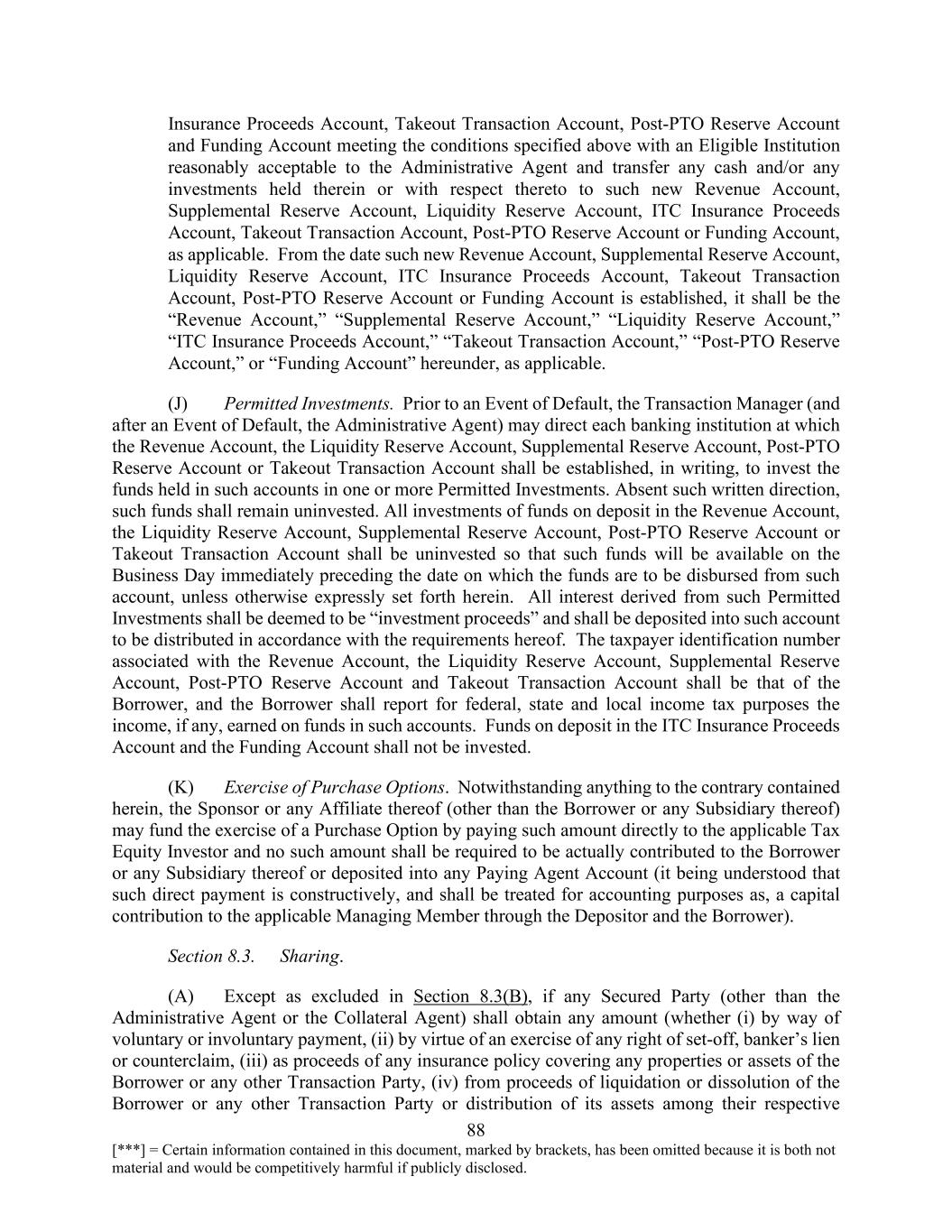 88 [***] = Certain information contained in this document, marked by brackets, has been omitted because it is both not material and would be competitively harmful if publicly disclosed. Insurance Proceeds Account, Takeout Transaction Account, Post-PTO Reserve Account and Funding Account meeting the conditions specified above with an Eligible Institution reasonably acceptable to the Administrative Agent and transfer any cash and/or any investments held therein or with respect thereto to such new Revenue Account, Supplemental Reserve Account, Liquidity Reserve Account, ITC Insurance Proceeds Account, Takeout Transaction Account, Post-PTO Reserve Account or Funding Account, as applicable. From the date such new Revenue Account, Supplemental Reserve Account, Liquidity Reserve Account, ITC Insurance Proceeds Account, Takeout Transaction Account, Post-PTO Reserve Account or Funding Account is established, it shall be the “Revenue Account,” “Supplemental Reserve Account,” “Liquidity Reserve Account,” “ITC Insurance Proceeds Account,” “Takeout Transaction Account,” “Post-PTO Reserve Account,” or “Funding Account” hereunder, as applicable. (J) Permitted Investments. Prior to an Event of Default, the Transaction Manager (and after an Event of Default, the Administrative Agent) may direct each banking institution at which the Revenue Account, the Liquidity Reserve Account, Supplemental Reserve Account, Post-PTO Reserve Account or Takeout Transaction Account shall be established, in writing, to invest the funds held in such accounts in one or more Permitted Investments. Absent such written direction, such funds shall remain uninvested. All investments of funds on deposit in the Revenue Account, the Liquidity Reserve Account, Supplemental Reserve Account, Post-PTO Reserve Account or Takeout Transaction Account shall be uninvested so that such funds will be available on the Business Day immediately preceding the date on which the funds are to be disbursed from such account, unless otherwise expressly set forth herein. All interest derived from such Permitted Investments shall be deemed to be “investment proceeds” and shall be deposited into such account to be distributed in accordance with the requirements hereof. The taxpayer identification number associated with the Revenue Account, the Liquidity Reserve Account, Supplemental Reserve Account, Post-PTO Reserve Account and Takeout Transaction Account shall be that of the Borrower, and the Borrower shall report for federal, state and local income tax purposes the income, if any, earned on funds in such accounts. Funds on deposit in the ITC Insurance Proceeds Account and the Funding Account shall not be invested. (K) Exercise of Purchase Options. Notwithstanding anything to the contrary contained herein, the Sponsor or any Affiliate thereof (other than the Borrower or any Subsidiary thereof) may fund the exercise of a Purchase Option by paying such amount directly to the applicable Tax Equity Investor and no such amount shall be required to be actually contributed to the Borrower or any Subsidiary thereof or deposited into any Paying Agent Account (it being understood that such direct payment is constructively, and shall be treated for accounting purposes as, a capital contribution to the applicable Managing Member through the Depositor and the Borrower). Section 8.3. Sharing. (A) Except as excluded in Section 8.3(B), if any Secured Party (other than the Administrative Agent or the Collateral Agent) shall obtain any amount (whether (i) by way of voluntary or involuntary payment, (ii) by virtue of an exercise of any right of set-off, banker’s lien or counterclaim, (iii) as proceeds of any insurance policy covering any properties or assets of the Borrower or any other Transaction Party, (iv) from proceeds of liquidation or dissolution of the Borrower or any other Transaction Party or distribution of its assets among their respective