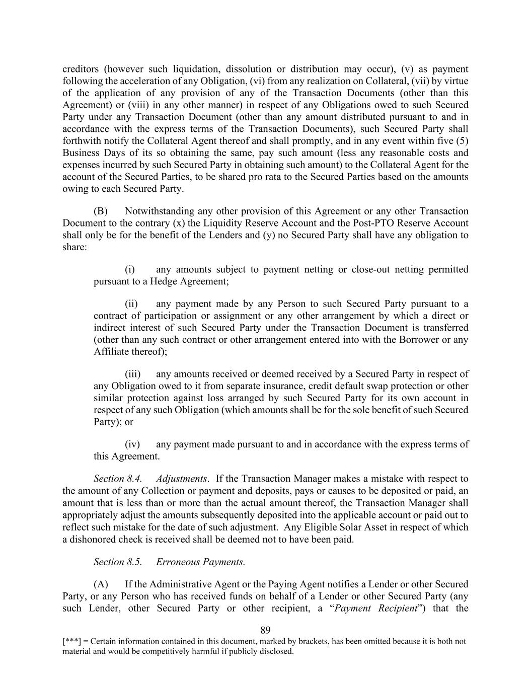 89 [***] = Certain information contained in this document, marked by brackets, has been omitted because it is both not material and would be competitively harmful if publicly disclosed. creditors (however such liquidation, dissolution or distribution may occur), (v) as payment following the acceleration of any Obligation, (vi) from any realization on Collateral, (vii) by virtue of the application of any provision of any of the Transaction Documents (other than this Agreement) or (viii) in any other manner) in respect of any Obligations owed to such Secured Party under any Transaction Document (other than any amount distributed pursuant to and in accordance with the express terms of the Transaction Documents), such Secured Party shall forthwith notify the Collateral Agent thereof and shall promptly, and in any event within five (5) Business Days of its so obtaining the same, pay such amount (less any reasonable costs and expenses incurred by such Secured Party in obtaining such amount) to the Collateral Agent for the account of the Secured Parties, to be shared pro rata to the Secured Parties based on the amounts owing to each Secured Party. (B) Notwithstanding any other provision of this Agreement or any other Transaction Document to the contrary (x) the Liquidity Reserve Account and the Post-PTO Reserve Account shall only be for the benefit of the Lenders and (y) no Secured Party shall have any obligation to share: (i) any amounts subject to payment netting or close-out netting permitted pursuant to a Hedge Agreement; (ii) any payment made by any Person to such Secured Party pursuant to a contract of participation or assignment or any other arrangement by which a direct or indirect interest of such Secured Party under the Transaction Document is transferred (other than any such contract or other arrangement entered into with the Borrower or any Affiliate thereof); (iii) any amounts received or deemed received by a Secured Party in respect of any Obligation owed to it from separate insurance, credit default swap protection or other similar protection against loss arranged by such Secured Party for its own account in respect of any such Obligation (which amounts shall be for the sole benefit of such Secured Party); or (iv) any payment made pursuant to and in accordance with the express terms of this Agreement. Section 8.4. Adjustments. If the Transaction Manager makes a mistake with respect to the amount of any Collection or payment and deposits, pays or causes to be deposited or paid, an amount that is less than or more than the actual amount thereof, the Transaction Manager shall appropriately adjust the amounts subsequently deposited into the applicable account or paid out to reflect such mistake for the date of such adjustment. Any Eligible Solar Asset in respect of which a dishonored check is received shall be deemed not to have been paid. Section 8.5. Erroneous Payments. (A) If the Administrative Agent or the Paying Agent notifies a Lender or other Secured Party, or any Person who has received funds on behalf of a Lender or other Secured Party (any such Lender, other Secured Party or other recipient, a “Payment Recipient”) that the
