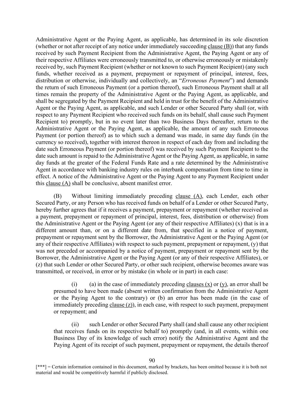 90 [***] = Certain information contained in this document, marked by brackets, has been omitted because it is both not material and would be competitively harmful if publicly disclosed. Administrative Agent or the Paying Agent, as applicable, has determined in its sole discretion (whether or not after receipt of any notice under immediately succeeding clause (B)) that any funds received by such Payment Recipient from the Administrative Agent, the Paying Agent or any of their respective Affiliates were erroneously transmitted to, or otherwise erroneously or mistakenly received by, such Payment Recipient (whether or not known to such Payment Recipient) (any such funds, whether received as a payment, prepayment or repayment of principal, interest, fees, distribution or otherwise, individually and collectively, an “Erroneous Payment”) and demands the return of such Erroneous Payment (or a portion thereof), such Erroneous Payment shall at all times remain the property of the Administrative Agent or the Paying Agent, as applicable, and shall be segregated by the Payment Recipient and held in trust for the benefit of the Administrative Agent or the Paying Agent, as applicable, and such Lender or other Secured Party shall (or, with respect to any Payment Recipient who received such funds on its behalf, shall cause such Payment Recipient to) promptly, but in no event later than two Business Days thereafter, return to the Administrative Agent or the Paying Agent, as applicable, the amount of any such Erroneous Payment (or portion thereof) as to which such a demand was made, in same day funds (in the currency so received), together with interest thereon in respect of each day from and including the date such Erroneous Payment (or portion thereof) was received by such Payment Recipient to the date such amount is repaid to the Administrative Agent or the Paying Agent, as applicable, in same day funds at the greater of the Federal Funds Rate and a rate determined by the Administrative Agent in accordance with banking industry rules on interbank compensation from time to time in effect. A notice of the Administrative Agent or the Paying Agent to any Payment Recipient under this clause (A) shall be conclusive, absent manifest error. (B) Without limiting immediately preceding clause (A), each Lender, each other Secured Party, or any Person who has received funds on behalf of a Lender or other Secured Party, hereby further agrees that if it receives a payment, prepayment or repayment (whether received as a payment, prepayment or repayment of principal, interest, fees, distribution or otherwise) from the Administrative Agent or the Paying Agent (or any of their respective Affiliates) (x) that is in a different amount than, or on a different date from, that specified in a notice of payment, prepayment or repayment sent by the Borrower, the Administrative Agent or the Paying Agent (or any of their respective Affiliates) with respect to such payment, prepayment or repayment, (y) that was not preceded or accompanied by a notice of payment, prepayment or repayment sent by the Borrower, the Administrative Agent or the Paying Agent (or any of their respective Affiliates), or (z) that such Lender or other Secured Party, or other such recipient, otherwise becomes aware was transmitted, or received, in error or by mistake (in whole or in part) in each case: (i) (a) in the case of immediately preceding clauses (x) or (y), an error shall be presumed to have been made (absent written confirmation from the Administrative Agent or the Paying Agent to the contrary) or (b) an error has been made (in the case of immediately preceding clause (z)), in each case, with respect to such payment, prepayment or repayment; and (ii) such Lender or other Secured Party shall (and shall cause any other recipient that receives funds on its respective behalf to) promptly (and, in all events, within one Business Day of its knowledge of such error) notify the Administrative Agent and the Paying Agent of its receipt of such payment, prepayment or repayment, the details thereof