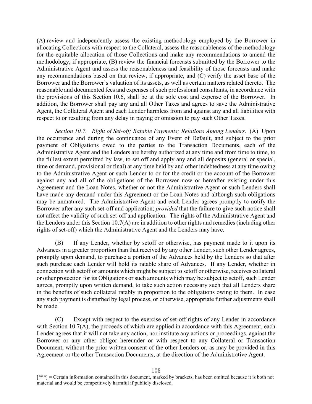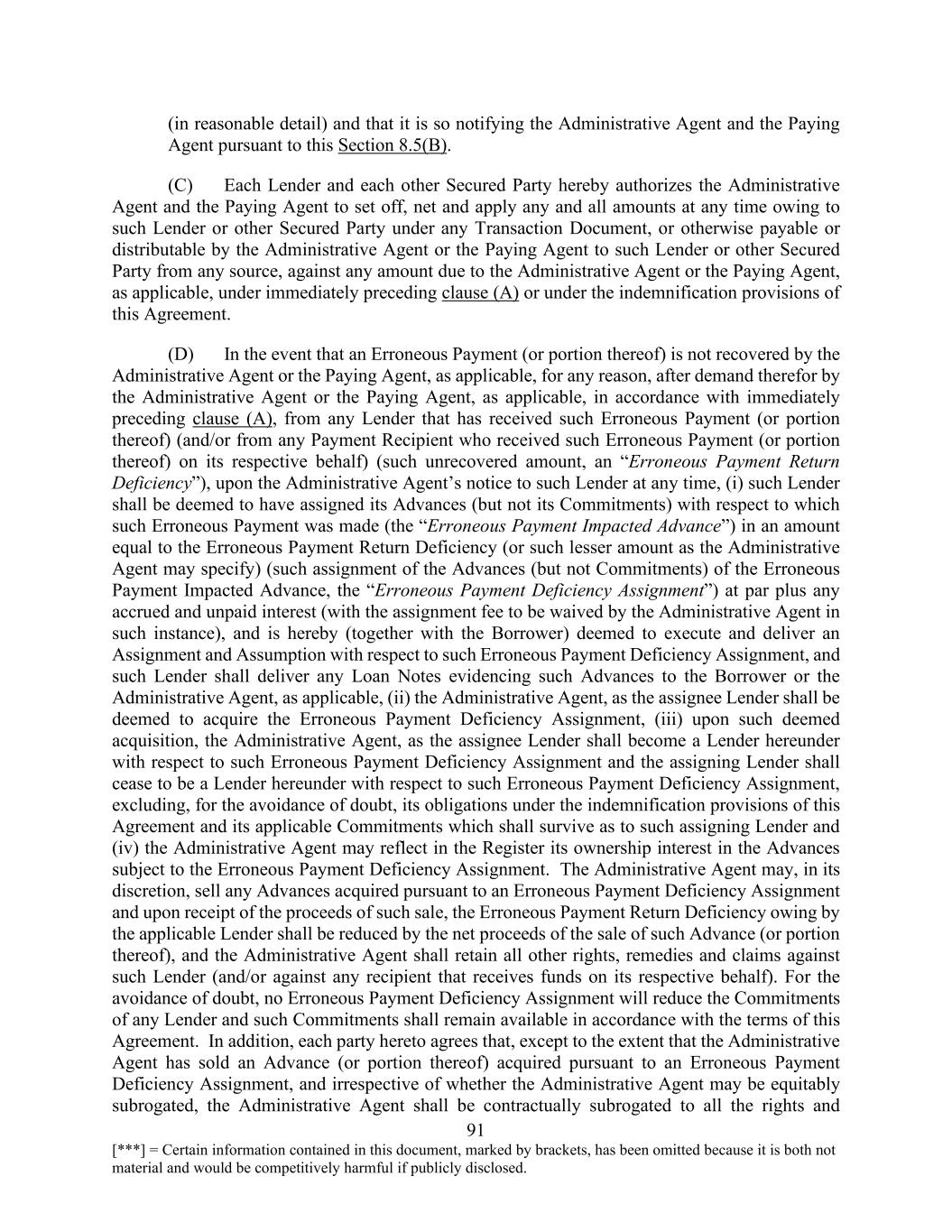 91 [***] = Certain information contained in this document, marked by brackets, has been omitted because it is both not material and would be competitively harmful if publicly disclosed. (in reasonable detail) and that it is so notifying the Administrative Agent and the Paying Agent pursuant to this Section 8.5(B). (C) Each Lender and each other Secured Party hereby authorizes the Administrative Agent and the Paying Agent to set off, net and apply any and all amounts at any time owing to such Lender or other Secured Party under any Transaction Document, or otherwise payable or distributable by the Administrative Agent or the Paying Agent to such Lender or other Secured Party from any source, against any amount due to the Administrative Agent or the Paying Agent, as applicable, under immediately preceding clause (A) or under the indemnification provisions of this Agreement. (D) In the event that an Erroneous Payment (or portion thereof) is not recovered by the Administrative Agent or the Paying Agent, as applicable, for any reason, after demand therefor by the Administrative Agent or the Paying Agent, as applicable, in accordance with immediately preceding clause (A), from any Lender that has received such Erroneous Payment (or portion thereof) (and/or from any Payment Recipient who received such Erroneous Payment (or portion thereof) on its respective behalf) (such unrecovered amount, an “Erroneous Payment Return Deficiency”), upon the Administrative Agent’s notice to such Lender at any time, (i) such Lender shall be deemed to have assigned its Advances (but not its Commitments) with respect to which such Erroneous Payment was made (the “Erroneous Payment Impacted Advance”) in an amount equal to the Erroneous Payment Return Deficiency (or such lesser amount as the Administrative Agent may specify) (such assignment of the Advances (but not Commitments) of the Erroneous Payment Impacted Advance, the “Erroneous Payment Deficiency Assignment”) at par plus any accrued and unpaid interest (with the assignment fee to be waived by the Administrative Agent in such instance), and is hereby (together with the Borrower) deemed to execute and deliver an Assignment and Assumption with respect to such Erroneous Payment Deficiency Assignment, and such Lender shall deliver any Loan Notes evidencing such Advances to the Borrower or the Administrative Agent, as applicable, (ii) the Administrative Agent, as the assignee Lender shall be deemed to acquire the Erroneous Payment Deficiency Assignment, (iii) upon such deemed acquisition, the Administrative Agent, as the assignee Lender shall become a Lender hereunder with respect to such Erroneous Payment Deficiency Assignment and the assigning Lender shall cease to be a Lender hereunder with respect to such Erroneous Payment Deficiency Assignment, excluding, for the avoidance of doubt, its obligations under the indemnification provisions of this Agreement and its applicable Commitments which shall survive as to such assigning Lender and (iv) the Administrative Agent may reflect in the Register its ownership interest in the Advances subject to the Erroneous Payment Deficiency Assignment. The Administrative Agent may, in its discretion, sell any Advances acquired pursuant to an Erroneous Payment Deficiency Assignment and upon receipt of the proceeds of such sale, the Erroneous Payment Return Deficiency owing by the applicable Lender shall be reduced by the net proceeds of the sale of such Advance (or portion thereof), and the Administrative Agent shall retain all other rights, remedies and claims against such Lender (and/or against any recipient that receives funds on its respective behalf). For the avoidance of doubt, no Erroneous Payment Deficiency Assignment will reduce the Commitments of any Lender and such Commitments shall remain available in accordance with the terms of this Agreement. In addition, each party hereto agrees that, except to the extent that the Administrative Agent has sold an Advance (or portion thereof) acquired pursuant to an Erroneous Payment Deficiency Assignment, and irrespective of whether the Administrative Agent may be equitably subrogated, the Administrative Agent shall be contractually subrogated to all the rights and