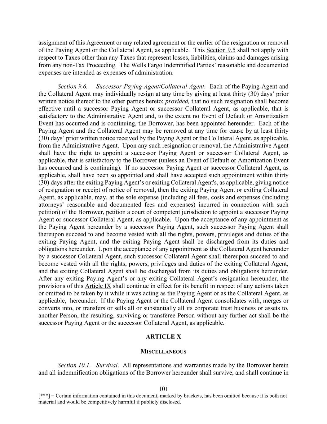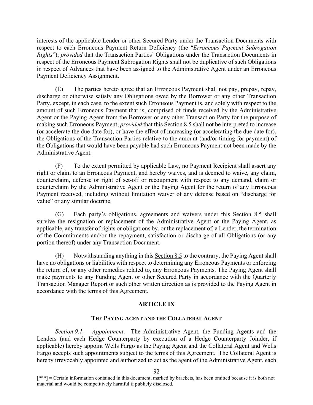92 [***] = Certain information contained in this document, marked by brackets, has been omitted because it is both not material and would be competitively harmful if publicly disclosed. interests of the applicable Lender or other Secured Party under the Transaction Documents with respect to each Erroneous Payment Return Deficiency (the “Erroneous Payment Subrogation Rights”); provided that the Transaction Parties’ Obligations under the Transaction Documents in respect of the Erroneous Payment Subrogation Rights shall not be duplicative of such Obligations in respect of Advances that have been assigned to the Administrative Agent under an Erroneous Payment Deficiency Assignment. (E) The parties hereto agree that an Erroneous Payment shall not pay, prepay, repay, discharge or otherwise satisfy any Obligations owed by the Borrower or any other Transaction Party, except, in each case, to the extent such Erroneous Payment is, and solely with respect to the amount of such Erroneous Payment that is, comprised of funds received by the Administrative Agent or the Paying Agent from the Borrower or any other Transaction Party for the purpose of making such Erroneous Payment; provided that this Section 8.5 shall not be interpreted to increase (or accelerate the due date for), or have the effect of increasing (or accelerating the due date for), the Obligations of the Transaction Parties relative to the amount (and/or timing for payment) of the Obligations that would have been payable had such Erroneous Payment not been made by the Administrative Agent. (F) To the extent permitted by applicable Law, no Payment Recipient shall assert any right or claim to an Erroneous Payment, and hereby waives, and is deemed to waive, any claim, counterclaim, defense or right of set-off or recoupment with respect to any demand, claim or counterclaim by the Administrative Agent or the Paying Agent for the return of any Erroneous Payment received, including without limitation waiver of any defense based on “discharge for value” or any similar doctrine. (G) Each party’s obligations, agreements and waivers under this Section 8.5 shall survive the resignation or replacement of the Administrative Agent or the Paying Agent, as applicable, any transfer of rights or obligations by, or the replacement of, a Lender, the termination of the Commitments and/or the repayment, satisfaction or discharge of all Obligations (or any portion thereof) under any Transaction Document. (H) Notwithstanding anything in this Section 8.5 to the contrary, the Paying Agent shall have no obligations or liabilities with respect to determining any Erroneous Payments or enforcing the return of, or any other remedies related to, any Erroneous Payments. The Paying Agent shall make payments to any Funding Agent or other Secured Party in accordance with the Quarterly Transaction Manager Report or such other written direction as is provided to the Paying Agent in accordance with the terms of this Agreement. ARTICLE IX THE PAYING AGENT AND THE COLLATERAL AGENT Section 9.1. Appointment. The Administrative Agent, the Funding Agents and the Lenders (and each Hedge Counterparty by execution of a Hedge Counterparty Joinder, if applicable) hereby appoint Wells Fargo as the Paying Agent and the Collateral Agent and Wells Fargo accepts such appointments subject to the terms of this Agreement. The Collateral Agent is hereby irrevocably appointed and authorized to act as the agent of the Administrative Agent, each