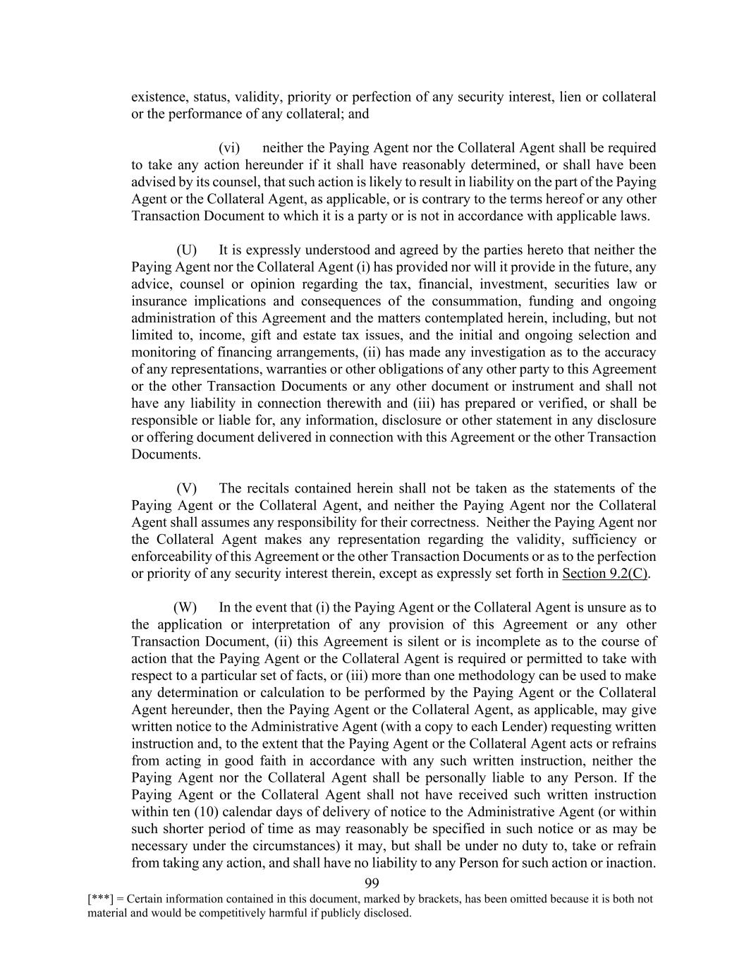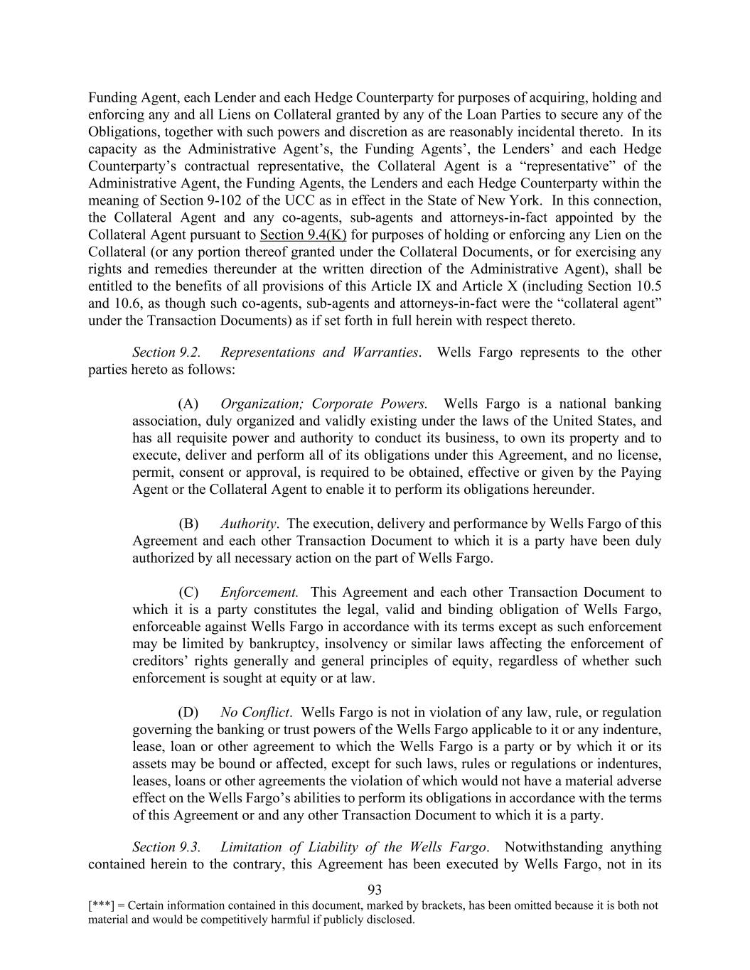 93 [***] = Certain information contained in this document, marked by brackets, has been omitted because it is both not material and would be competitively harmful if publicly disclosed. Funding Agent, each Lender and each Hedge Counterparty for purposes of acquiring, holding and enforcing any and all Liens on Collateral granted by any of the Loan Parties to secure any of the Obligations, together with such powers and discretion as are reasonably incidental thereto. In its capacity as the Administrative Agent’s, the Funding Agents’, the Lenders’ and each Hedge Counterparty’s contractual representative, the Collateral Agent is a “representative” of the Administrative Agent, the Funding Agents, the Lenders and each Hedge Counterparty within the meaning of Section 9-102 of the UCC as in effect in the State of New York. In this connection, the Collateral Agent and any co-agents, sub-agents and attorneys-in-fact appointed by the Collateral Agent pursuant to Section 9.4(K) for purposes of holding or enforcing any Lien on the Collateral (or any portion thereof granted under the Collateral Documents, or for exercising any rights and remedies thereunder at the written direction of the Administrative Agent), shall be entitled to the benefits of all provisions of this Article IX and Article X (including Section 10.5 and 10.6, as though such co-agents, sub-agents and attorneys-in-fact were the “collateral agent” under the Transaction Documents) as if set forth in full herein with respect thereto. Section 9.2. Representations and Warranties. Wells Fargo represents to the other parties hereto as follows: (A) Organization; Corporate Powers. Wells Fargo is a national banking association, duly organized and validly existing under the laws of the United States, and has all requisite power and authority to conduct its business, to own its property and to execute, deliver and perform all of its obligations under this Agreement, and no license, permit, consent or approval, is required to be obtained, effective or given by the Paying Agent or the Collateral Agent to enable it to perform its obligations hereunder. (B) Authority. The execution, delivery and performance by Wells Fargo of this Agreement and each other Transaction Document to which it is a party have been duly authorized by all necessary action on the part of Wells Fargo. (C) Enforcement. This Agreement and each other Transaction Document to which it is a party constitutes the legal, valid and binding obligation of Wells Fargo, enforceable against Wells Fargo in accordance with its terms except as such enforcement may be limited by bankruptcy, insolvency or similar laws affecting the enforcement of creditors’ rights generally and general principles of equity, regardless of whether such enforcement is sought at equity or at law. (D) No Conflict. Wells Fargo is not in violation of any law, rule, or regulation governing the banking or trust powers of the Wells Fargo applicable to it or any indenture, lease, loan or other agreement to which the Wells Fargo is a party or by which it or its assets may be bound or affected, except for such laws, rules or regulations or indentures, leases, loans or other agreements the violation of which would not have a material adverse effect on the Wells Fargo’s abilities to perform its obligations in accordance with the terms of this Agreement or and any other Transaction Document to which it is a party. Section 9.3. Limitation of Liability of the Wells Fargo. Notwithstanding anything contained herein to the contrary, this Agreement has been executed by Wells Fargo, not in its