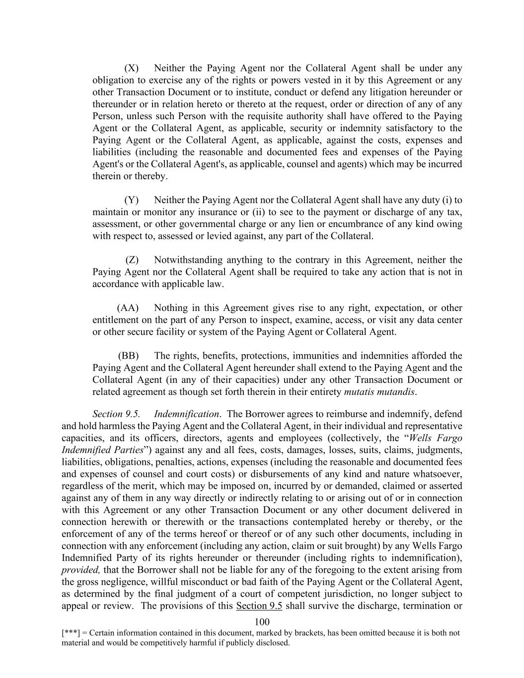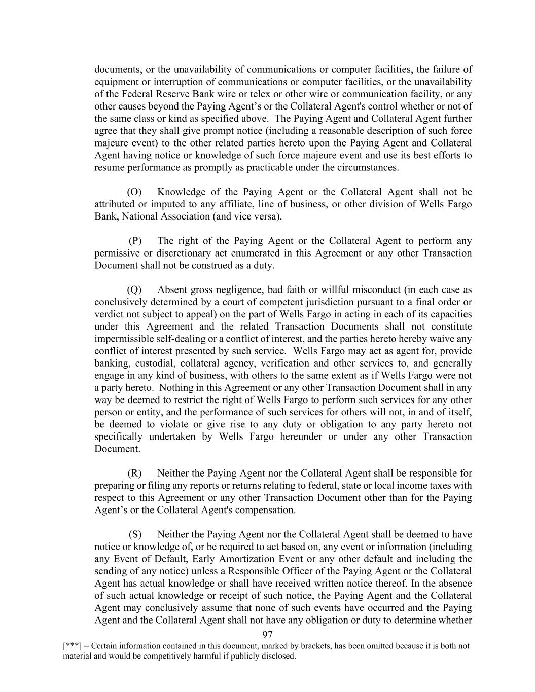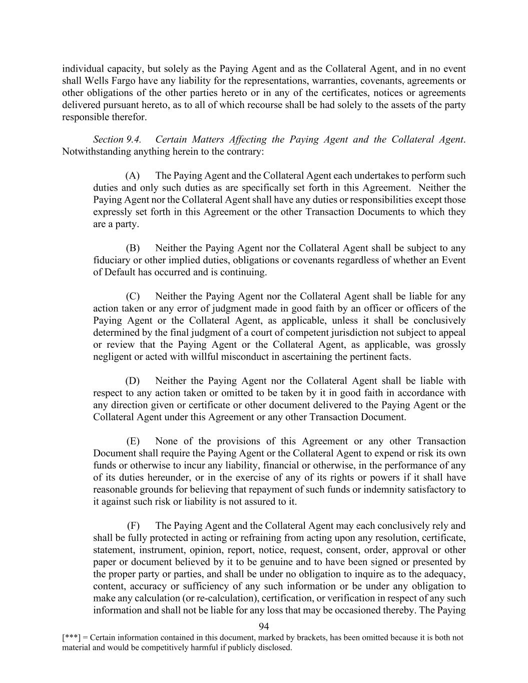 94 [***] = Certain information contained in this document, marked by brackets, has been omitted because it is both not material and would be competitively harmful if publicly disclosed. individual capacity, but solely as the Paying Agent and as the Collateral Agent, and in no event shall Wells Fargo have any liability for the representations, warranties, covenants, agreements or other obligations of the other parties hereto or in any of the certificates, notices or agreements delivered pursuant hereto, as to all of which recourse shall be had solely to the assets of the party responsible therefor. Section 9.4. Certain Matters Affecting the Paying Agent and the Collateral Agent. Notwithstanding anything herein to the contrary: (A) The Paying Agent and the Collateral Agent each undertakes to perform such duties and only such duties as are specifically set forth in this Agreement. Neither the Paying Agent nor the Collateral Agent shall have any duties or responsibilities except those expressly set forth in this Agreement or the other Transaction Documents to which they are a party. (B) Neither the Paying Agent nor the Collateral Agent shall be subject to any fiduciary or other implied duties, obligations or covenants regardless of whether an Event of Default has occurred and is continuing. (C) Neither the Paying Agent nor the Collateral Agent shall be liable for any action taken or any error of judgment made in good faith by an officer or officers of the Paying Agent or the Collateral Agent, as applicable, unless it shall be conclusively determined by the final judgment of a court of competent jurisdiction not subject to appeal or review that the Paying Agent or the Collateral Agent, as applicable, was grossly negligent or acted with willful misconduct in ascertaining the pertinent facts. (D) Neither the Paying Agent nor the Collateral Agent shall be liable with respect to any action taken or omitted to be taken by it in good faith in accordance with any direction given or certificate or other document delivered to the Paying Agent or the Collateral Agent under this Agreement or any other Transaction Document. (E) None of the provisions of this Agreement or any other Transaction Document shall require the Paying Agent or the Collateral Agent to expend or risk its own funds or otherwise to incur any liability, financial or otherwise, in the performance of any of its duties hereunder, or in the exercise of any of its rights or powers if it shall have reasonable grounds for believing that repayment of such funds or indemnity satisfactory to it against such risk or liability is not assured to it. (F) The Paying Agent and the Collateral Agent may each conclusively rely and shall be fully protected in acting or refraining from acting upon any resolution, certificate, statement, instrument, opinion, report, notice, request, consent, order, approval or other paper or document believed by it to be genuine and to have been signed or presented by the proper party or parties, and shall be under no obligation to inquire as to the adequacy, content, accuracy or sufficiency of any such information or be under any obligation to make any calculation (or re-calculation), certification, or verification in respect of any such information and shall not be liable for any loss that may be occasioned thereby. The Paying