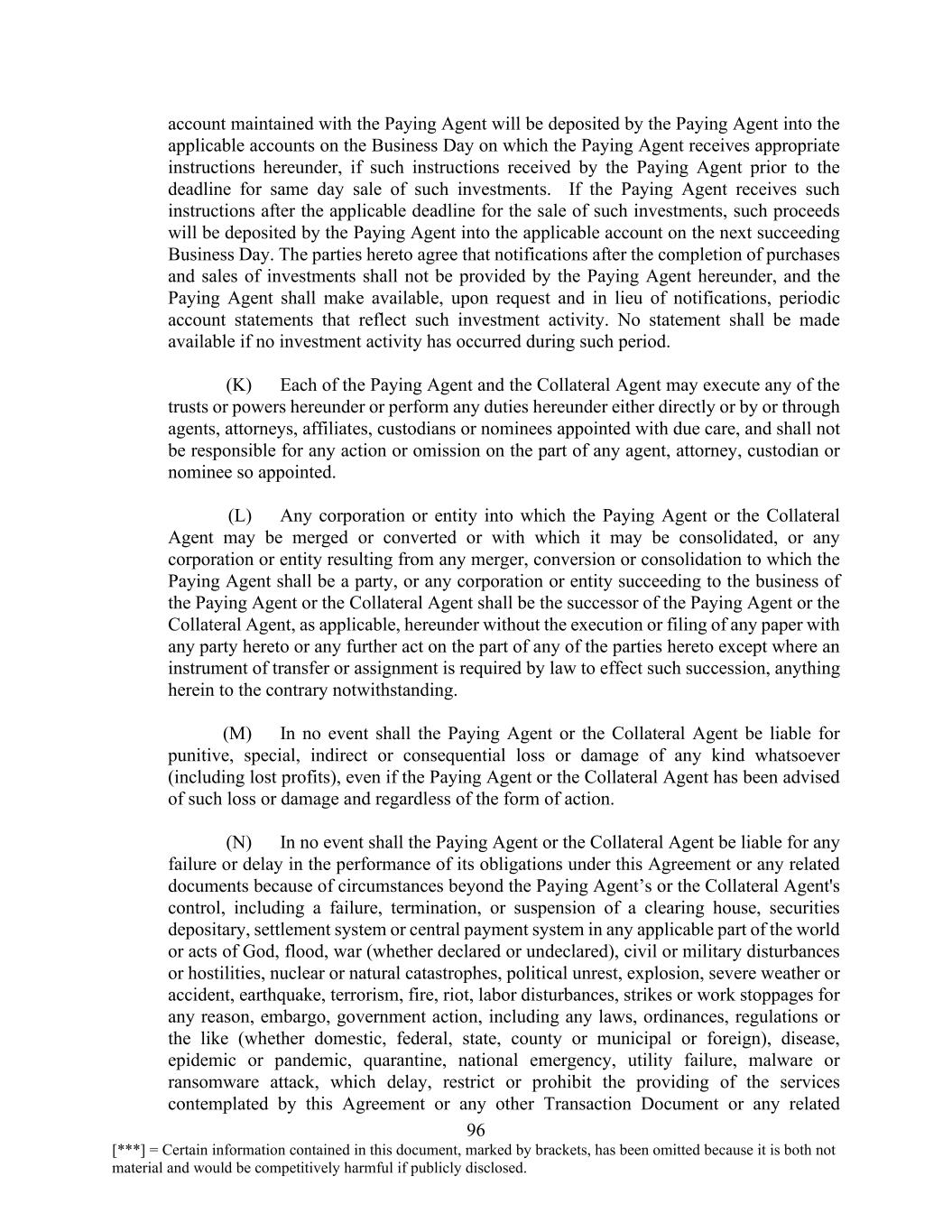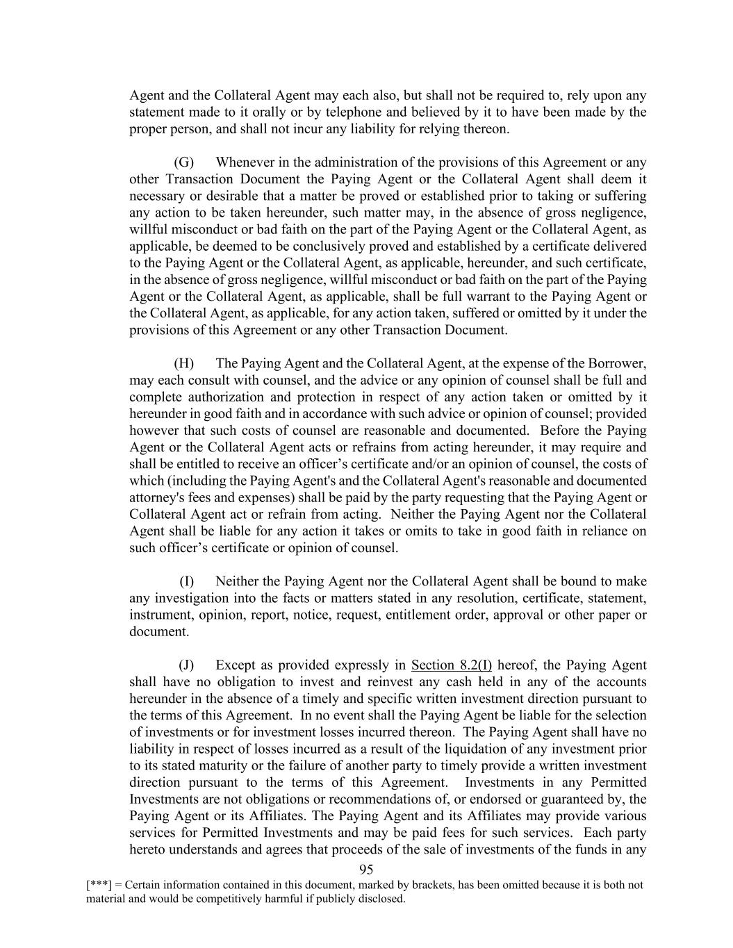 95 [***] = Certain information contained in this document, marked by brackets, has been omitted because it is both not material and would be competitively harmful if publicly disclosed. Agent and the Collateral Agent may each also, but shall not be required to, rely upon any statement made to it orally or by telephone and believed by it to have been made by the proper person, and shall not incur any liability for relying thereon. (G) Whenever in the administration of the provisions of this Agreement or any other Transaction Document the Paying Agent or the Collateral Agent shall deem it necessary or desirable that a matter be proved or established prior to taking or suffering any action to be taken hereunder, such matter may, in the absence of gross negligence, willful misconduct or bad faith on the part of the Paying Agent or the Collateral Agent, as applicable, be deemed to be conclusively proved and established by a certificate delivered to the Paying Agent or the Collateral Agent, as applicable, hereunder, and such certificate, in the absence of gross negligence, willful misconduct or bad faith on the part of the Paying Agent or the Collateral Agent, as applicable, shall be full warrant to the Paying Agent or the Collateral Agent, as applicable, for any action taken, suffered or omitted by it under the provisions of this Agreement or any other Transaction Document. (H) The Paying Agent and the Collateral Agent, at the expense of the Borrower, may each consult with counsel, and the advice or any opinion of counsel shall be full and complete authorization and protection in respect of any action taken or omitted by it hereunder in good faith and in accordance with such advice or opinion of counsel; provided however that such costs of counsel are reasonable and documented. Before the Paying Agent or the Collateral Agent acts or refrains from acting hereunder, it may require and shall be entitled to receive an officer’s certificate and/or an opinion of counsel, the costs of which (including the Paying Agent's and the Collateral Agent's reasonable and documented attorney's fees and expenses) shall be paid by the party requesting that the Paying Agent or Collateral Agent act or refrain from acting. Neither the Paying Agent nor the Collateral Agent shall be liable for any action it takes or omits to take in good faith in reliance on such officer’s certificate or opinion of counsel. (I) Neither the Paying Agent nor the Collateral Agent shall be bound to make any investigation into the facts or matters stated in any resolution, certificate, statement, instrument, opinion, report, notice, request, entitlement order, approval or other paper or document. (J) Except as provided expressly in Section 8.2(I) hereof, the Paying Agent shall have no obligation to invest and reinvest any cash held in any of the accounts hereunder in the absence of a timely and specific written investment direction pursuant to the terms of this Agreement. In no event shall the Paying Agent be liable for the selection of investments or for investment losses incurred thereon. The Paying Agent shall have no liability in respect of losses incurred as a result of the liquidation of any investment prior to its stated maturity or the failure of another party to timely provide a written investment direction pursuant to the terms of this Agreement. Investments in any Permitted Investments are not obligations or recommendations of, or endorsed or guaranteed by, the Paying Agent or its Affiliates. The Paying Agent and its Affiliates may provide various services for Permitted Investments and may be paid fees for such services. Each party hereto understands and agrees that proceeds of the sale of investments of the funds in any