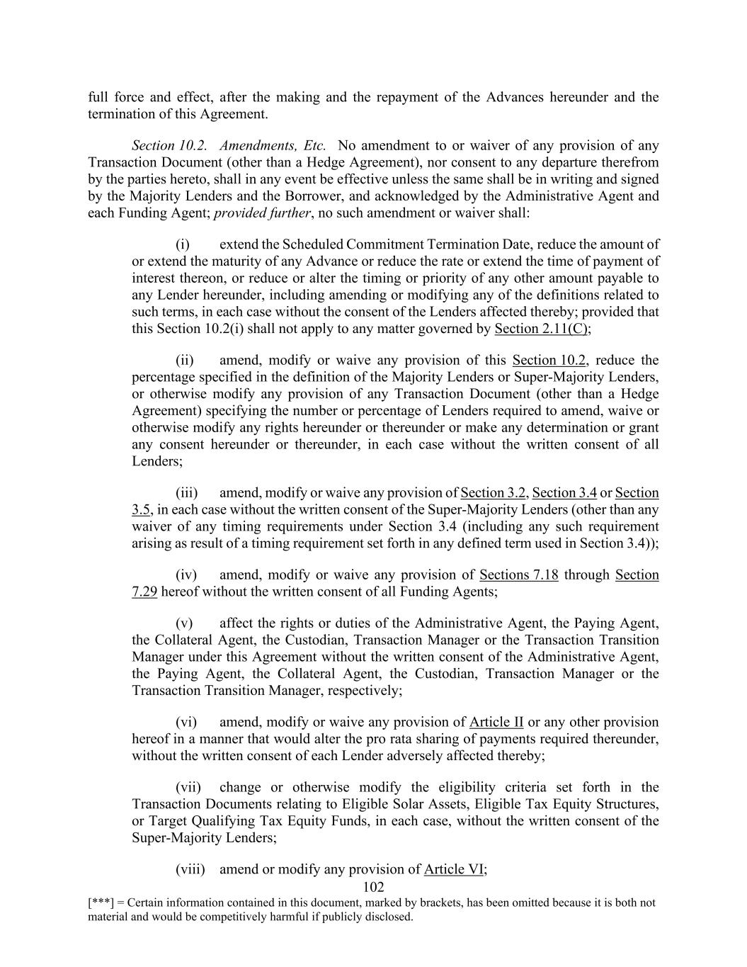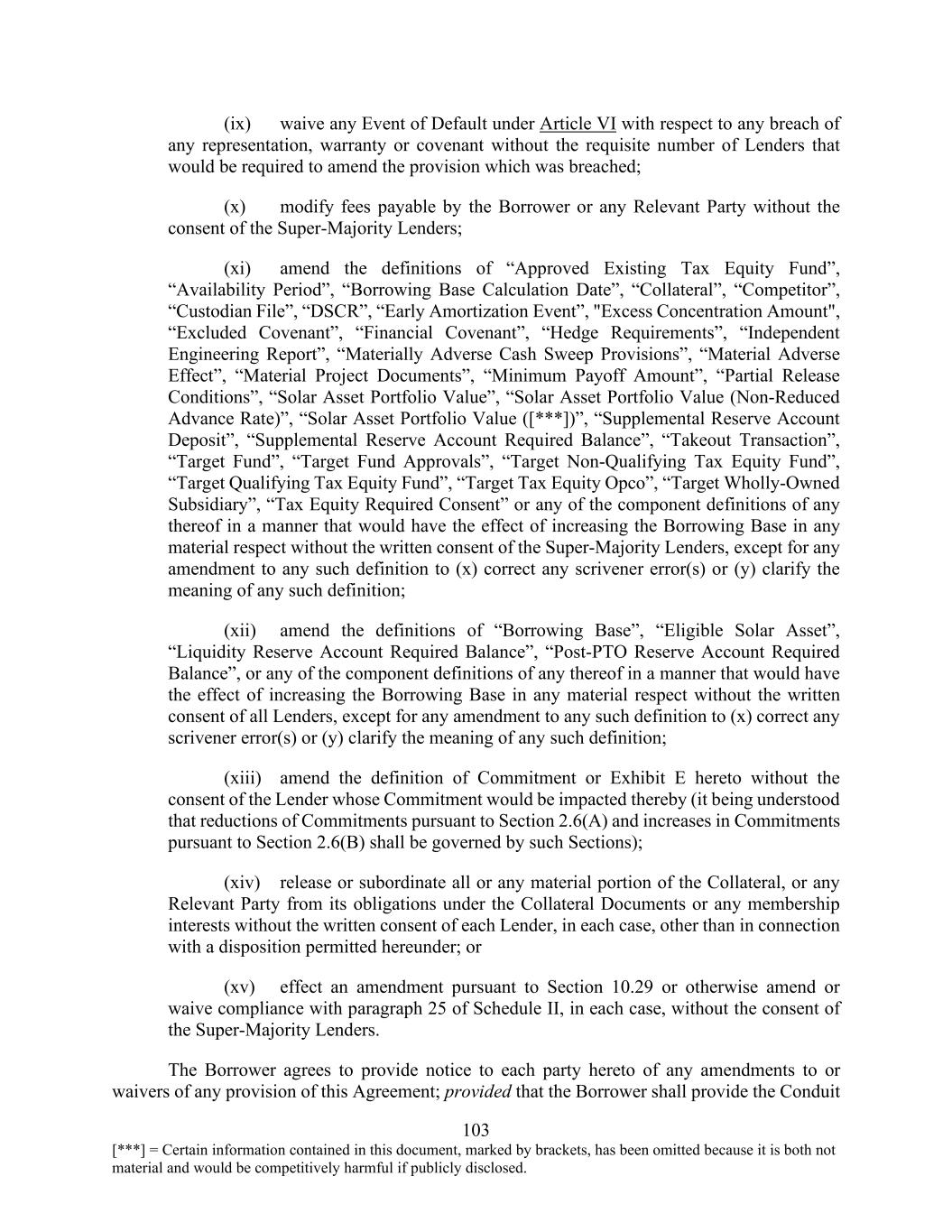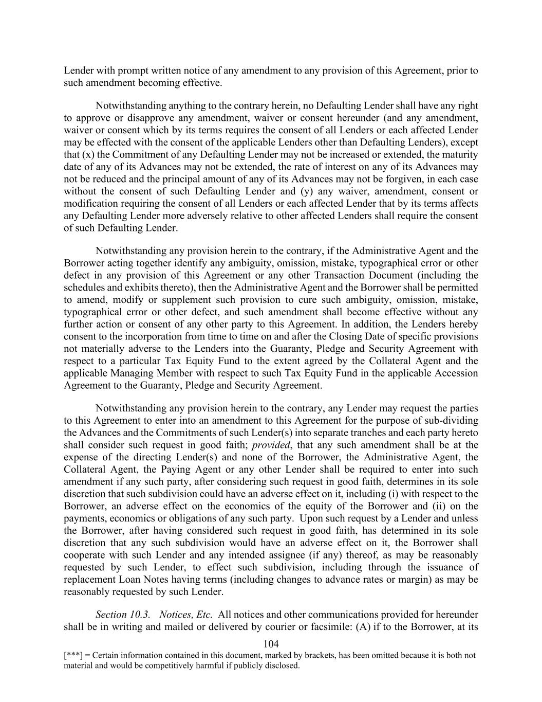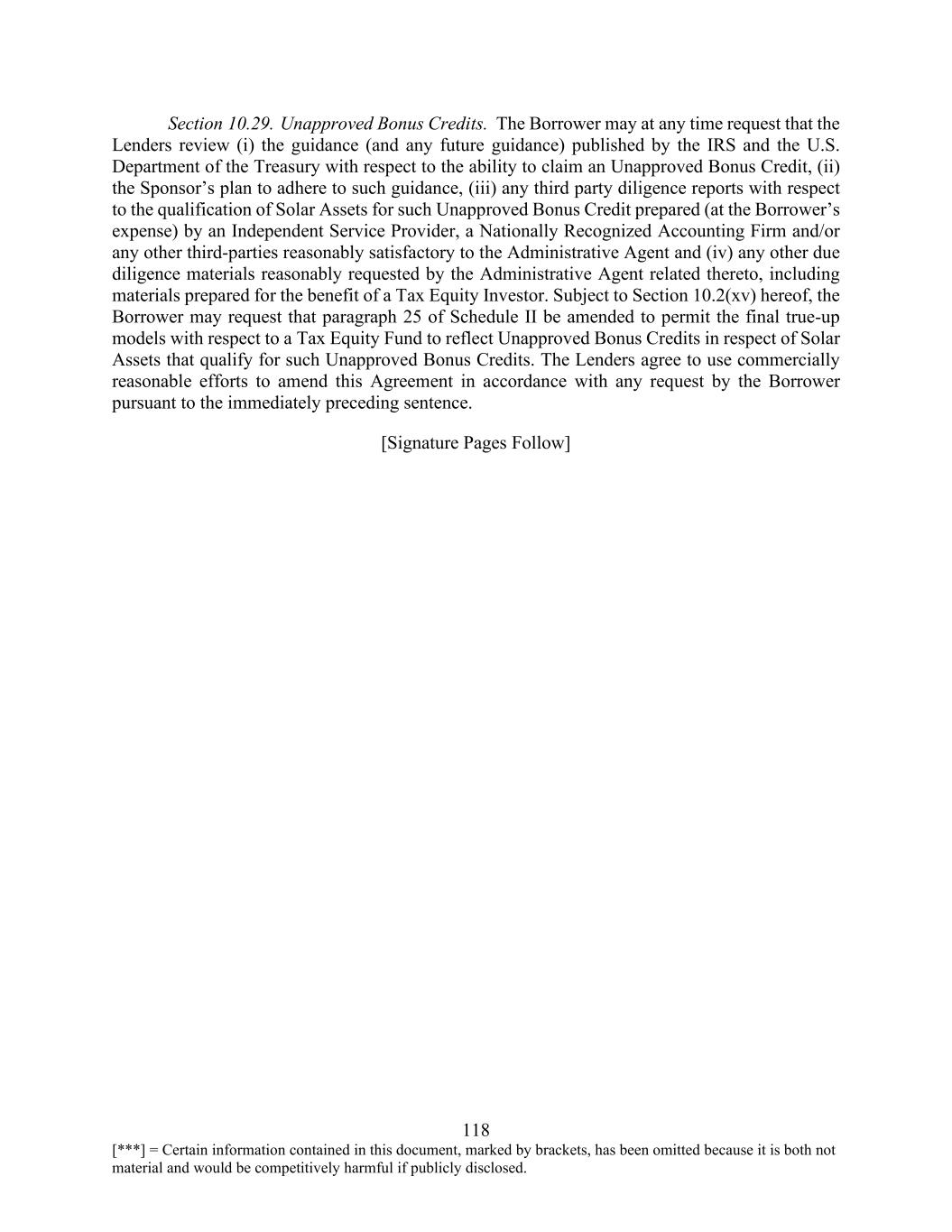 118 [***] = Certain information contained in this document, marked by brackets, has been omitted because it is both not material and would be competitively harmful if publicly disclosed. Section 10.29. Unapproved Bonus Credits. The Borrower may at any time request that the Lenders review (i) the guidance (and any future guidance) published by the IRS and the U.S. Department of the Treasury with respect to the ability to claim an Unapproved Bonus Credit, (ii) the Sponsor’s plan to adhere to such guidance, (iii) any third party diligence reports with respect to the qualification of Solar Assets for such Unapproved Bonus Credit prepared (at the Borrower’s expense) by an Independent Service Provider, a Nationally Recognized Accounting Firm and/or any other third-parties reasonably satisfactory to the Administrative Agent and (iv) any other due diligence materials reasonably requested by the Administrative Agent related thereto, including materials prepared for the benefit of a Tax Equity Investor. Subject to Section 10.2(xv) hereof, the Borrower may request that paragraph 25 of Schedule II be amended to permit the final true-up models with respect to a Tax Equity Fund to reflect Unapproved Bonus Credits in respect of Solar Assets that qualify for such Unapproved Bonus Credits. The Lenders agree to use commercially reasonable efforts to amend this Agreement in accordance with any request by the Borrower pursuant to the immediately preceding sentence. [Signature Pages Follow]