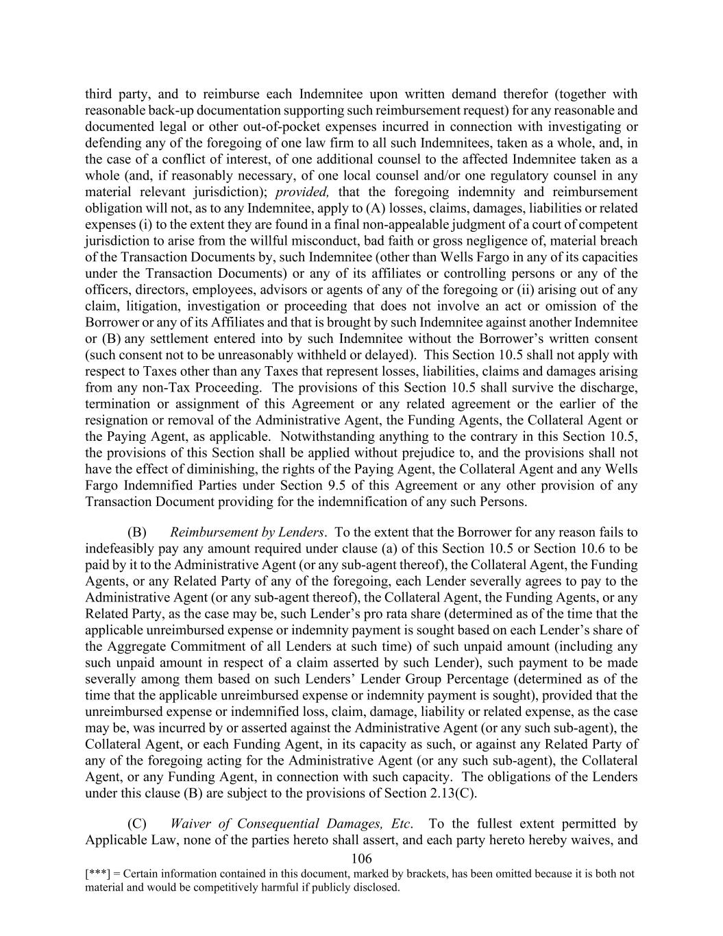 22 [***] = Certain information contained in this document, marked by brackets, has been omitted because it is both not material and would be competitively harmful if publicly disclosed. for any Taxes, except as required by applicable Law. If any applicable Law (as determined in the good faith discretion the Withholding Agent) requires the deduction or withholding of any Tax from any such payment by the Withholding Agent, then the Withholding Agent shall be entitled to make such deduction or withholding and shall timely pay the full amount deducted or withheld to the relevant Governmental Authority in accordance with applicable Law and, if such Tax is an Indemnified Tax, then the sum payable by the Borrower shall be increased as necessary so that after such deduction or withholding has been made (including such deductions and withholdings applicable to additional sums payable under this Section) the applicable Recipient receives an amount equal to the sum it would have received had no such deduction or withholding been made. (C) Payment of Other Taxes by the Borrower. The Borrower shall timely pay to the relevant Governmental Authority in accordance with applicable Law, or at the option of a Funding Agent timely reimburse it for the payment of, any Other Taxes. (D) Indemnification by the Borrower. The Borrower shall indemnify each Recipient, within ten (10) days after demand therefor, for the full amount of any Indemnified Taxes (including Indemnified Taxes imposed or asserted on or attributable to amounts payable under this Section) payable or paid by such Recipient or required to be withheld or deducted from a payment to such Recipient and any reasonable expenses arising therefrom or with respect thereto, whether or not such Indemnified Taxes were correctly or legally imposed or asserted by the relevant Governmental Authority. A certificate as to the amount of such payment or liability delivered to the Borrower by a Recipient (with a copy to each Funding Agent), or by a Funding Agent on its own behalf or on behalf of a Recipient, shall be conclusive absent manifest error. (E) Indemnification by the Lenders. Each Committed Lender shall severally indemnify the Administrative Agent and each Funding Agent, within ten (10) days after demand therefor, for (i) any Indemnified Taxes attributable to such Committed Lender’s Lender Group (but only to the extent that the Borrower has not already indemnified such Administrative Agent or Funding Agent for such Indemnified Taxes and without limiting the obligation of the Borrower to do so), (ii) any Taxes attributable to the failure of such Committed Lender’s Lender Group to comply with the provisions of Section 10.8(D), and (iii) any Excluded Taxes attributable to such Committed Lender’s Lender Group, in each case, that are payable or paid by the Administrative Agent or a Funding Agent in connection with any Transaction Document, and any reasonable expenses arising therefrom or with respect thereto, whether or not such Taxes were correctly or legally imposed or asserted by the relevant Governmental Authority. A certificate as to the amount of such payment or liability delivered to any Committed Lender by its Funding Agent or the Administrative Agent shall be conclusive absent manifest error. Each Committed Lender hereby authorizes its Funding Agent to set off and apply any and all amounts at any time owing to such Committed Lender or its Lender Group under any Transaction Document or otherwise payable by such Funding Agent to the Committed Lender or its Lender Group from any other source against any amount due to such Funding Agent under this paragraph (E). (F) Evidence of Payments. As soon as practicable after any payment of Taxes by the Borrower to a Governmental Authority pursuant to this Section 2.17, the Borrower shall deliver to each Funding Agent the original or a certified copy of a receipt issued by such Governmental Authority evidencing such payment, a copy of the return reporting such payment or other evidence of such payment reasonably satisfactory to such Funding Agent.