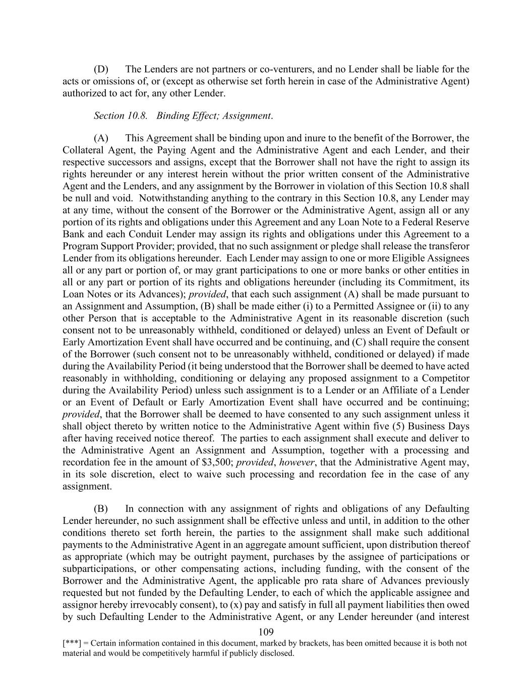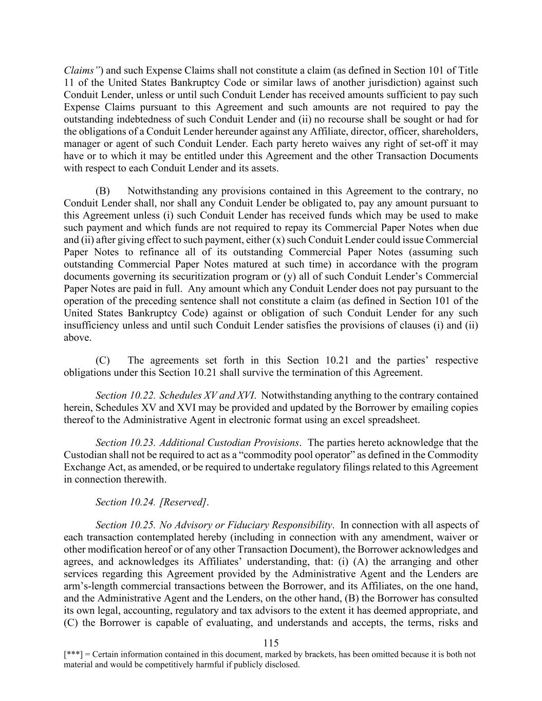 115 [***] = Certain information contained in this document, marked by brackets, has been omitted because it is both not material and would be competitively harmful if publicly disclosed. Claims”) and such Expense Claims shall not constitute a claim (as defined in Section 101 of Title 11 of the United States Bankruptcy Code or similar laws of another jurisdiction) against such Conduit Lender, unless or until such Conduit Lender has received amounts sufficient to pay such Expense Claims pursuant to this Agreement and such amounts are not required to pay the outstanding indebtedness of such Conduit Lender and (ii) no recourse shall be sought or had for the obligations of a Conduit Lender hereunder against any Affiliate, director, officer, shareholders, manager or agent of such Conduit Lender. Each party hereto waives any right of set-off it may have or to which it may be entitled under this Agreement and the other Transaction Documents with respect to each Conduit Lender and its assets. (B) Notwithstanding any provisions contained in this Agreement to the contrary, no Conduit Lender shall, nor shall any Conduit Lender be obligated to, pay any amount pursuant to this Agreement unless (i) such Conduit Lender has received funds which may be used to make such payment and which funds are not required to repay its Commercial Paper Notes when due and (ii) after giving effect to such payment, either (x) such Conduit Lender could issue Commercial Paper Notes to refinance all of its outstanding Commercial Paper Notes (assuming such outstanding Commercial Paper Notes matured at such time) in accordance with the program documents governing its securitization program or (y) all of such Conduit Lender’s Commercial Paper Notes are paid in full. Any amount which any Conduit Lender does not pay pursuant to the operation of the preceding sentence shall not constitute a claim (as defined in Section 101 of the United States Bankruptcy Code) against or obligation of such Conduit Lender for any such insufficiency unless and until such Conduit Lender satisfies the provisions of clauses (i) and (ii) above. (C) The agreements set forth in this Section 10.21 and the parties’ respective obligations under this Section 10.21 shall survive the termination of this Agreement. Section 10.22. Schedules XV and XVI. Notwithstanding anything to the contrary contained herein, Schedules XV and XVI may be provided and updated by the Borrower by emailing copies thereof to the Administrative Agent in electronic format using an excel spreadsheet. Section 10.23. Additional Custodian Provisions. The parties hereto acknowledge that the Custodian shall not be required to act as a “commodity pool operator” as defined in the Commodity Exchange Act, as amended, or be required to undertake regulatory filings related to this Agreement in connection therewith. Section 10.24. [Reserved]. Section 10.25. No Advisory or Fiduciary Responsibility. In connection with all aspects of each transaction contemplated hereby (including in connection with any amendment, waiver or other modification hereof or of any other Transaction Document), the Borrower acknowledges and agrees, and acknowledges its Affiliates’ understanding, that: (i) (A) the arranging and other services regarding this Agreement provided by the Administrative Agent and the Lenders are arm’s-length commercial transactions between the Borrower, and its Affiliates, on the one hand, and the Administrative Agent and the Lenders, on the other hand, (B) the Borrower has consulted its own legal, accounting, regulatory and tax advisors to the extent it has deemed appropriate, and (C) the Borrower is capable of evaluating, and understands and accepts, the terms, risks and