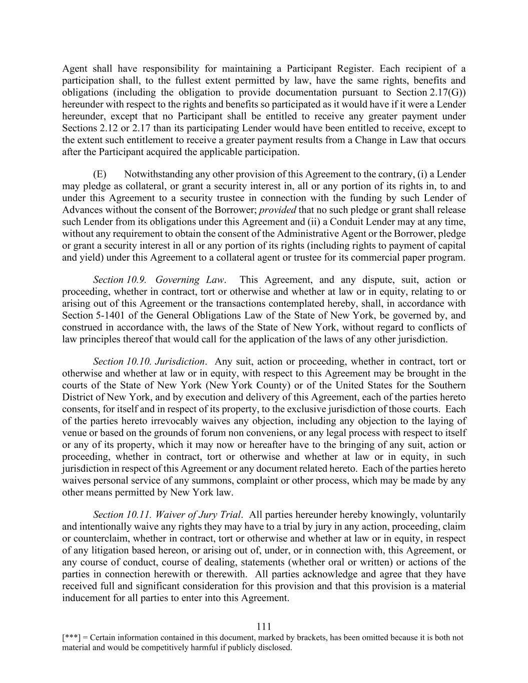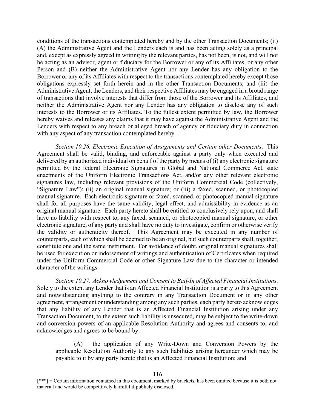 116 [***] = Certain information contained in this document, marked by brackets, has been omitted because it is both not material and would be competitively harmful if publicly disclosed. conditions of the transactions contemplated hereby and by the other Transaction Documents; (ii) (A) the Administrative Agent and the Lenders each is and has been acting solely as a principal and, except as expressly agreed in writing by the relevant parties, has not been, is not, and will not be acting as an advisor, agent or fiduciary for the Borrower or any of its Affiliates, or any other Person and (B) neither the Administrative Agent nor any Lender has any obligation to the Borrower or any of its Affiliates with respect to the transactions contemplated hereby except those obligations expressly set forth herein and in the other Transaction Documents; and (iii) the Administrative Agent, the Lenders, and their respective Affiliates may be engaged in a broad range of transactions that involve interests that differ from those of the Borrower and its Affiliates, and neither the Administrative Agent nor any Lender has any obligation to disclose any of such interests to the Borrower or its Affiliates. To the fullest extent permitted by law, the Borrower hereby waives and releases any claims that it may have against the Administrative Agent and the Lenders with respect to any breach or alleged breach of agency or fiduciary duty in connection with any aspect of any transaction contemplated hereby. Section 10.26. Electronic Execution of Assignments and Certain other Documents. This Agreement shall be valid, binding, and enforceable against a party only when executed and delivered by an authorized individual on behalf of the party by means of (i) any electronic signature permitted by the federal Electronic Signatures in Global and National Commerce Act, state enactments of the Uniform Electronic Transactions Act, and/or any other relevant electronic signatures law, including relevant provisions of the Uniform Commercial Code (collectively, “Signature Law”); (ii) an original manual signature; or (iii) a faxed, scanned, or photocopied manual signature. Each electronic signature or faxed, scanned, or photocopied manual signature shall for all purposes have the same validity, legal effect, and admissibility in evidence as an original manual signature. Each party hereto shall be entitled to conclusively rely upon, and shall have no liability with respect to, any faxed, scanned, or photocopied manual signature, or other electronic signature, of any party and shall have no duty to investigate, confirm or otherwise verify the validity or authenticity thereof. This Agreement may be executed in any number of counterparts, each of which shall be deemed to be an original, but such counterparts shall, together, constitute one and the same instrument. For avoidance of doubt, original manual signatures shall be used for execution or indorsement of writings and authentication of Certificates when required under the Uniform Commercial Code or other Signature Law due to the character or intended character of the writings. Section 10.27. Acknowledgement and Consent to Bail-In of Affected Financial Institutions. Solely to the extent any Lender that is an Affected Financial Institution is a party to this Agreement and notwithstanding anything to the contrary in any Transaction Document or in any other agreement, arrangement or understanding among any such parties, each party hereto acknowledges that any liability of any Lender that is an Affected Financial Institution arising under any Transaction Document, to the extent such liability is unsecured, may be subject to the write-down and conversion powers of an applicable Resolution Authority and agrees and consents to, and acknowledges and agrees to be bound by: (A) the application of any Write-Down and Conversion Powers by the applicable Resolution Authority to any such liabilities arising hereunder which may be payable to it by any party hereto that is an Affected Financial Institution; and
