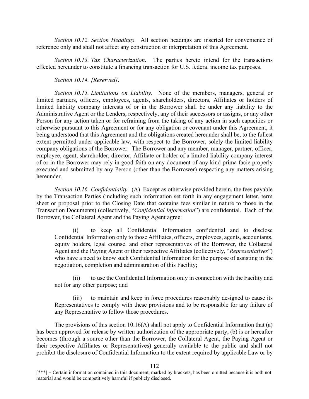112 [***] = Certain information contained in this document, marked by brackets, has been omitted because it is both not material and would be competitively harmful if publicly disclosed. Section 10.12. Section Headings. All section headings are inserted for convenience of reference only and shall not affect any construction or interpretation of this Agreement. Section 10.13. Tax Characterization. The parties hereto intend for the transactions effected hereunder to constitute a financing transaction for U.S. federal income tax purposes. Section 10.14. [Reserved]. Section 10.15. Limitations on Liability. None of the members, managers, general or limited partners, officers, employees, agents, shareholders, directors, Affiliates or holders of limited liability company interests of or in the Borrower shall be under any liability to the Administrative Agent or the Lenders, respectively, any of their successors or assigns, or any other Person for any action taken or for refraining from the taking of any action in such capacities or otherwise pursuant to this Agreement or for any obligation or covenant under this Agreement, it being understood that this Agreement and the obligations created hereunder shall be, to the fullest extent permitted under applicable law, with respect to the Borrower, solely the limited liability company obligations of the Borrower. The Borrower and any member, manager, partner, officer, employee, agent, shareholder, director, Affiliate or holder of a limited liability company interest of or in the Borrower may rely in good faith on any document of any kind prima facie properly executed and submitted by any Person (other than the Borrower) respecting any matters arising hereunder. Section 10.16. Confidentiality. (A) Except as otherwise provided herein, the fees payable by the Transaction Parties (including such information set forth in any engagement letter, term sheet or proposal prior to the Closing Date that contains fees similar in nature to those in the Transaction Documents) (collectively, “Confidential Information”) are confidential. Each of the Borrower, the Collateral Agent and the Paying Agent agree: (i) to keep all Confidential Information confidential and to disclose Confidential Information only to those Affiliates, officers, employees, agents, accountants, equity holders, legal counsel and other representatives of the Borrower, the Collateral Agent and the Paying Agent or their respective Affiliates (collectively, “Representatives”) who have a need to know such Confidential Information for the purpose of assisting in the negotiation, completion and administration of this Facility; (ii) to use the Confidential Information only in connection with the Facility and not for any other purpose; and (iii) to maintain and keep in force procedures reasonably designed to cause its Representatives to comply with these provisions and to be responsible for any failure of any Representative to follow those procedures. The provisions of this section 10.16(A) shall not apply to Confidential Information that (a) has been approved for release by written authorization of the appropriate party, (b) is or hereafter becomes (through a source other than the Borrower, the Collateral Agent, the Paying Agent or their respective Affiliates or Representatives) generally available to the public and shall not prohibit the disclosure of Confidential Information to the extent required by applicable Law or by