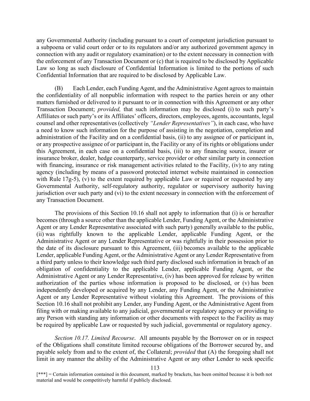 113 [***] = Certain information contained in this document, marked by brackets, has been omitted because it is both not material and would be competitively harmful if publicly disclosed. any Governmental Authority (including pursuant to a court of competent jurisdiction pursuant to a subpoena or valid court order or to its regulators and/or any authorized government agency in connection with any audit or regulatory examination) or to the extent necessary in connection with the enforcement of any Transaction Document or (c) that is required to be disclosed by Applicable Law so long as such disclosure of Confidential Information is limited to the portions of such Confidential Information that are required to be disclosed by Applicable Law. (B) Each Lender, each Funding Agent, and the Administrative Agent agrees to maintain the confidentiality of all nonpublic information with respect to the parties herein or any other matters furnished or delivered to it pursuant to or in connection with this Agreement or any other Transaction Document; provided, that such information may be disclosed (i) to such party’s Affiliates or such party’s or its Affiliates’ officers, directors, employees, agents, accountants, legal counsel and other representatives (collectively “Lender Representatives”), in each case, who have a need to know such information for the purpose of assisting in the negotiation, completion and administration of the Facility and on a confidential basis, (ii) to any assignee of or participant in, or any prospective assignee of or participant in, the Facility or any of its rights or obligations under this Agreement, in each case on a confidential basis, (iii) to any financing source, insurer or insurance broker, dealer, hedge counterparty, service provider or other similar party in connection with financing, insurance or risk management activities related to the Facility, (iv) to any rating agency (including by means of a password protected internet website maintained in connection with Rule 17g-5), (v) to the extent required by applicable Law or required or requested by any Governmental Authority, self-regulatory authority, regulator or supervisory authority having jurisdiction over such party and (vi) to the extent necessary in connection with the enforcement of any Transaction Document. The provisions of this Section 10.16 shall not apply to information that (i) is or hereafter becomes (through a source other than the applicable Lender, Funding Agent, or the Administrative Agent or any Lender Representative associated with such party) generally available to the public, (ii) was rightfully known to the applicable Lender, applicable Funding Agent, or the Administrative Agent or any Lender Representative or was rightfully in their possession prior to the date of its disclosure pursuant to this Agreement, (iii) becomes available to the applicable Lender, applicable Funding Agent, or the Administrative Agent or any Lender Representative from a third party unless to their knowledge such third party disclosed such information in breach of an obligation of confidentiality to the applicable Lender, applicable Funding Agent, or the Administrative Agent or any Lender Representative, (iv) has been approved for release by written authorization of the parties whose information is proposed to be disclosed, or (v) has been independently developed or acquired by any Lender, any Funding Agent, or the Administrative Agent or any Lender Representative without violating this Agreement. The provisions of this Section 10.16 shall not prohibit any Lender, any Funding Agent, or the Administrative Agent from filing with or making available to any judicial, governmental or regulatory agency or providing to any Person with standing any information or other documents with respect to the Facility as may be required by applicable Law or requested by such judicial, governmental or regulatory agency. Section 10.17. Limited Recourse. All amounts payable by the Borrower on or in respect of the Obligations shall constitute limited recourse obligations of the Borrower secured by, and payable solely from and to the extent of, the Collateral; provided that (A) the foregoing shall not limit in any manner the ability of the Administrative Agent or any other Lender to seek specific