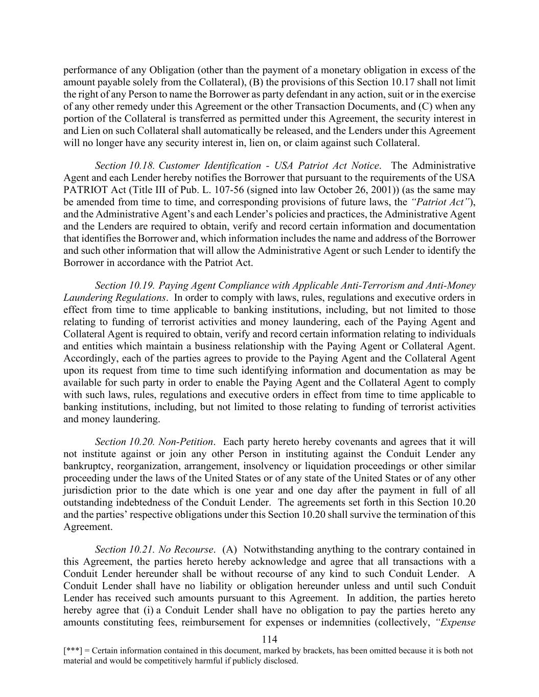 114 [***] = Certain information contained in this document, marked by brackets, has been omitted because it is both not material and would be competitively harmful if publicly disclosed. performance of any Obligation (other than the payment of a monetary obligation in excess of the amount payable solely from the Collateral), (B) the provisions of this Section 10.17 shall not limit the right of any Person to name the Borrower as party defendant in any action, suit or in the exercise of any other remedy under this Agreement or the other Transaction Documents, and (C) when any portion of the Collateral is transferred as permitted under this Agreement, the security interest in and Lien on such Collateral shall automatically be released, and the Lenders under this Agreement will no longer have any security interest in, lien on, or claim against such Collateral. Section 10.18. Customer Identification - USA Patriot Act Notice. The Administrative Agent and each Lender hereby notifies the Borrower that pursuant to the requirements of the USA PATRIOT Act (Title III of Pub. L. 107-56 (signed into law October 26, 2001)) (as the same may be amended from time to time, and corresponding provisions of future laws, the “Patriot Act”), and the Administrative Agent’s and each Lender’s policies and practices, the Administrative Agent and the Lenders are required to obtain, verify and record certain information and documentation that identifies the Borrower and, which information includes the name and address of the Borrower and such other information that will allow the Administrative Agent or such Lender to identify the Borrower in accordance with the Patriot Act. Section 10.19. Paying Agent Compliance with Applicable Anti-Terrorism and Anti-Money Laundering Regulations. In order to comply with laws, rules, regulations and executive orders in effect from time to time applicable to banking institutions, including, but not limited to those relating to funding of terrorist activities and money laundering, each of the Paying Agent and Collateral Agent is required to obtain, verify and record certain information relating to individuals and entities which maintain a business relationship with the Paying Agent or Collateral Agent. Accordingly, each of the parties agrees to provide to the Paying Agent and the Collateral Agent upon its request from time to time such identifying information and documentation as may be available for such party in order to enable the Paying Agent and the Collateral Agent to comply with such laws, rules, regulations and executive orders in effect from time to time applicable to banking institutions, including, but not limited to those relating to funding of terrorist activities and money laundering. Section 10.20. Non-Petition. Each party hereto hereby covenants and agrees that it will not institute against or join any other Person in instituting against the Conduit Lender any bankruptcy, reorganization, arrangement, insolvency or liquidation proceedings or other similar proceeding under the laws of the United States or of any state of the United States or of any other jurisdiction prior to the date which is one year and one day after the payment in full of all outstanding indebtedness of the Conduit Lender. The agreements set forth in this Section 10.20 and the parties’ respective obligations under this Section 10.20 shall survive the termination of this Agreement. Section 10.21. No Recourse. (A) Notwithstanding anything to the contrary contained in this Agreement, the parties hereto hereby acknowledge and agree that all transactions with a Conduit Lender hereunder shall be without recourse of any kind to such Conduit Lender. A Conduit Lender shall have no liability or obligation hereunder unless and until such Conduit Lender has received such amounts pursuant to this Agreement. In addition, the parties hereto hereby agree that (i) a Conduit Lender shall have no obligation to pay the parties hereto any amounts constituting fees, reimbursement for expenses or indemnities (collectively, “Expense